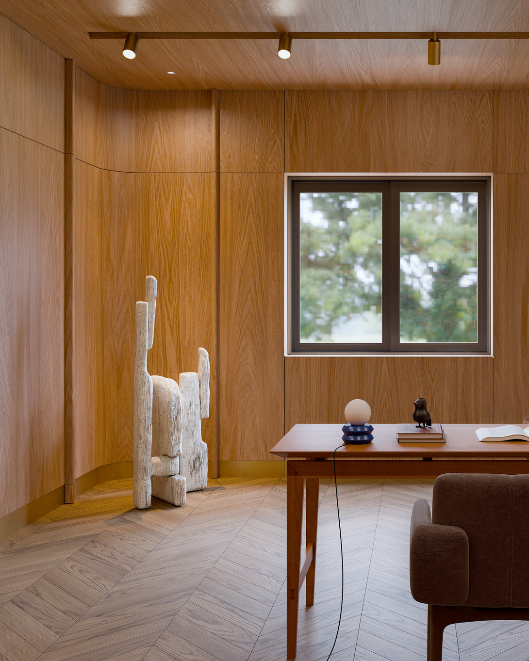 This abstract sculpture features a composition formed by an arrangement of vertical and horizontal carved wood blocks. The material is light-colored wood, with a natural finish that intensely highlights the texture and grain, lending it a rustic and organic character. The shapes are long and angular, yet strategically softened by rounded cuts at the ends, achieving a balance between geometric rigidity and natural fluidity. The artwork has a strong sculptural presence, holding both decorative and conceptual value. It evokes modern minimalism and suggests movement and dynamic interaction between its parts.