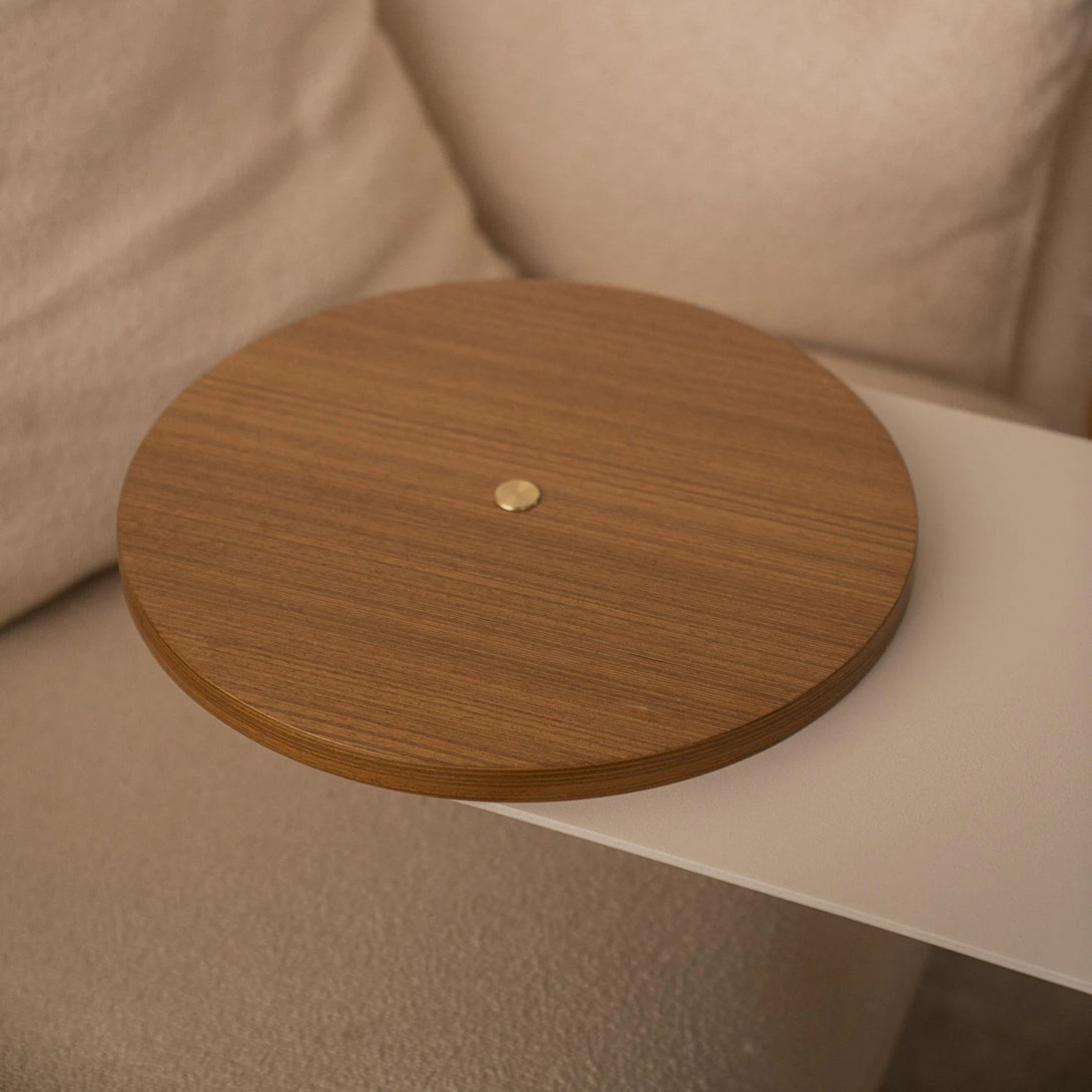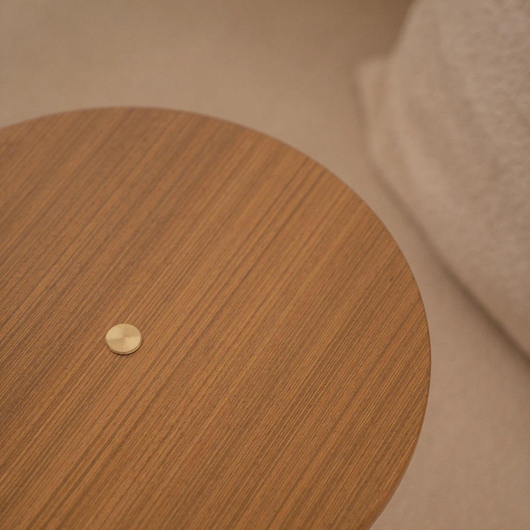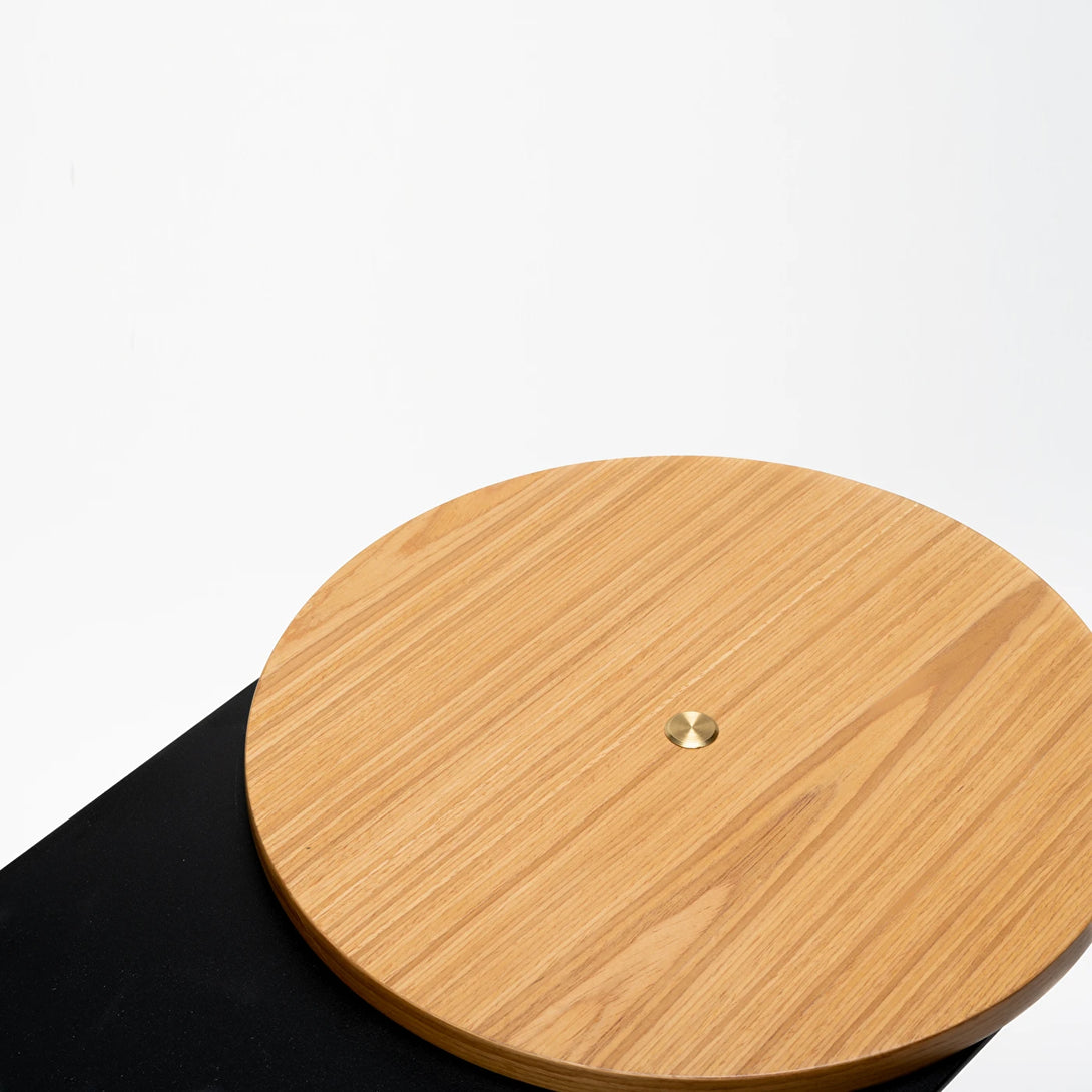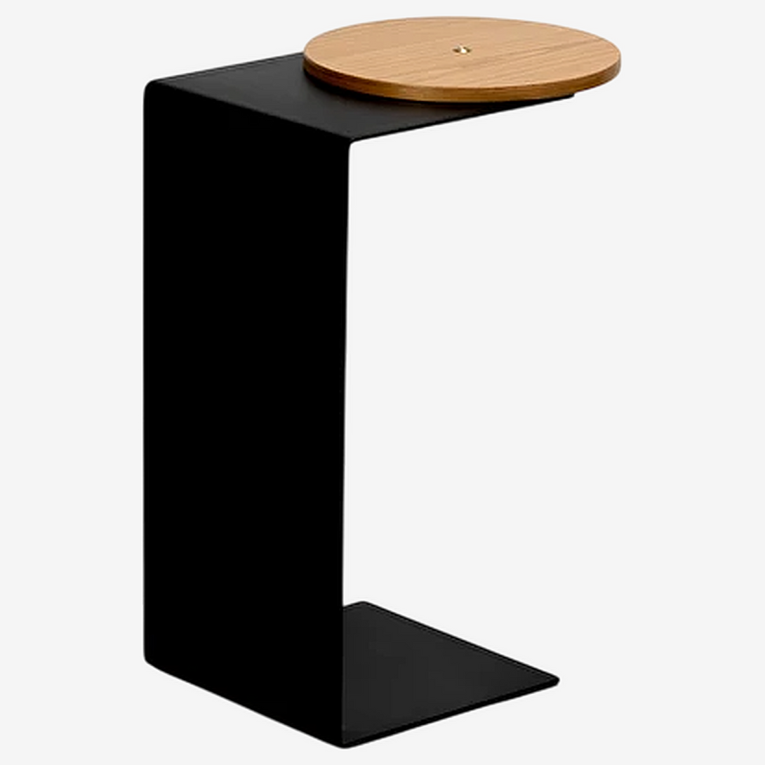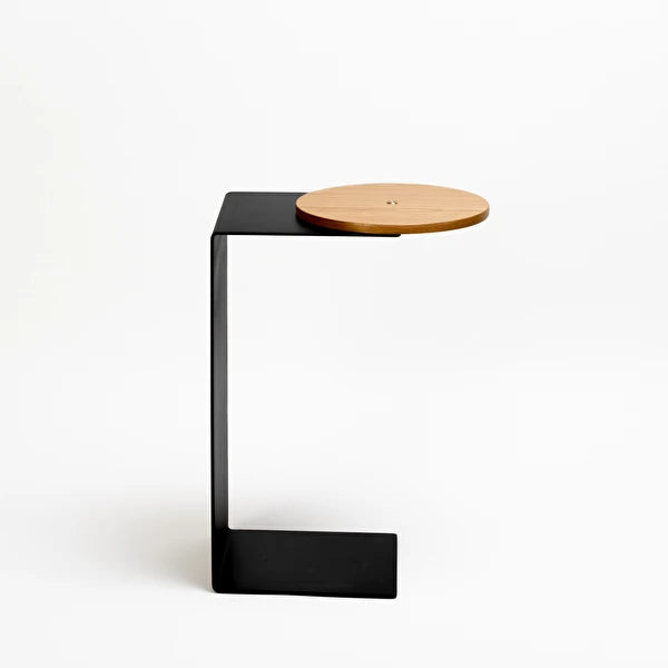 The contrast of elements in this piece highlights each material and its specific role in the composition. The carbon steel structure provides strength and stability to the wooden tabletop, which is secured with a delicate turned brass screw, joining the materials in a harmonious and functional way.