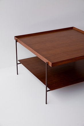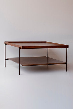 Carbon steel structure, solid wood tabletop, and turned brass screw.