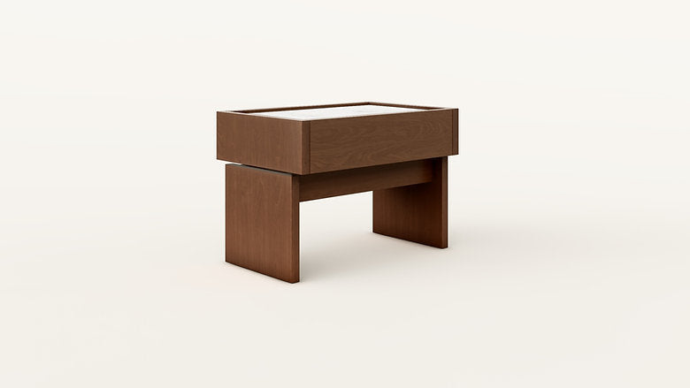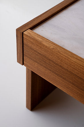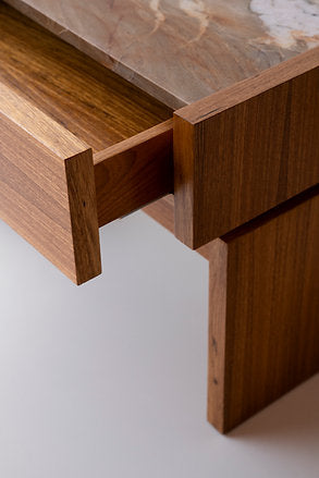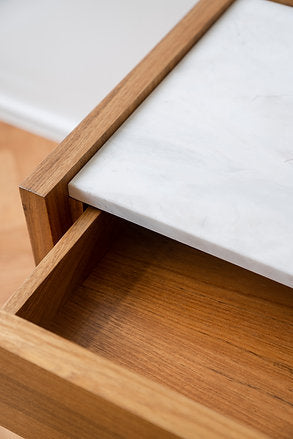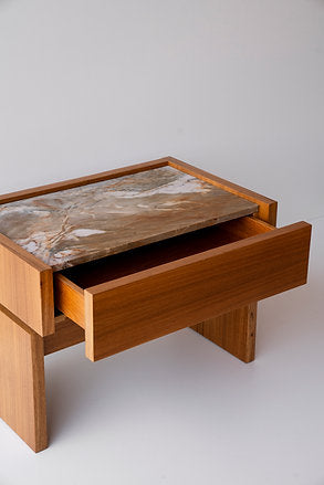 Bedside table with structure, body, and drawer in MDF covered with wood veneer, top in marble or wood, and drawer with concealed Blum soft-close runners.