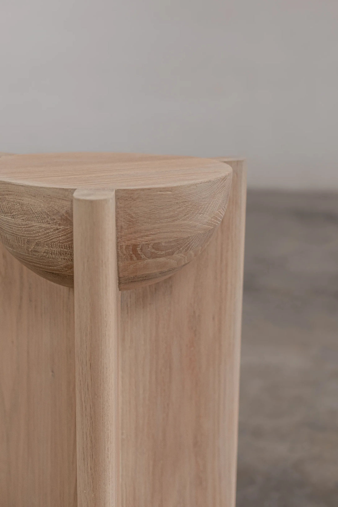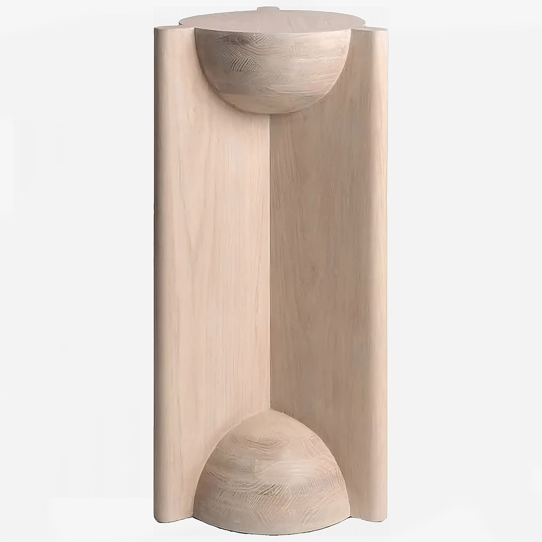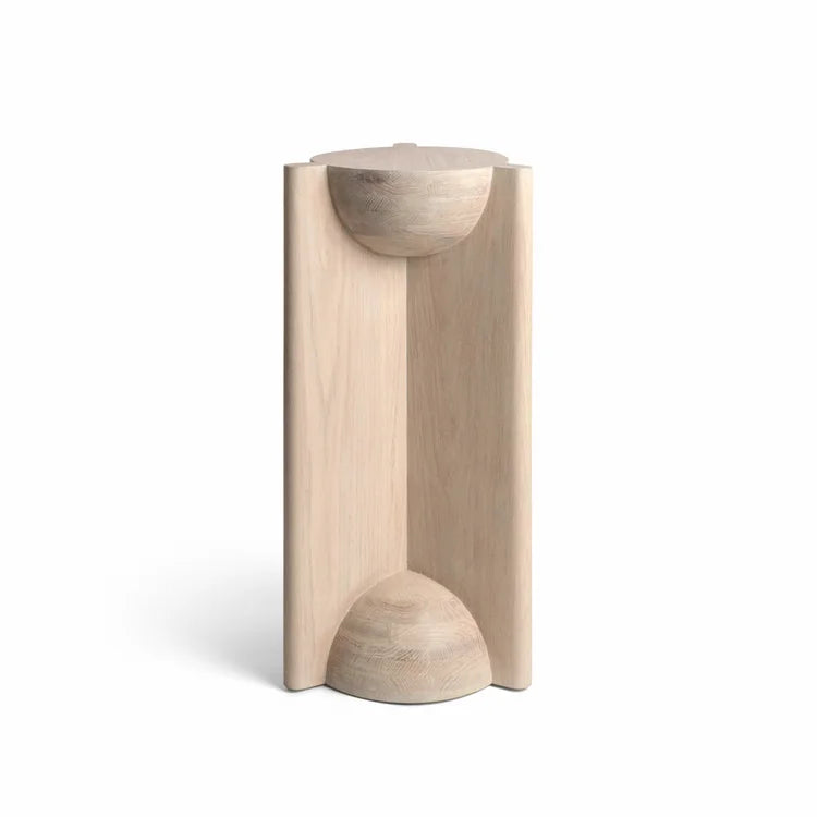 The Bleo Pedestal is a design column that combines solid geometric forms with soft sculptural elements, creating an elegant and contemporary support piece. It is constructed from Red Oak Wood and features a Cream Wash Finish, which provides a light, organic look while enhancing the oak's texture. The main structure is a vertical prism, characterized by a concave quarter-sphere cut-out at the top, which serves as a niche for displaying an object. At the base, a convex hemisphere is fitted into the structure, reinforcing the aesthetic of rounded forms. This juxtaposition of right angles and soft curves gives the Bleo Pedestal an architectural appeal, making it an ideal, elegant display stand.