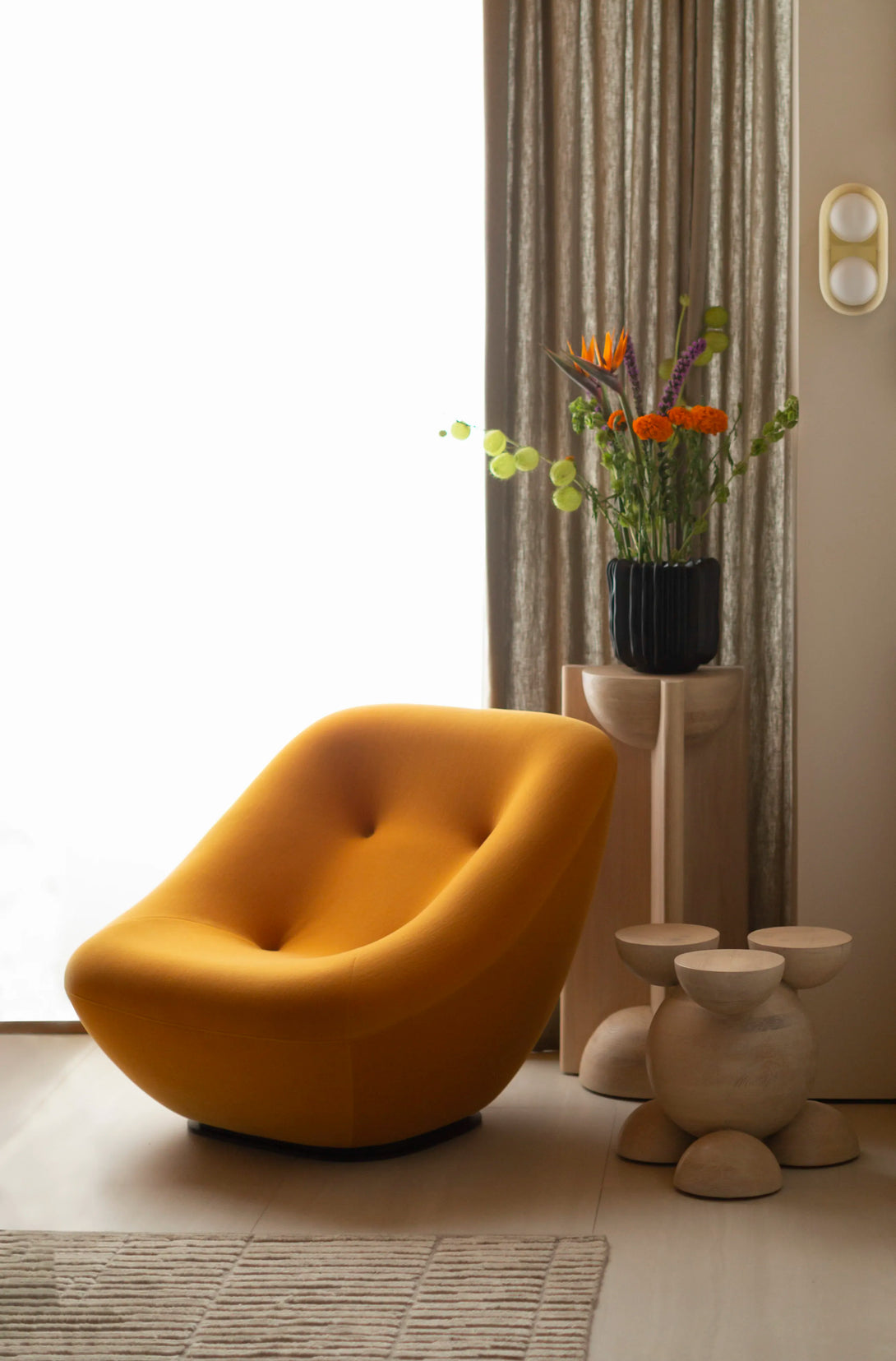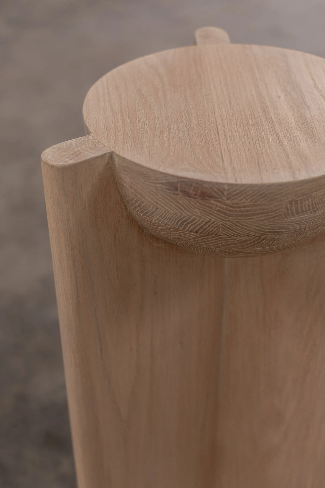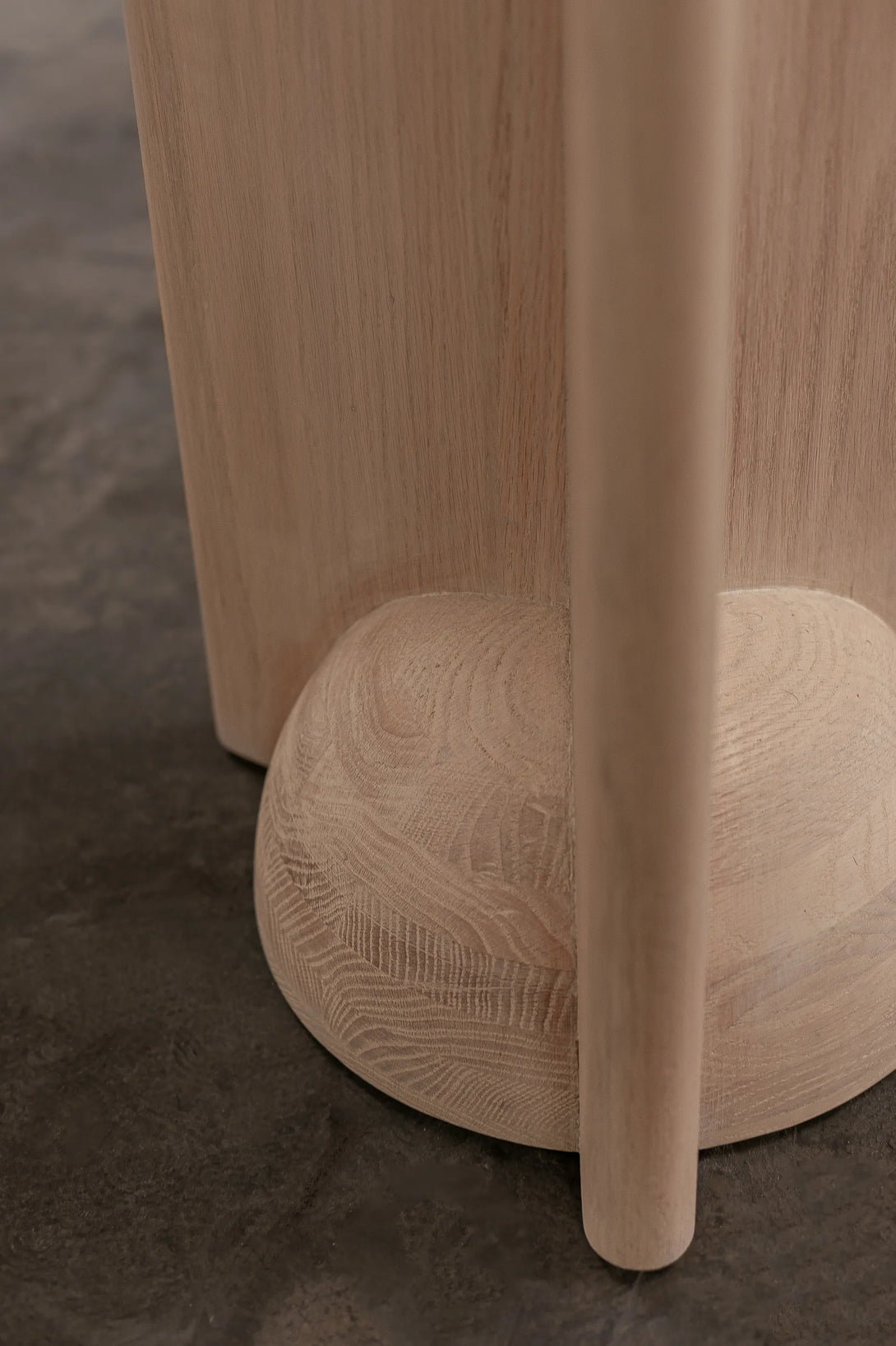 The Bleo Pedestal is a design column that combines solid geometric forms with soft sculptural elements, creating an elegant and contemporary support piece. It is constructed from Red Oak Wood and features a Cream Wash Finish, which provides a light, organic look while enhancing the oak's texture. The main structure is a vertical prism, characterized by a concave quarter-sphere cut-out at the top, which serves as a niche for displaying an object. At the base, a convex hemisphere is fitted into the structure, reinforcing the aesthetic of rounded forms. This juxtaposition of right angles and soft curves gives the Bleo Pedestal an architectural appeal, making it an ideal, elegant display stand.