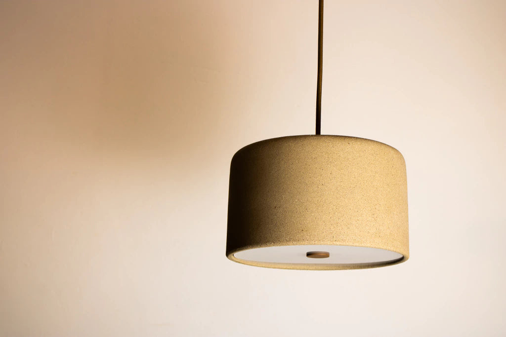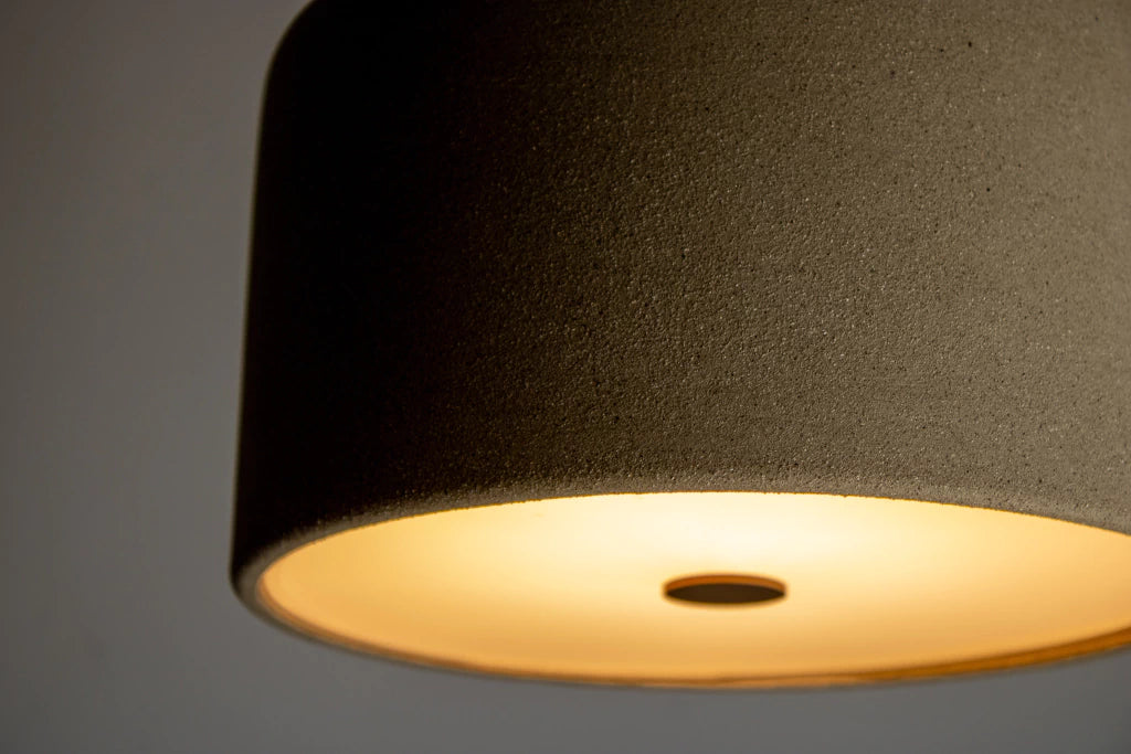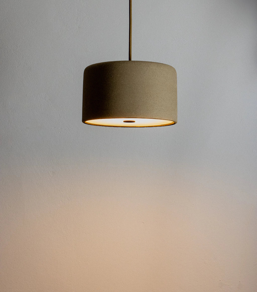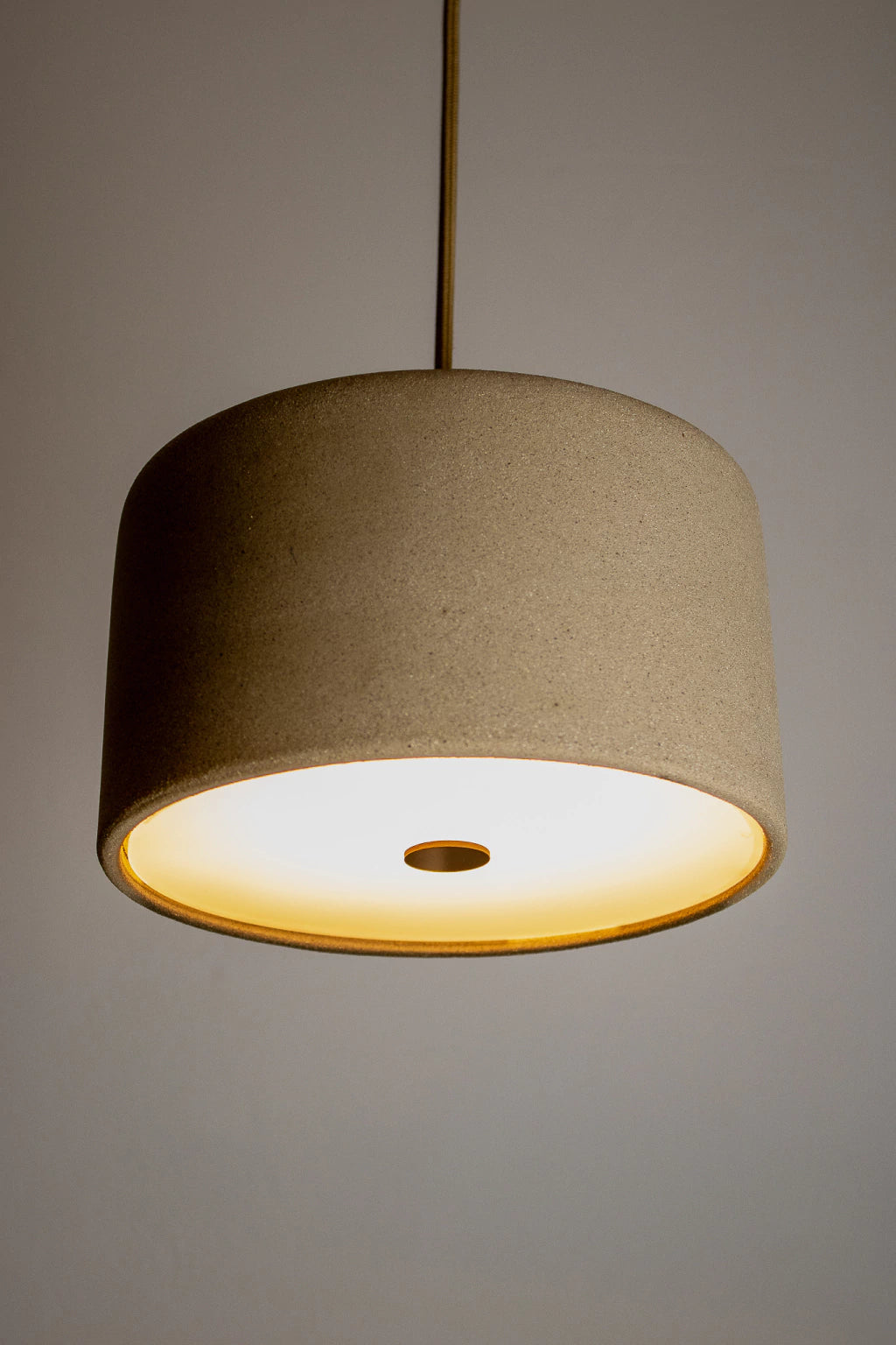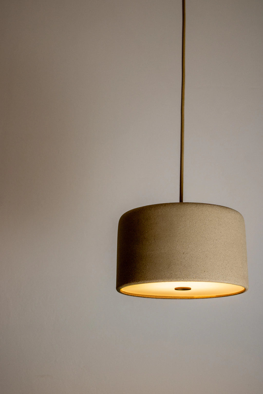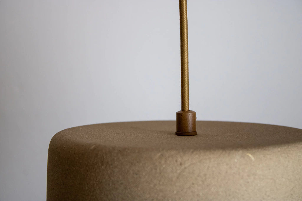 This piece is made of natural ceramic, with a sand-colored finish (ceramic) and rust-colored details on the fabric cord and canopy. The lighting consists of a 24W LED panel (warm light), with the driver installed in the canopy. A frosted acrylic diffuser softens the light.