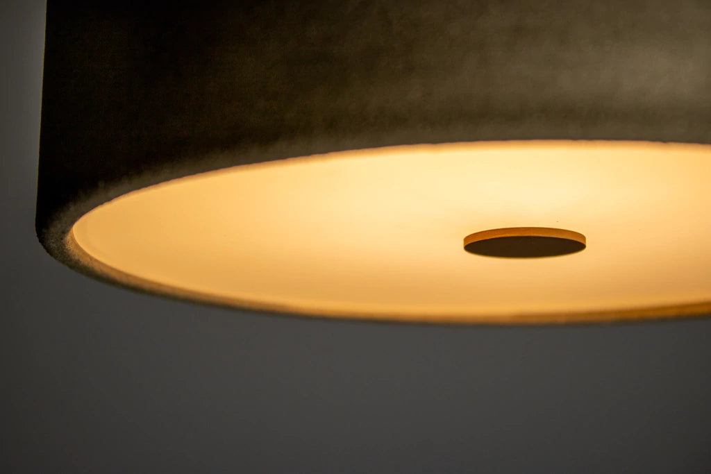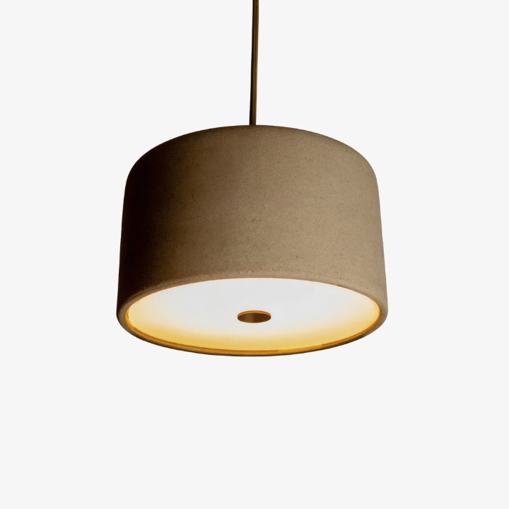 The Dona pendant is an elegant and contemporary piece, made of natural ceramic with a sand-colored finish, complemented by rust-colored details on the fabric cord and canopy. It features a 24W LED panel (warm light) with the driver installed in the canopy, providing efficient and cozy illumination. The frosted acrylic diffuser softens the light, creating a pleasant and inviting atmosphere.