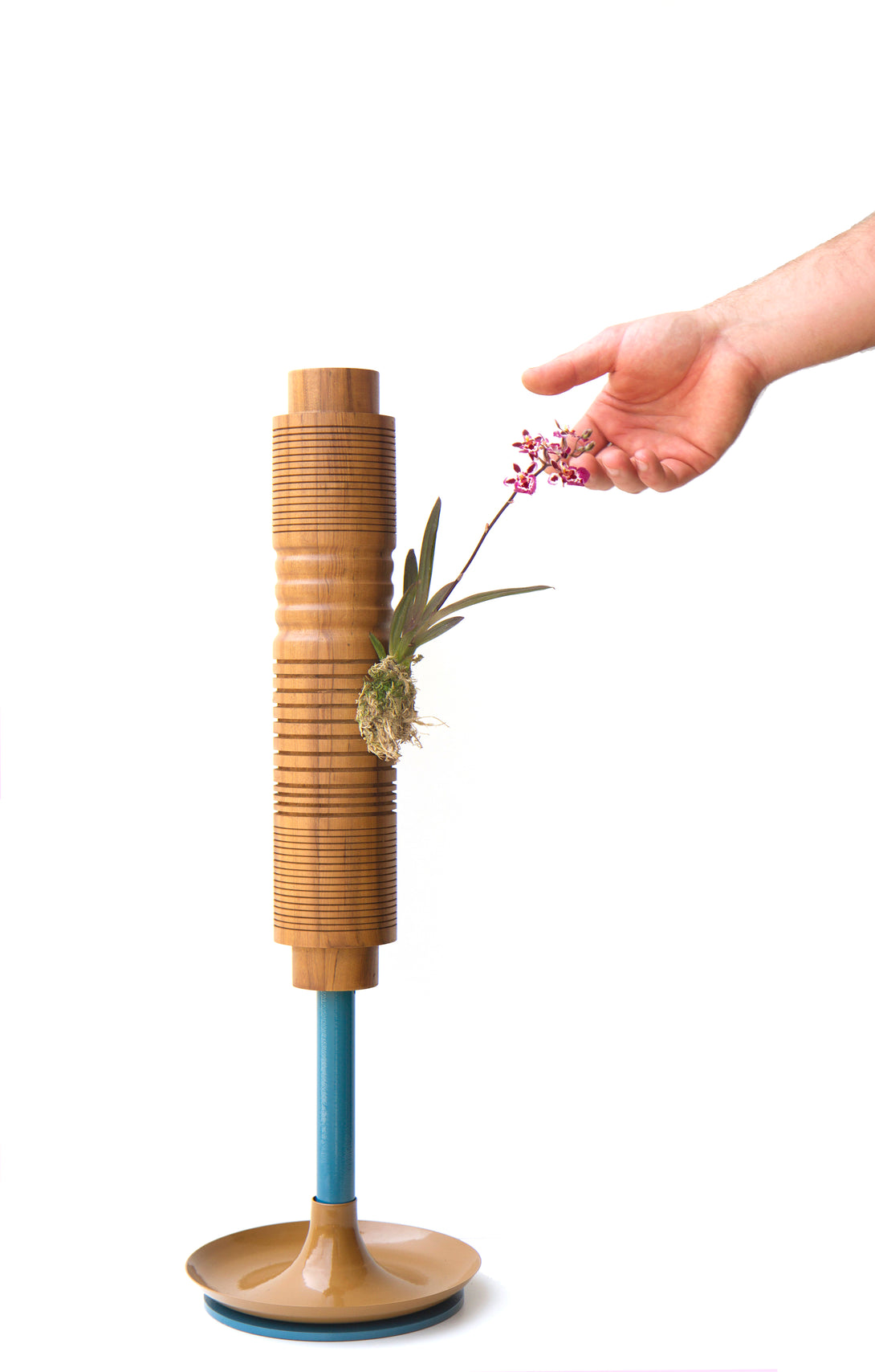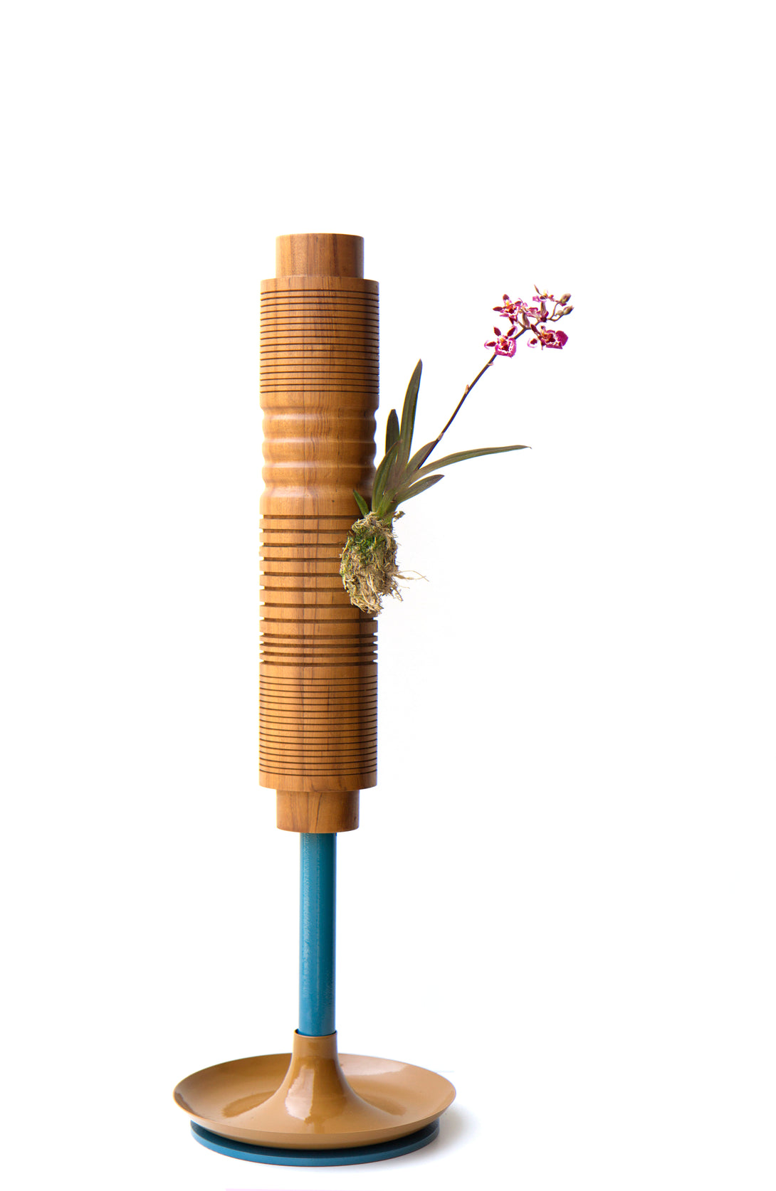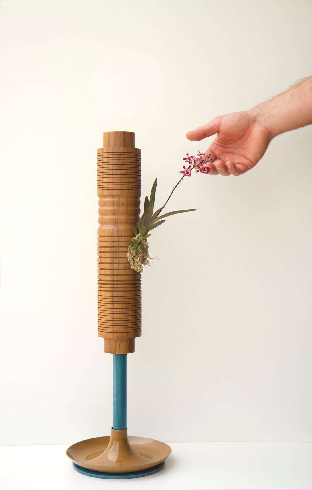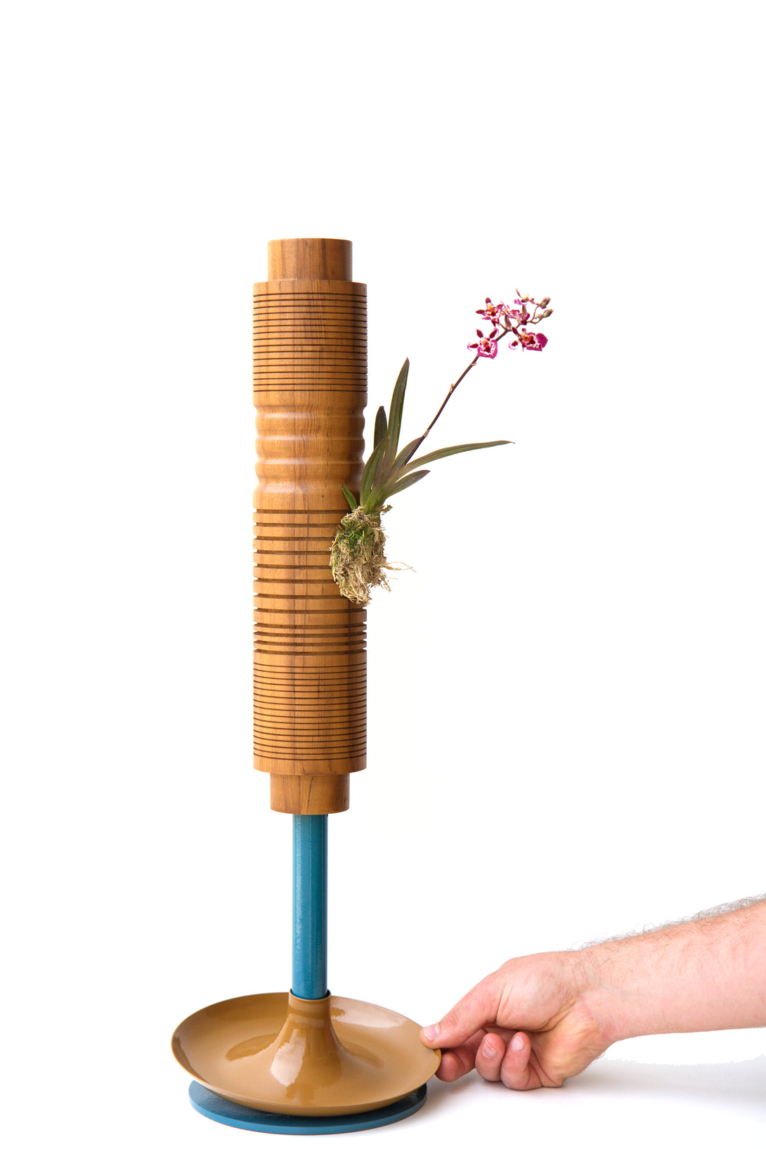 Turned solid Imbuia wood with a matt varnish finish. Carbon steel base with electrostatic paint. Water collection tray in electrostatically painted aluminum or wood.