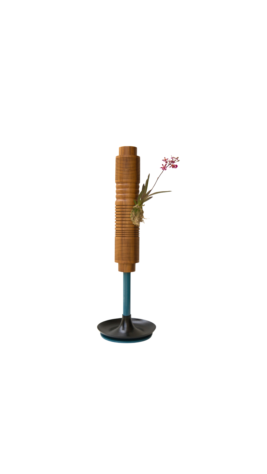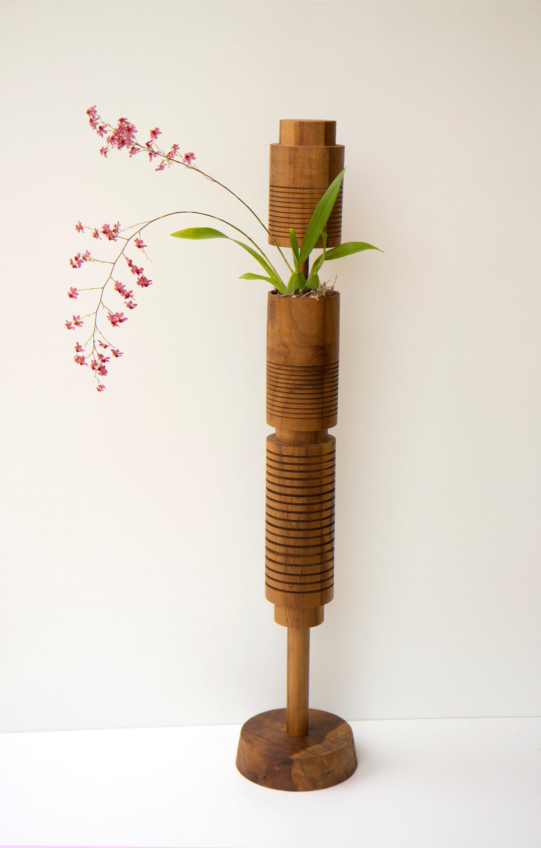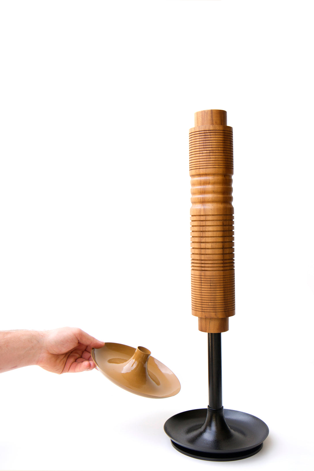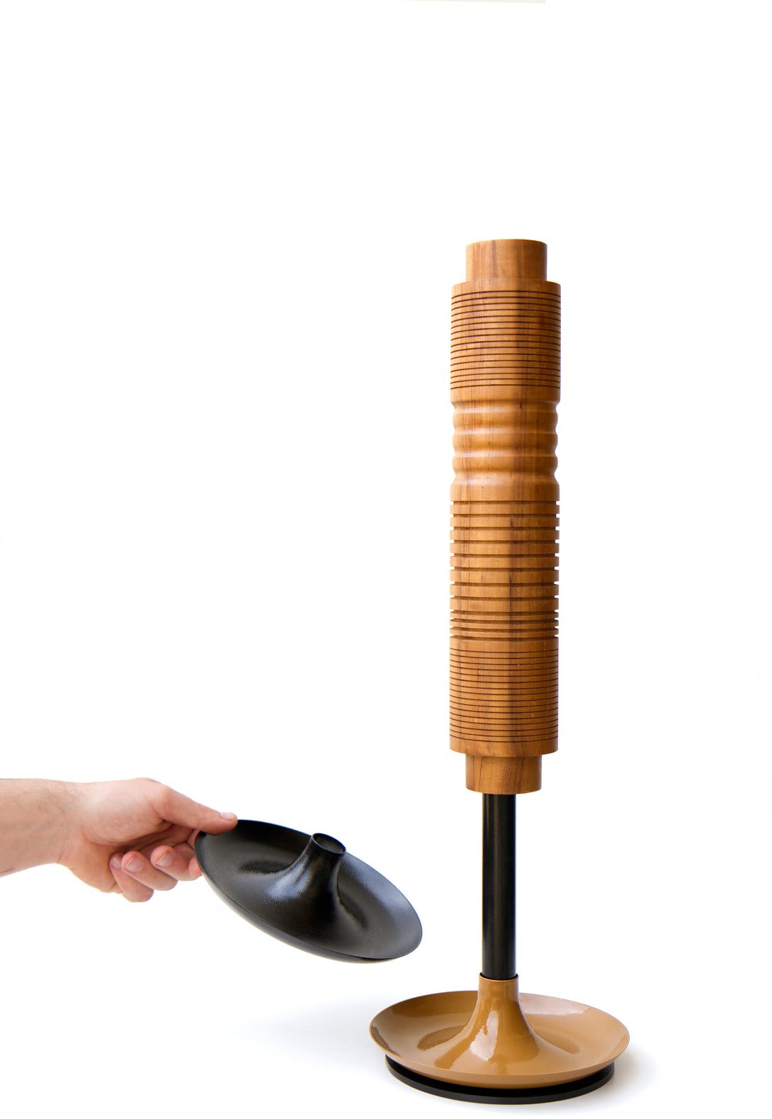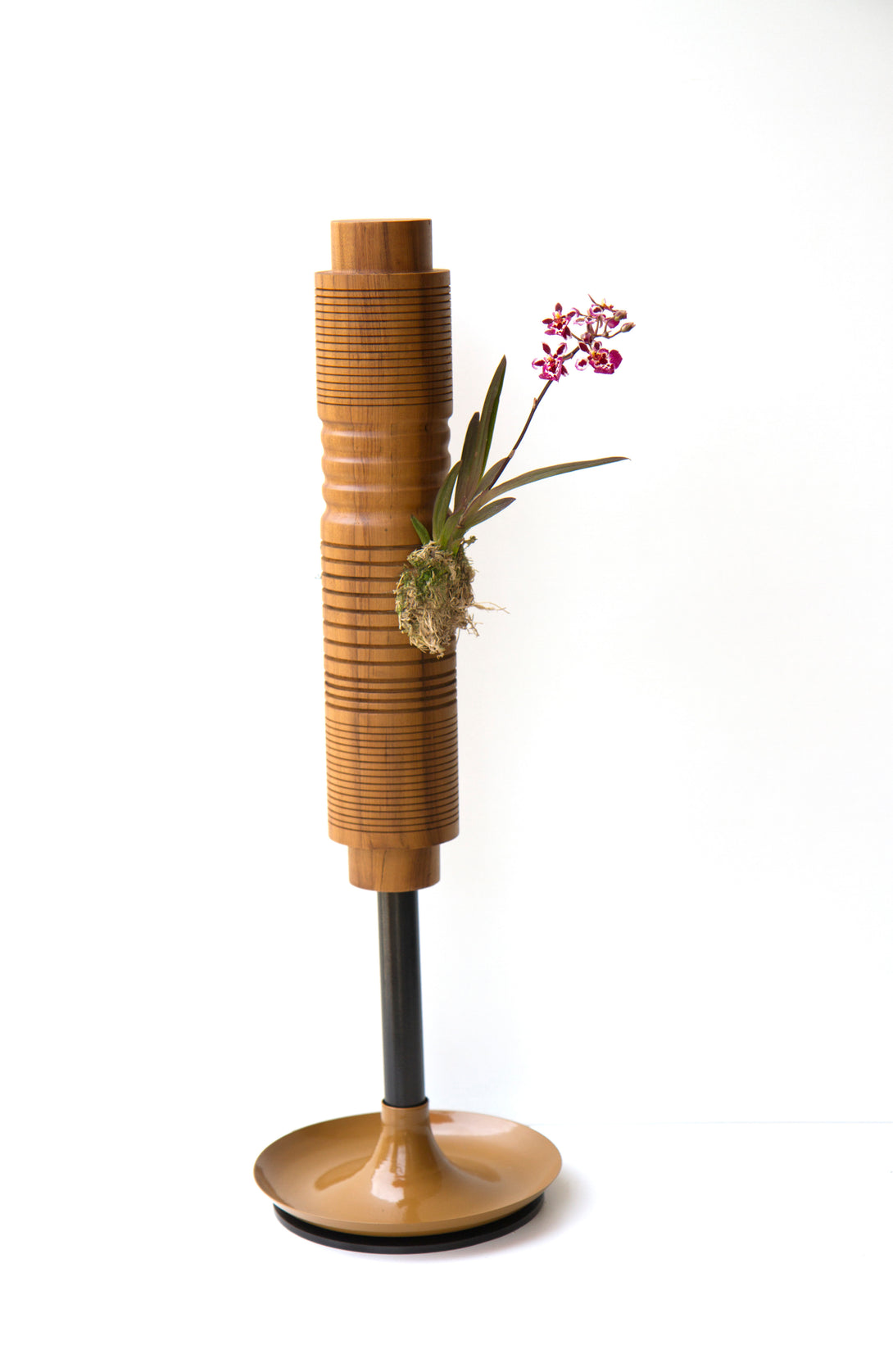 Turned solid Imbuia wood with a matt varnish finish. Carbon steel base with electrostatic paint. Water collection tray in electrostatically painted aluminum or wood.