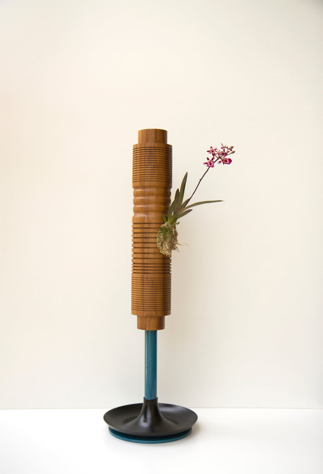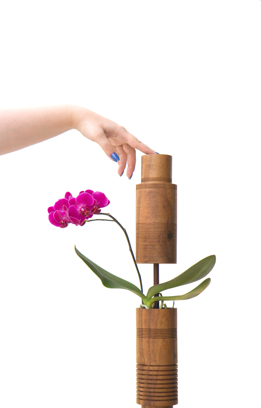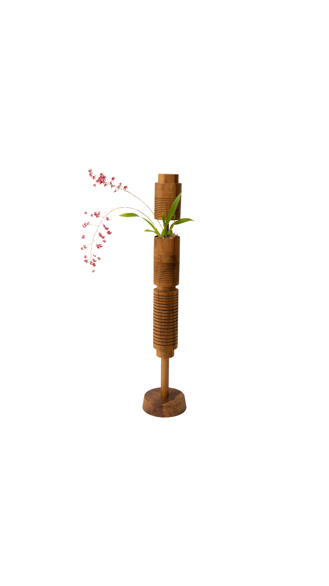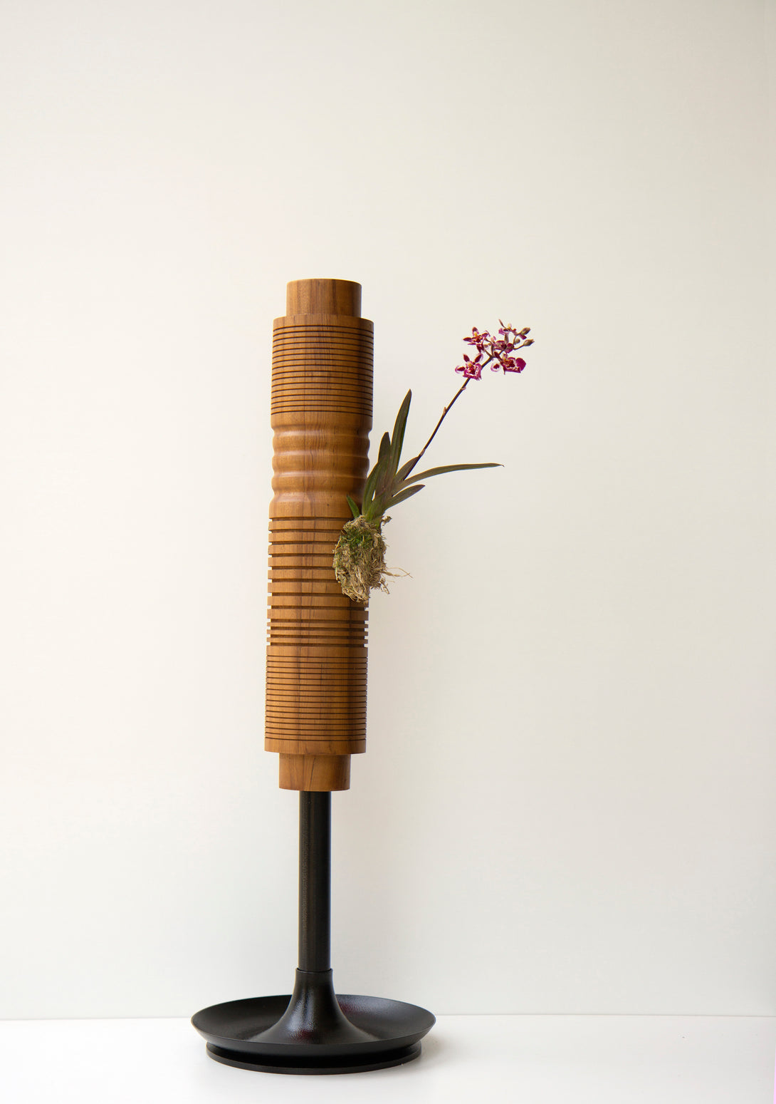 Turned solid Imbuia wood with a matt varnish finish. Carbon steel base with electrostatic paint. Water collection tray in electrostatically painted aluminum or wood.