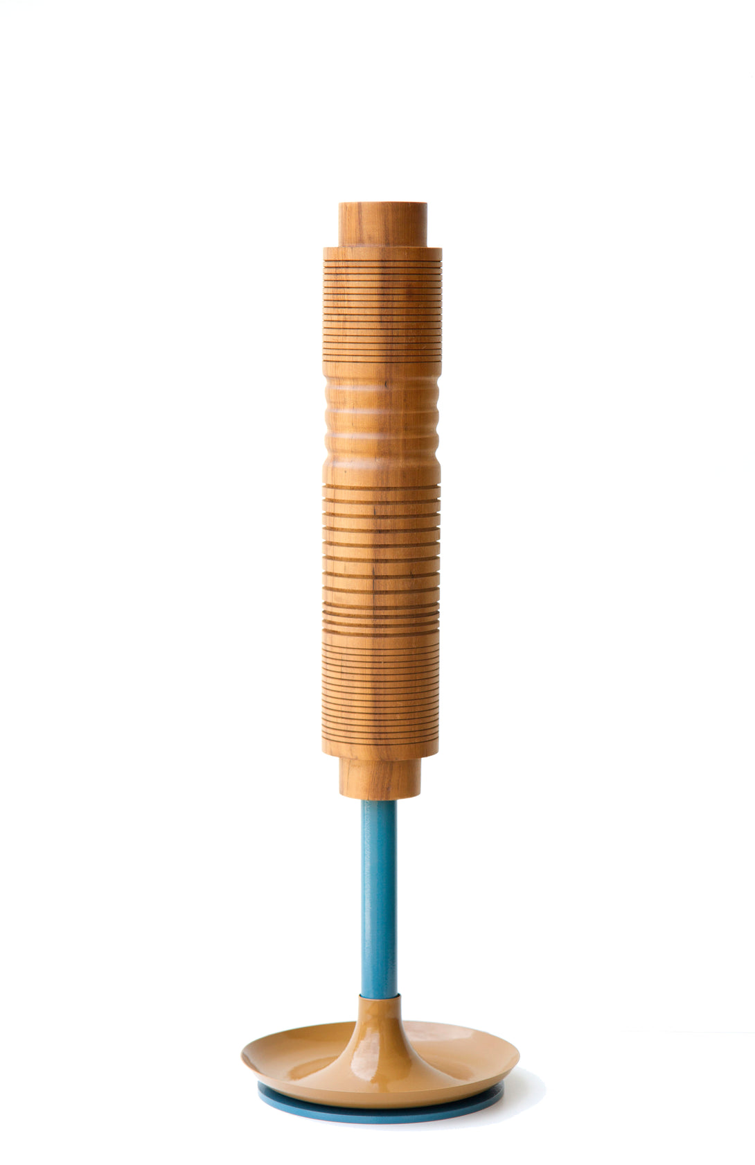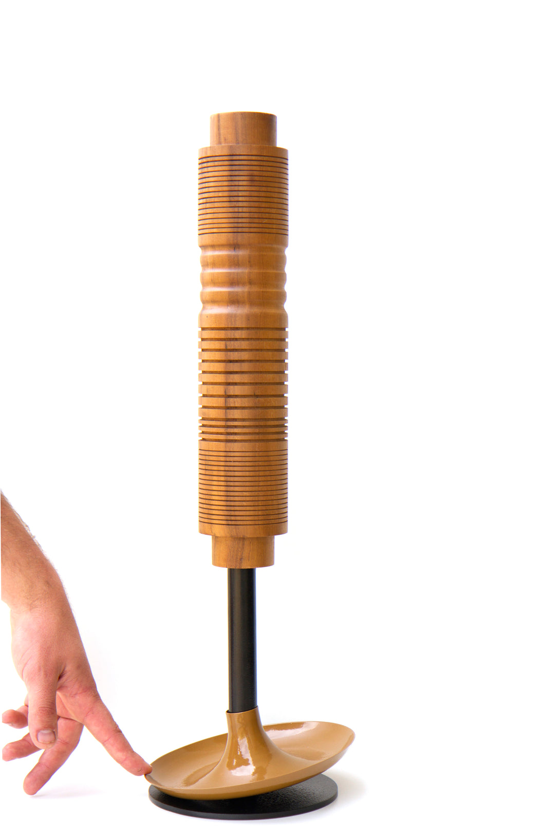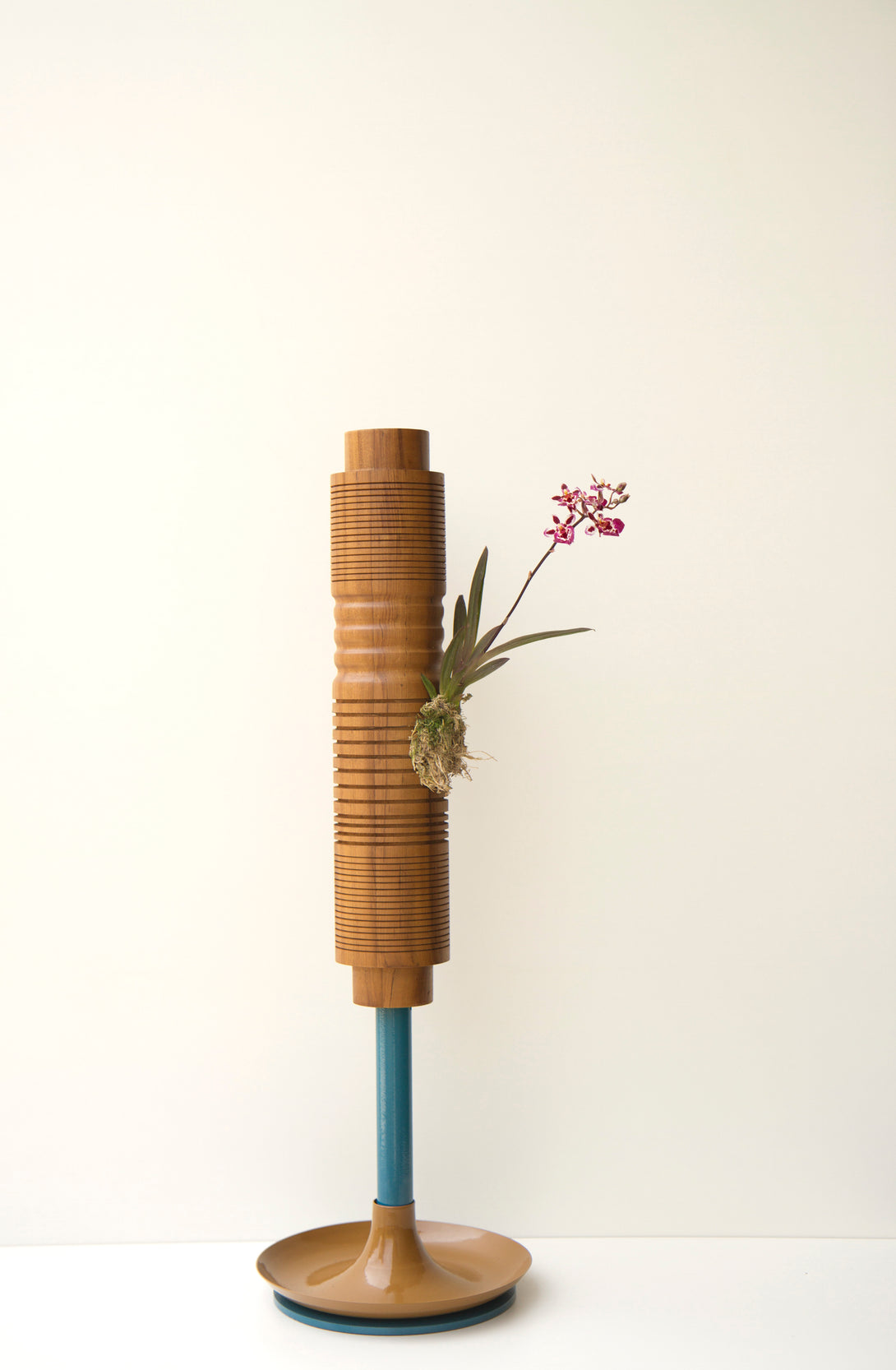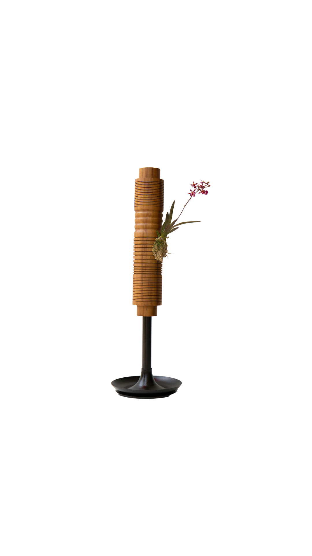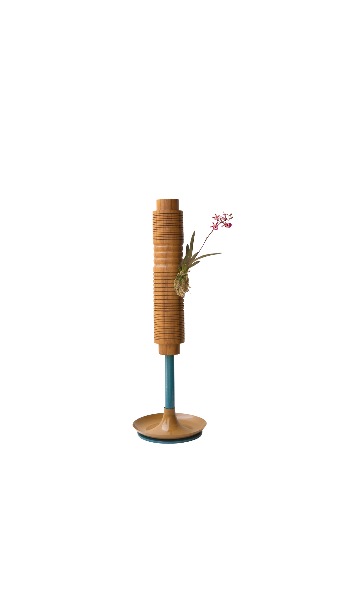 Turned solid Imbuia wood with a matt varnish finish. Carbon steel base with electrostatic paint. Water collection tray in electrostatically painted aluminum or wood.