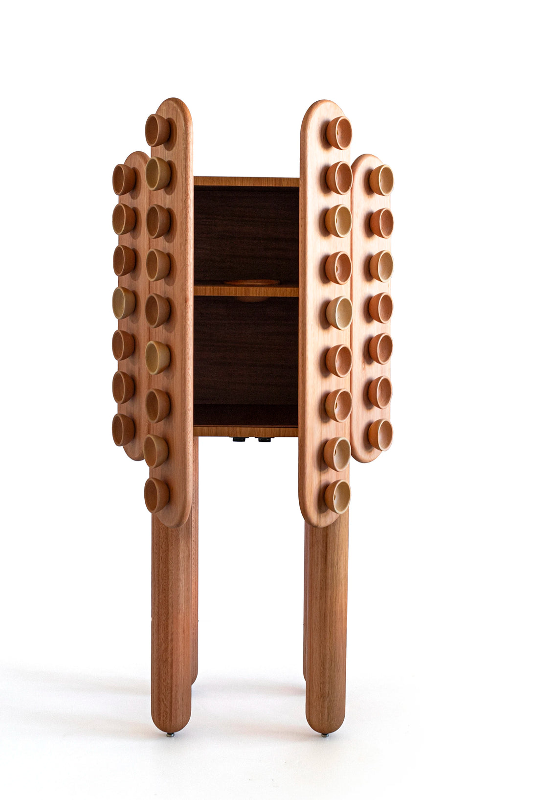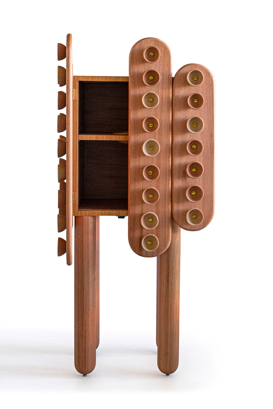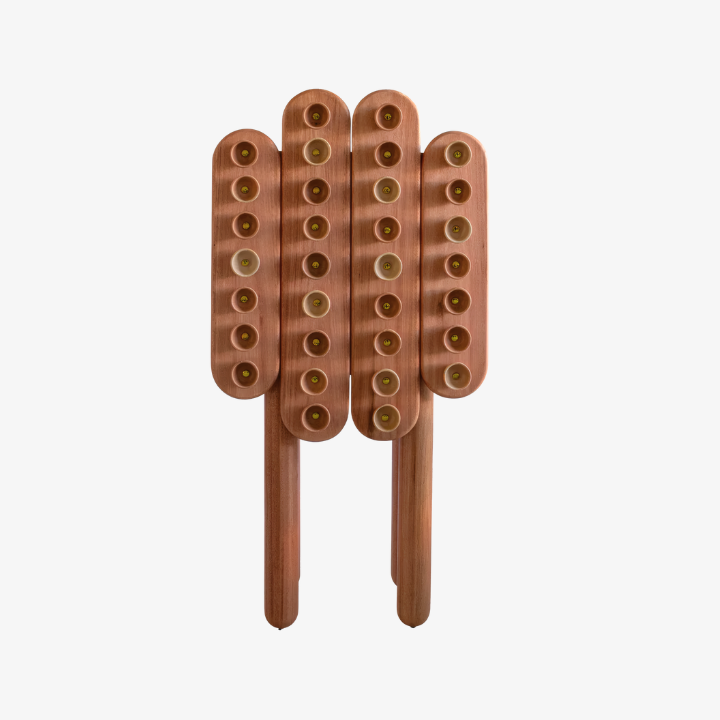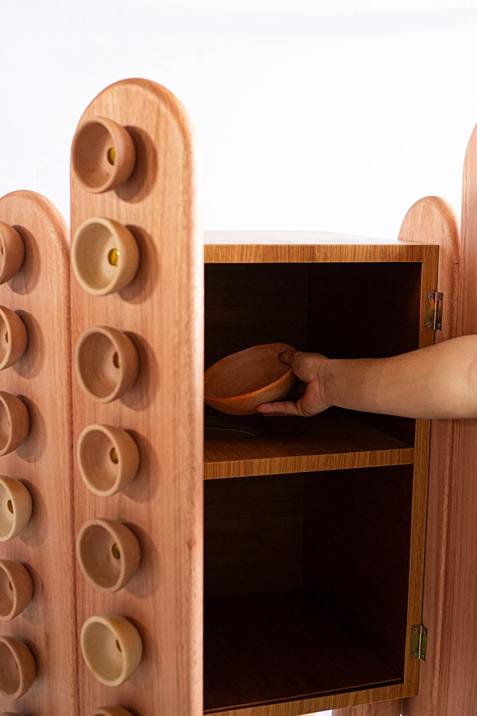 Fornada is a cabinet conceived as a piece of memory and affection. Inspired by the traditional way of baking empadas, a typical dish from the city of Goiás, the piece captures the artisanal gestures of cooks and ceramicists, transforming them into a language of design. The wooden structure provides solidity and presence, while the ceramic elements—produced in partnership with local artisans—appear as textures and reliefs, evoking freshly baked trays and also functioning as handles. Between utility and expression, it is both a piece of furniture and a sculpture: a daily altar dedicated to the culinary and artisanal culture of the cerrado.