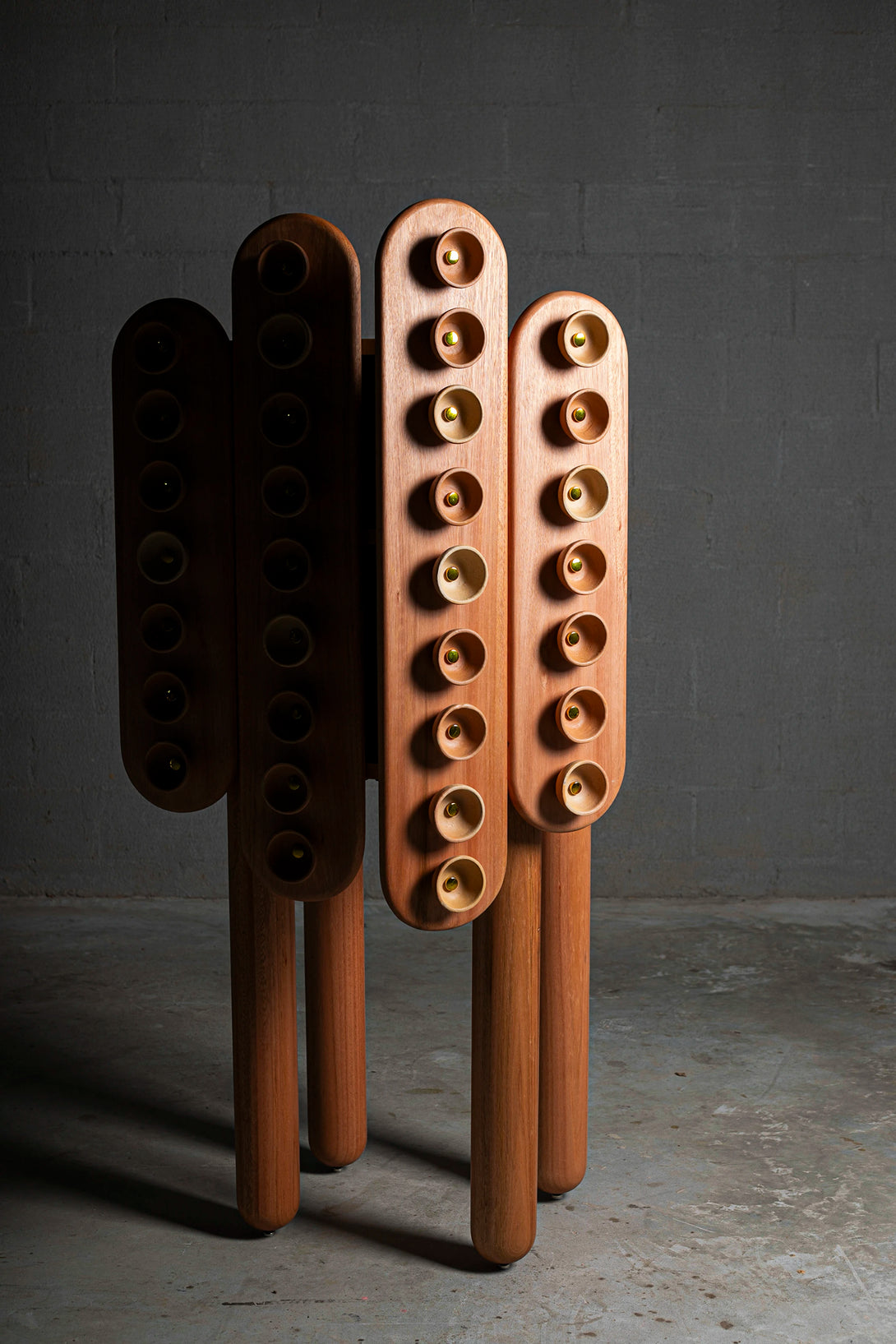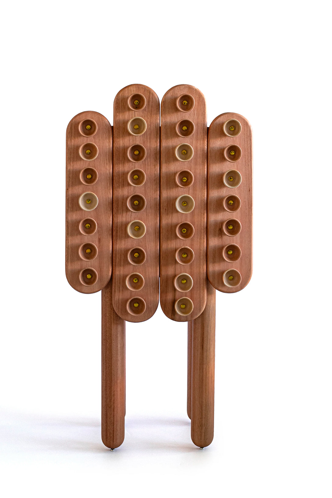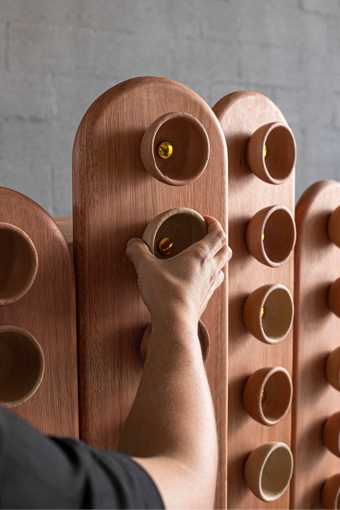Fornada is a cabinet conceived as a piece of memory and affection. Inspired by the traditional way of baking empadas, a typical dish from the city of Goiás, the piece captures the artisanal gestures of cooks and ceramicists, transforming them into a language of design. The wooden structure provides solidity and presence, while the ceramic elements—produced in partnership with local artisans—appear as textures and reliefs, evoking freshly baked trays and also functioning as handles. Between utility and expression, it is both a piece of furniture and a sculpture: a daily altar dedicated to the culinary and artisanal culture of the cerrado.
