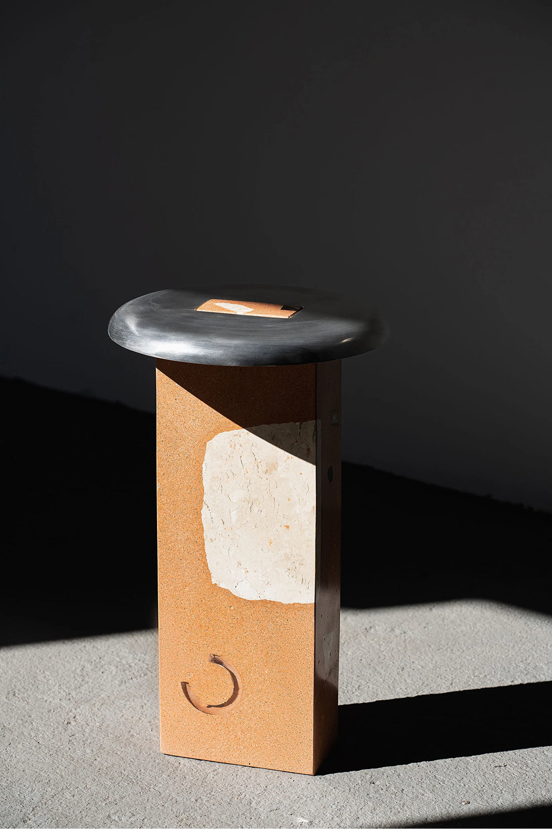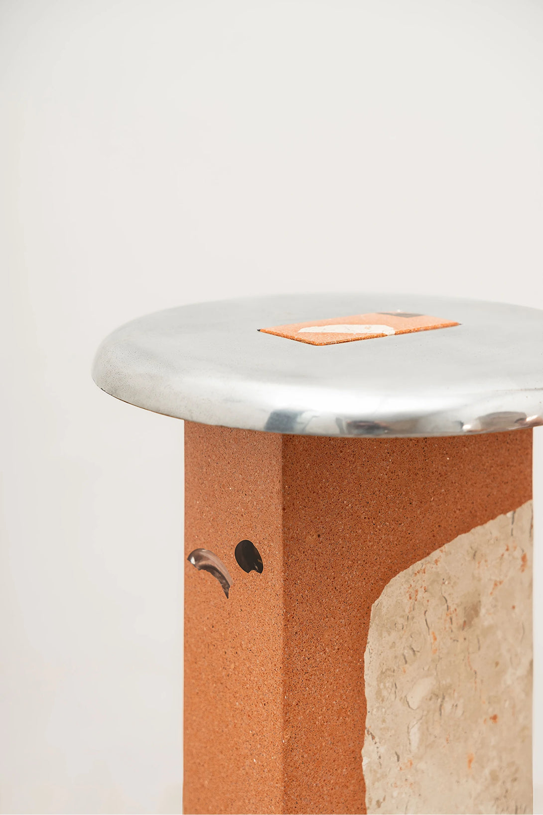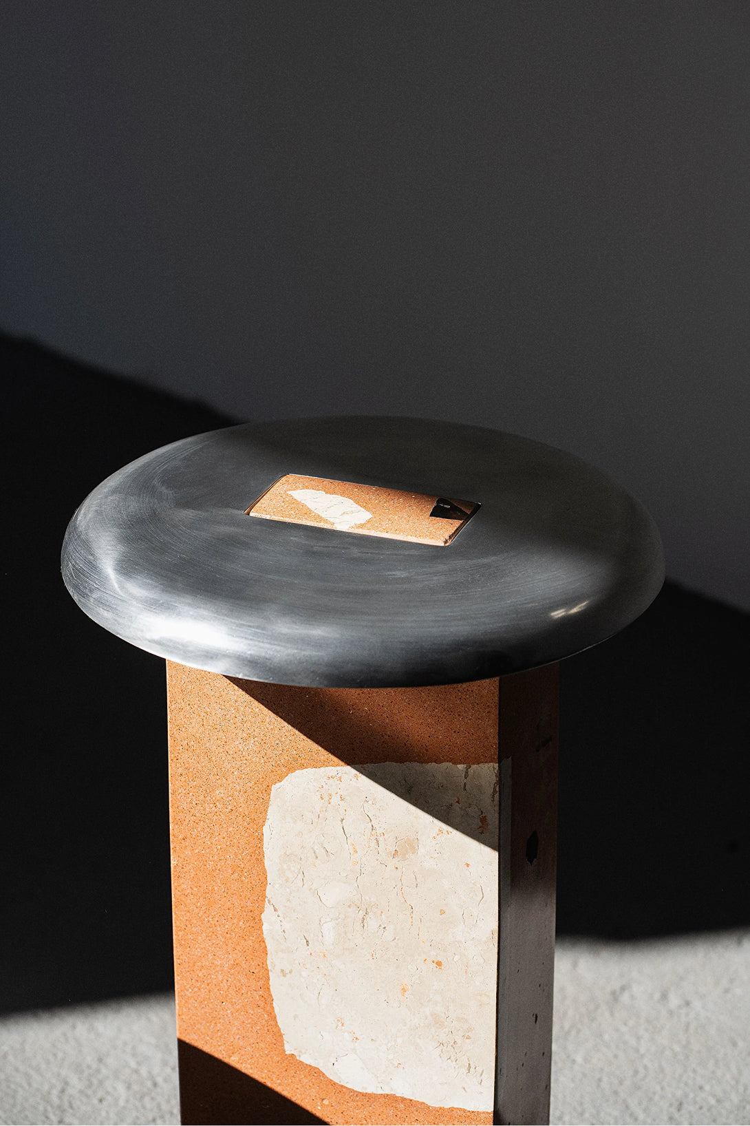 The Nu side table reflects the essence of materials in their purest and most authentic form. Created to highlight the intrinsic beauty of the components that form it, the piece explores the contrast and interaction between the elements in a bold yet harmonious way. The top, made from cast aluminum with a polished finish, sourced from recycled materials, is complemented by the structure in a composite of recycled ceramic bricks, combined with glass and Beige Bahia marble. The blend of processed and natural materials, combined with the clean and precise lines of the design, evokes an aesthetic reminiscent of a warm, dystopian universe, as imagined in late 1960s science fiction.