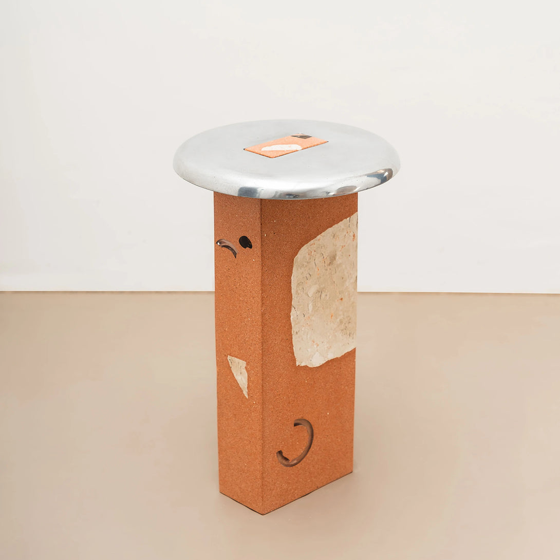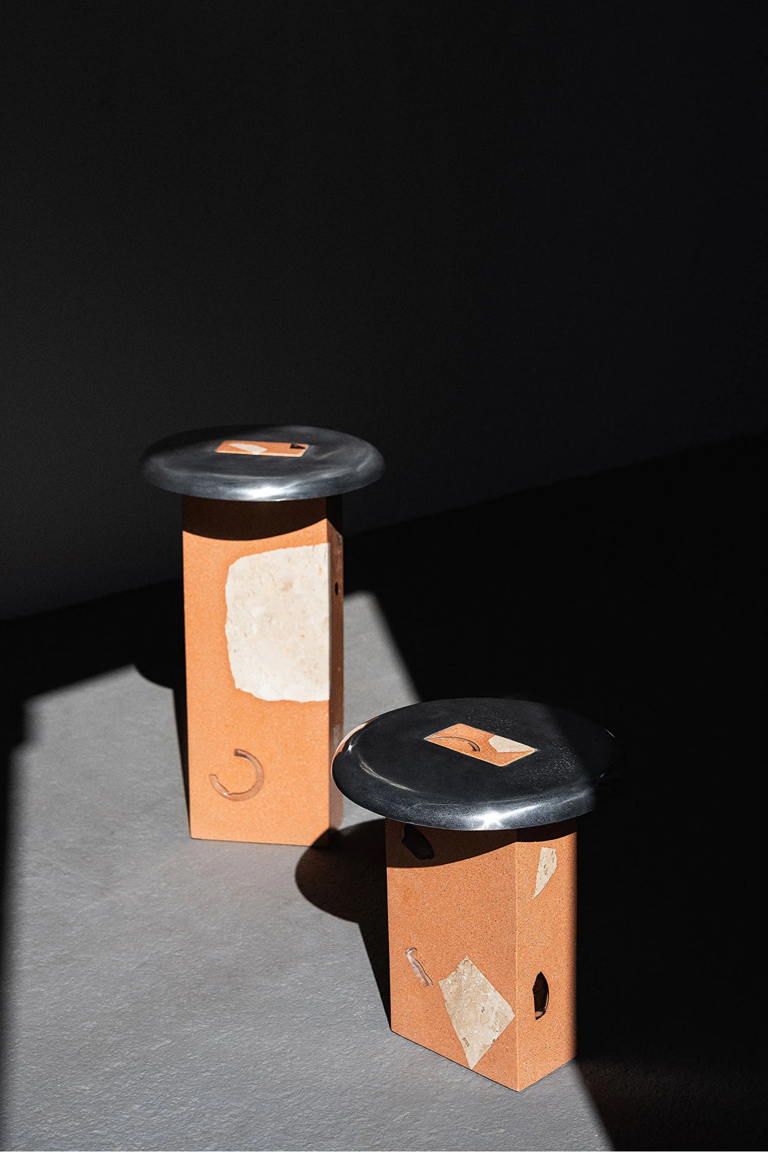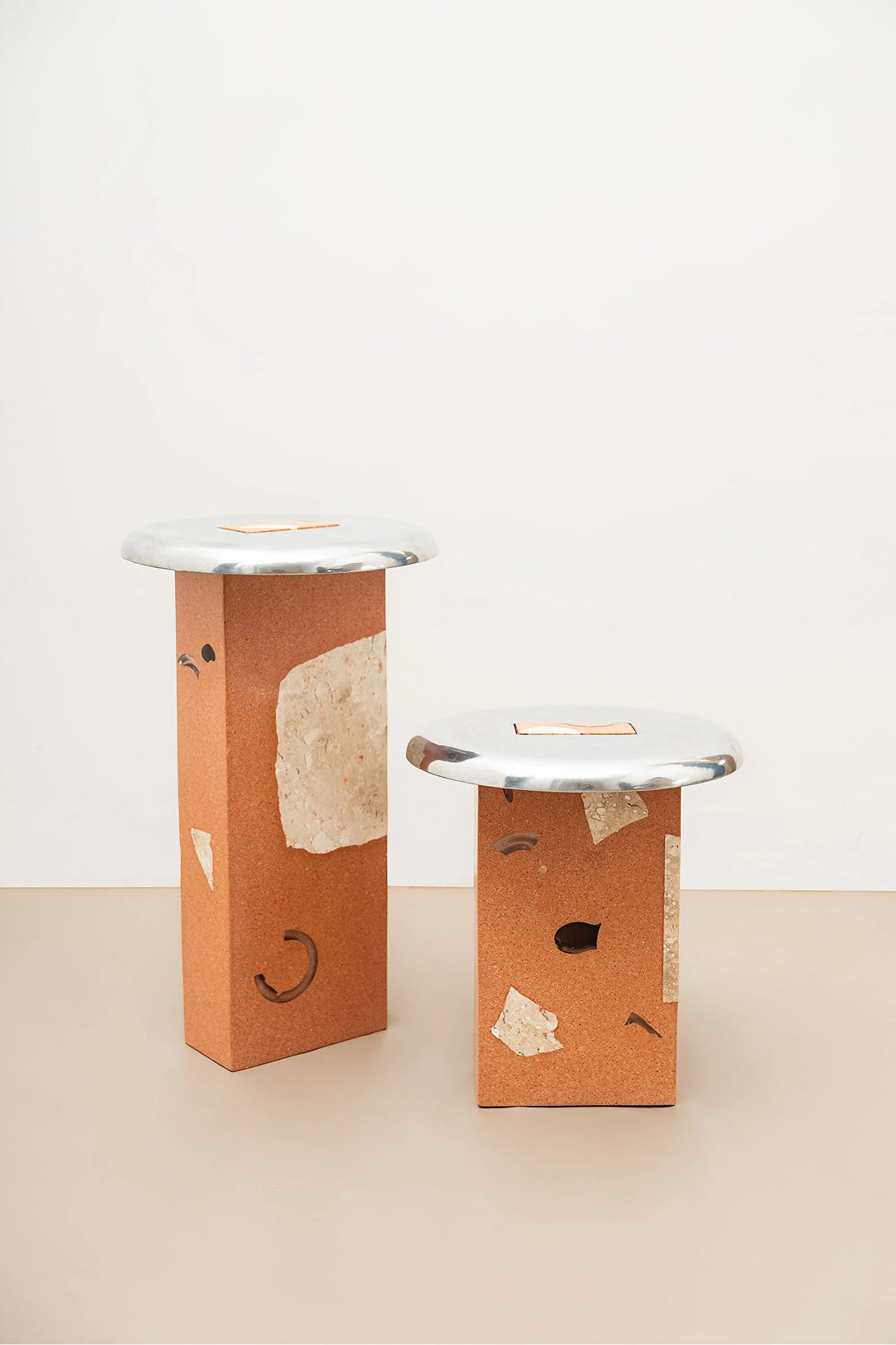 The Nu side table reflects the essence of materials in their purest and most authentic form. Created to highlight the intrinsic beauty of the components that form it, the piece explores the contrast and interaction between the elements in a bold yet harmonious way. The top, made from cast aluminum with a polished finish, sourced from recycled materials, is complemented by the structure in a composite of recycled ceramic bricks, combined with glass and Beige Bahia marble. The blend of processed and natural materials, combined with the clean and precise lines of the design, evokes an aesthetic reminiscent of a warm, dystopian universe, as imagined in late 1960s science fiction.