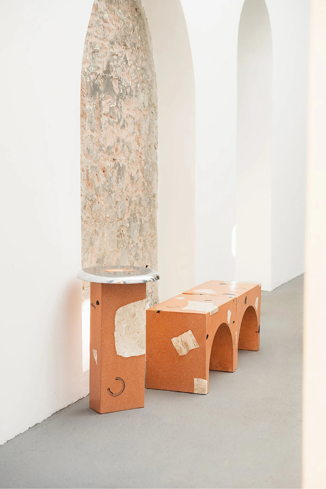 Column made of composite based on crushed recycled ceramic bricks with glass and Beige Bahia marble aggregates. Top made of cast aluminum from recycled sources with a polished finish.