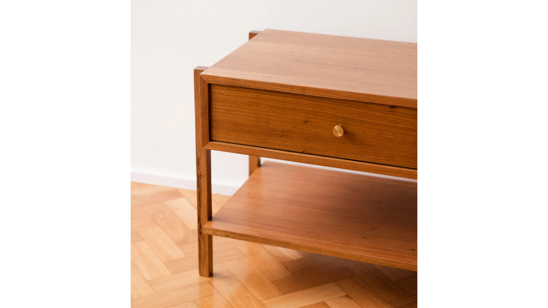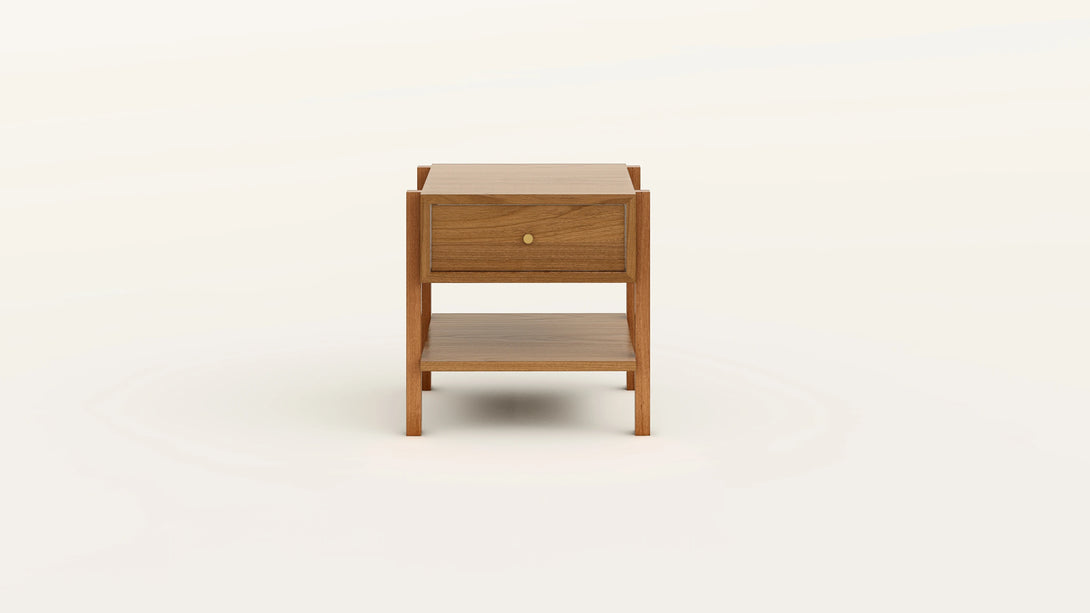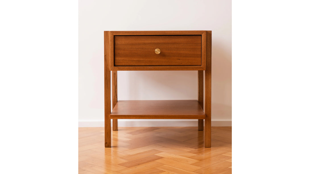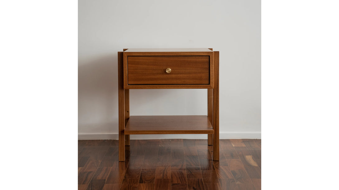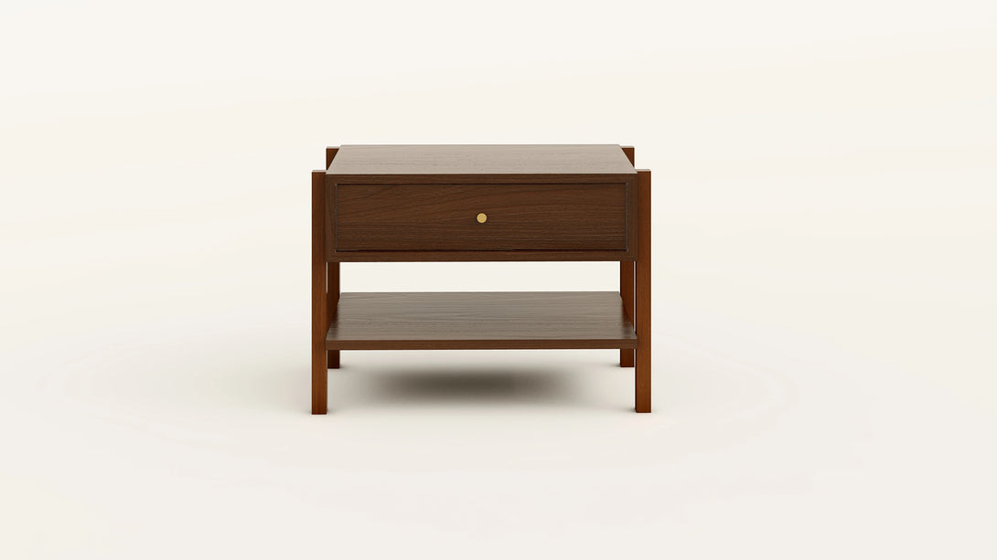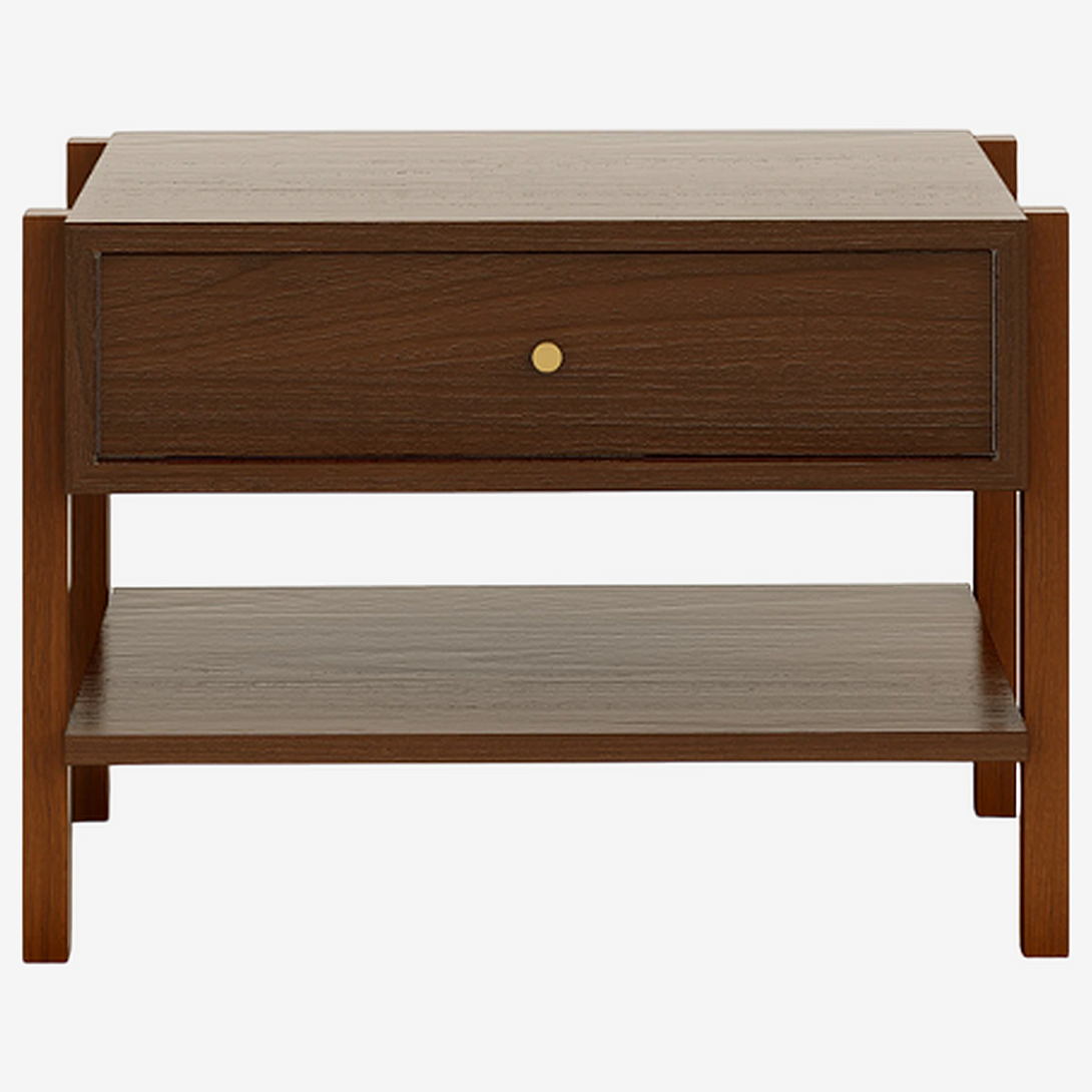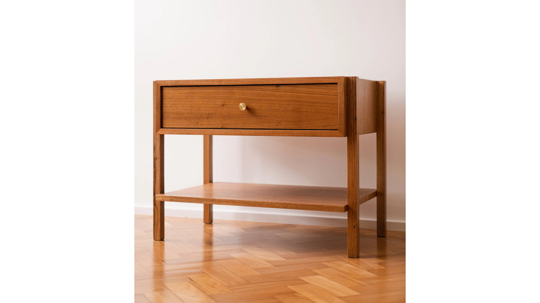 A lightweight piece that offers storage space in the upper module, along with a support surface on the lower shelf. Both elements are held up by a structure of four solid wood legs.