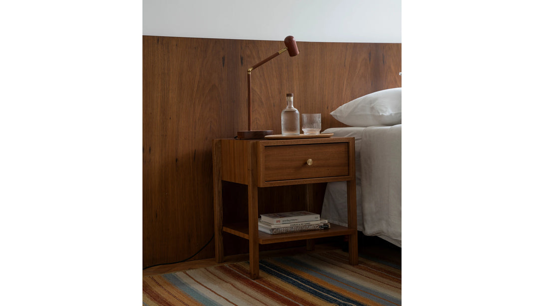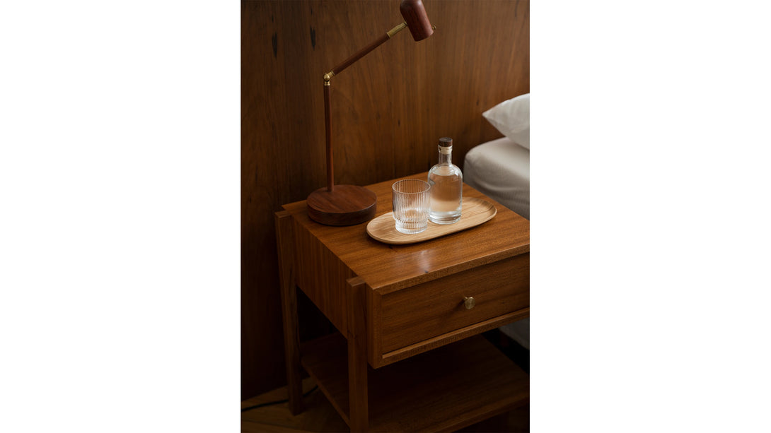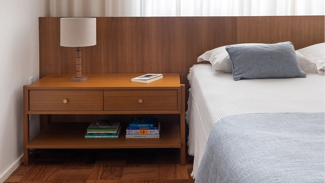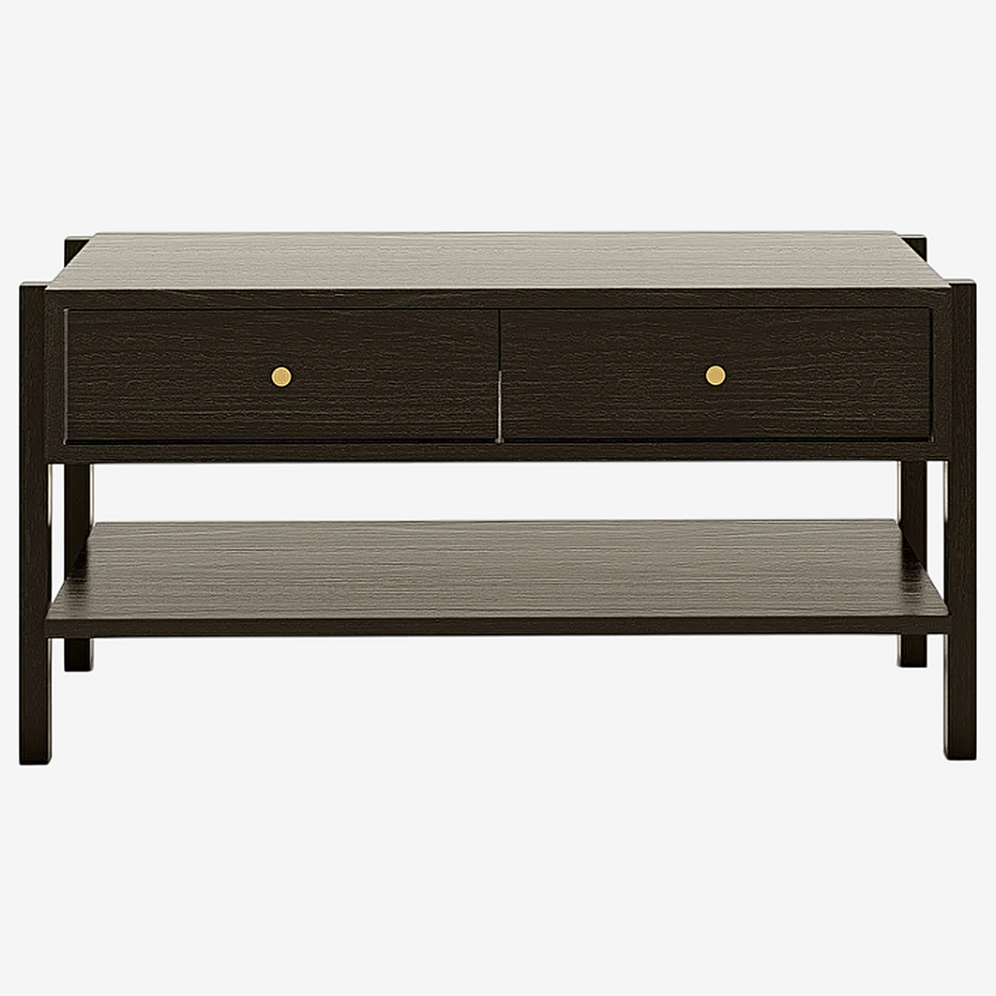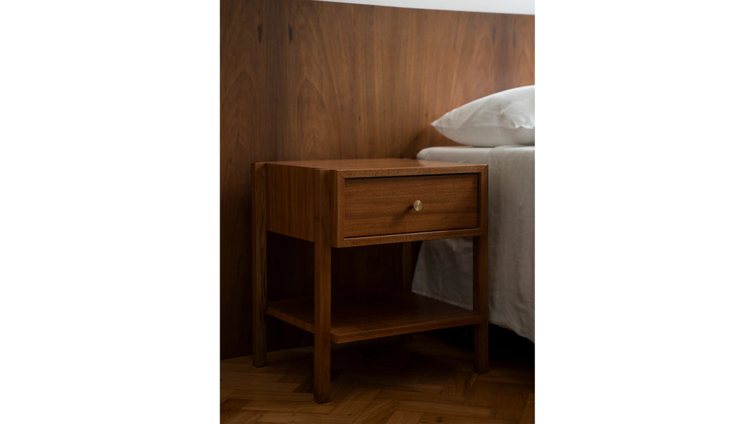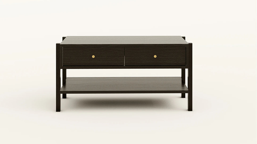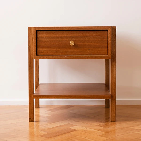 A lightweight piece that offers storage space in the upper module, along with a support surface on the lower shelf. Both elements are held up by a structure of four solid wood legs.
