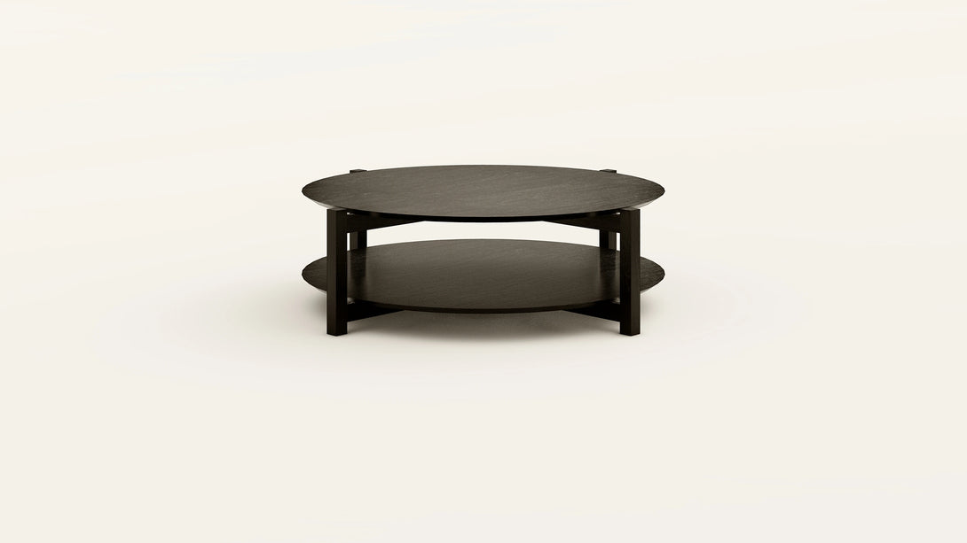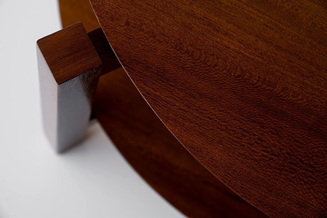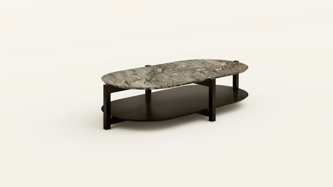The design of the TÊ table emphasizes formal simplicity. Its clean lines highlight a solid and timeless piece. The beveled tops rest subtly, complementing the striking structure without competing with it. The upper top can be crafted in either wood or stone, offering versatility and elegance to the space.