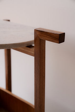 Structure and wheels in solid wood + top and tray in MDF coated with wood veneer + details in polished brass.
