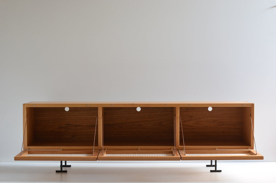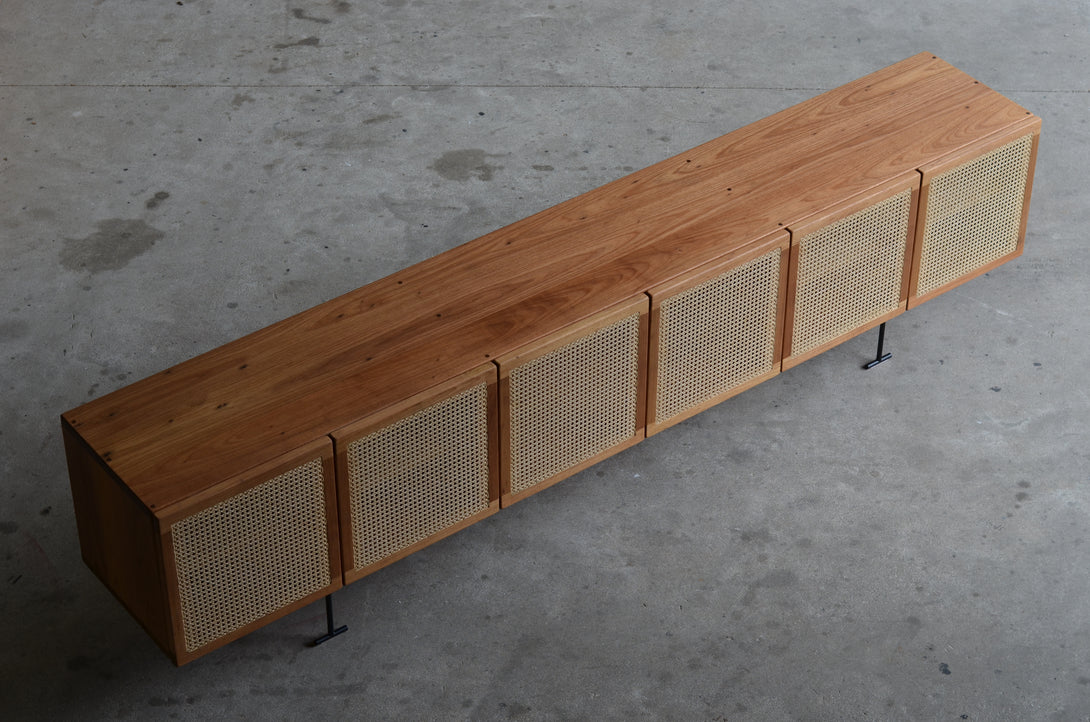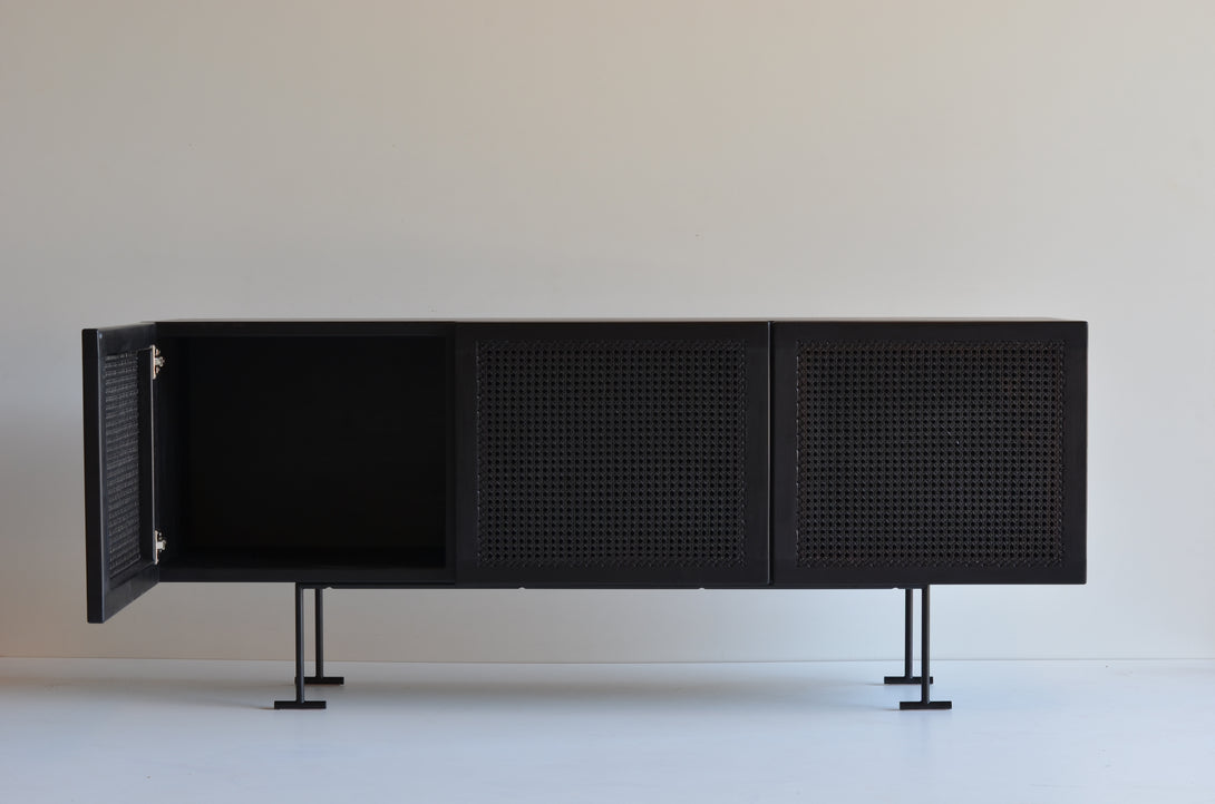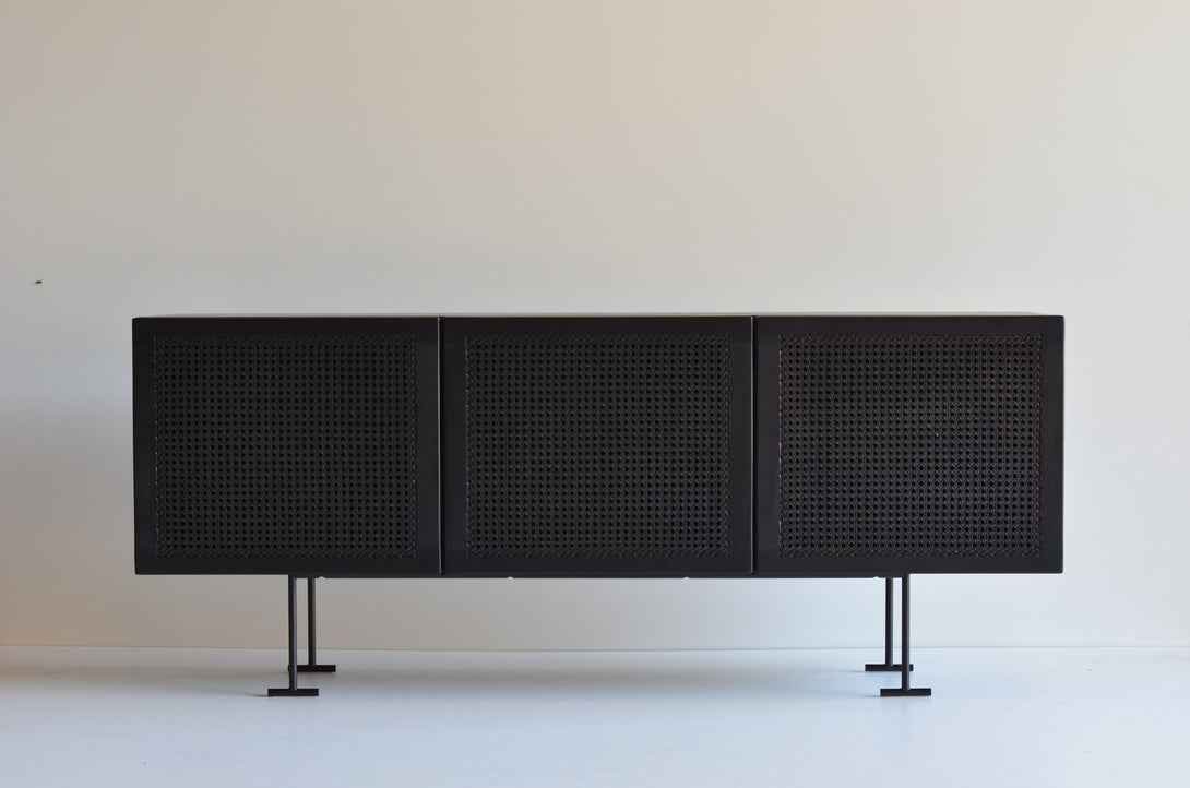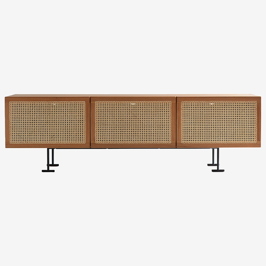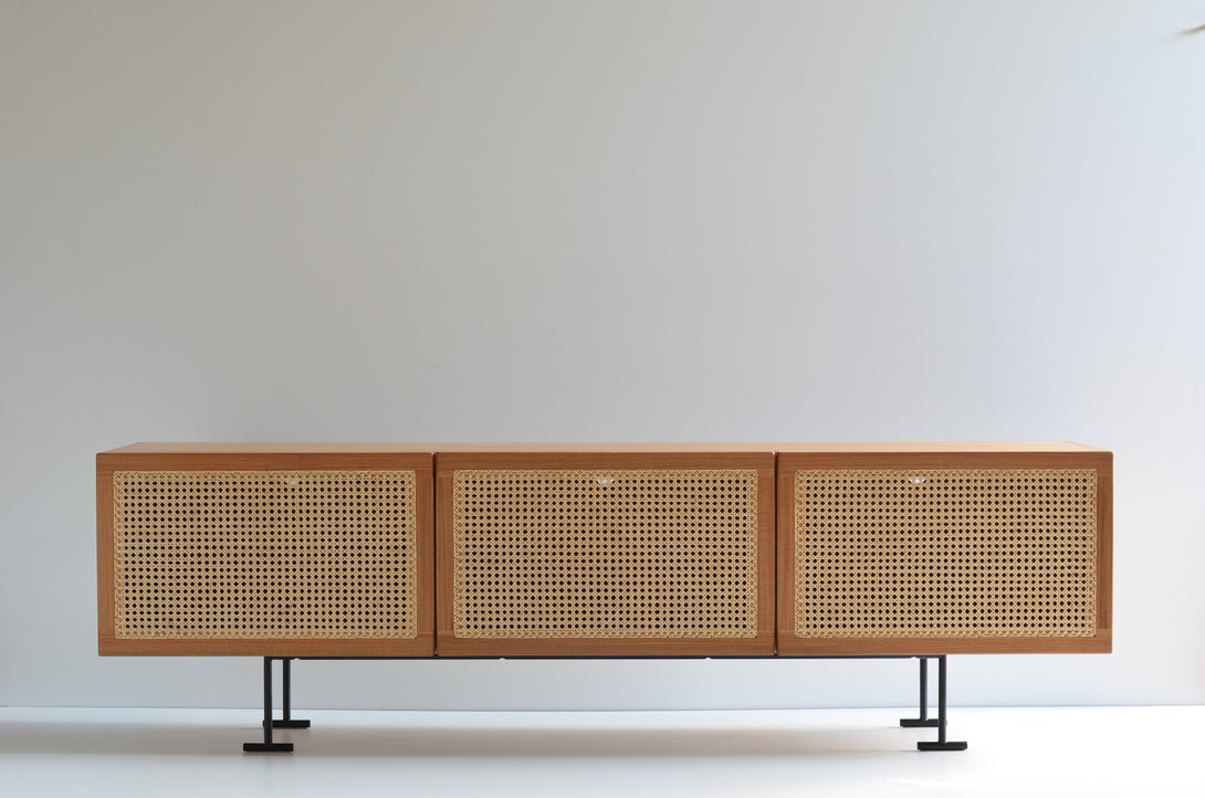 It is entirely crafted from solid woods, available in options such as violet, sucupira, tauarí, and carbonized. The structure can be made of stainless steel (polished, brushed, rose, or gold) or with electrostatic paint in black, white, gray, green, and brown. It can also be made with natural or synthetic black straw, both hand-woven.