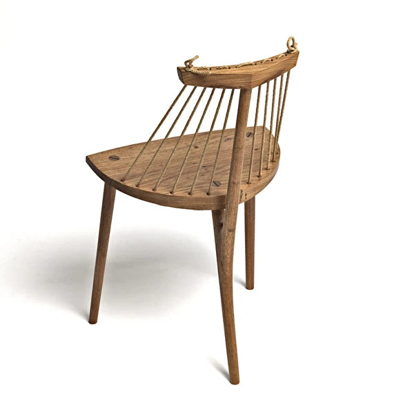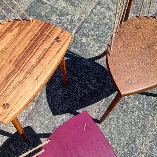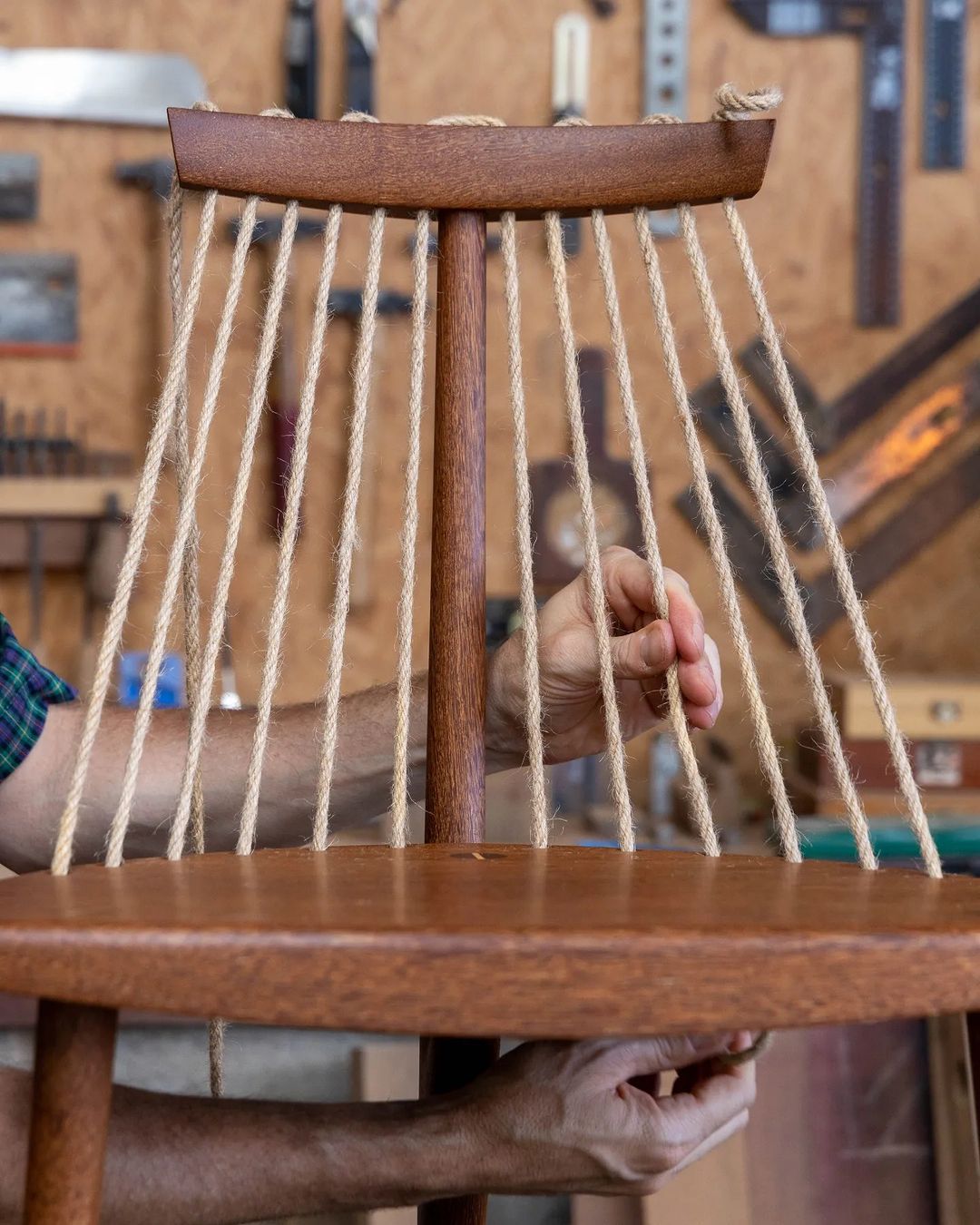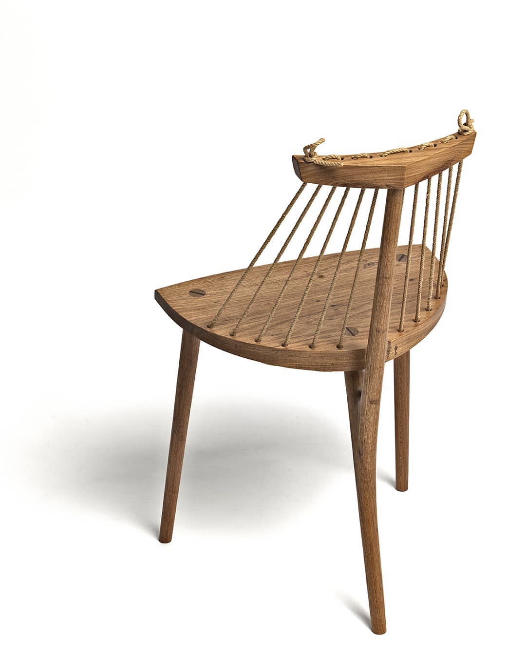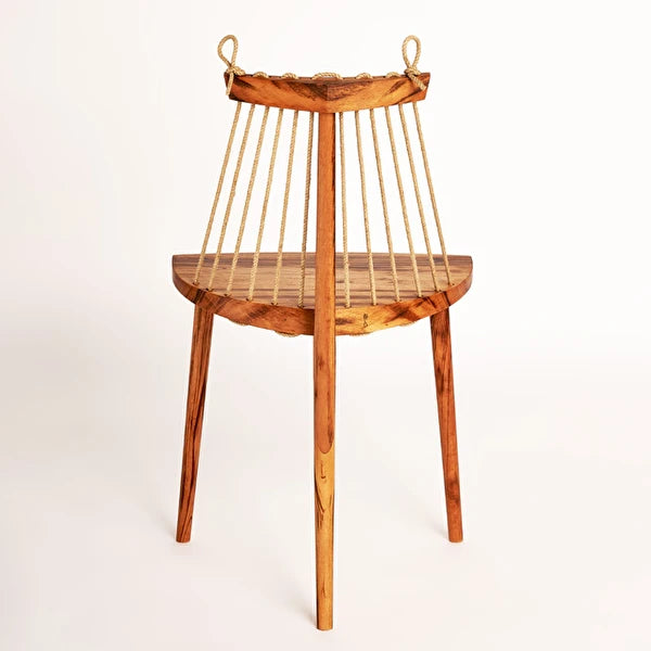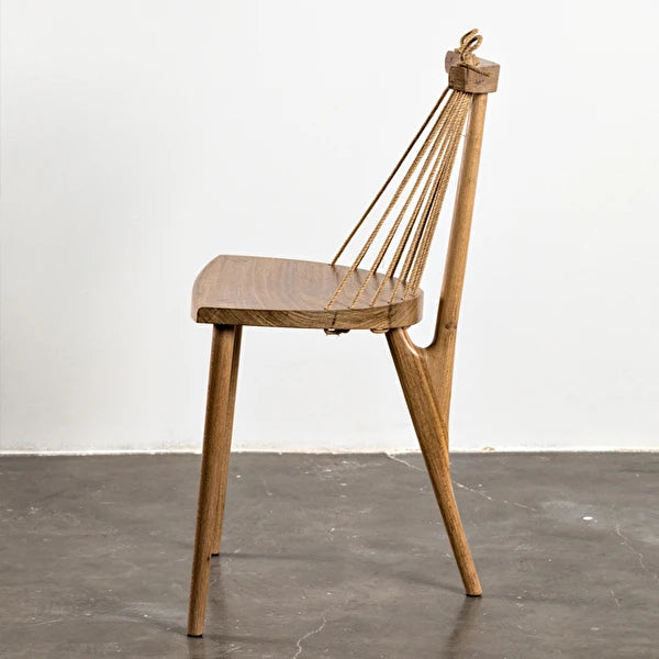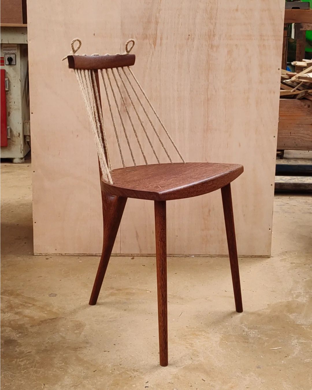 Esta cadeira contemporânea é uma peça de mobiliário de três pernas, confortável e elegante, feita de madeira tropical brasileira e corda de fibra natural na oficina do artista. Sua singularidade é complementada por sua simplicidade e excelente artesanato. A forma do encosto é criada por uma corda, cuja tensão é gerada por uma alavanca que torce o cordão sob o assento, uma solução elegante, simples e muito eficaz. As pernas se encaixam com segurança no assento com articulações tradicionais de cunha. As cunhas são feitas de madeiras preciosas escuras ou madeira tropical clara. As cadeiras são assinadas e numeradas.