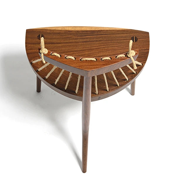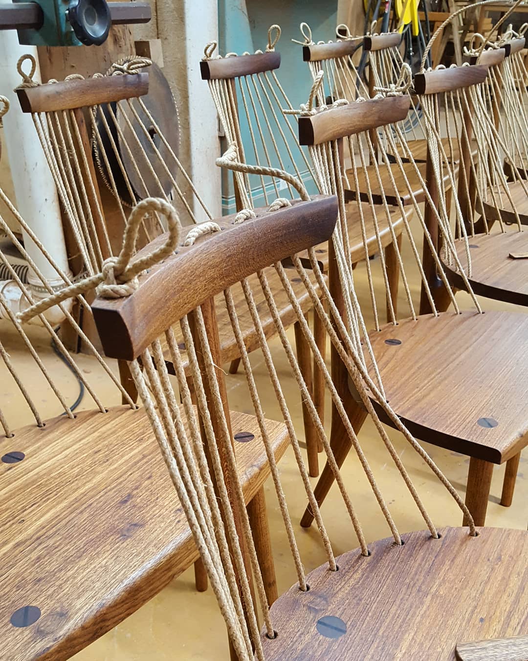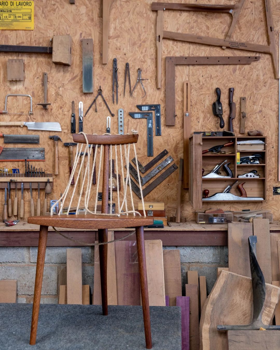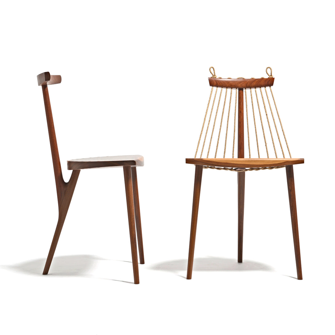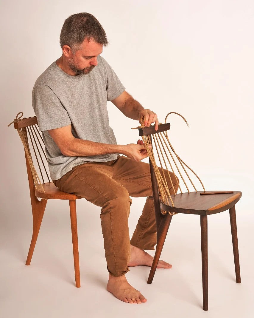 Esta cadeira contemporânea é uma peça de mobiliário de três pernas, confortável e elegante, feita de madeira tropical brasileira e corda de fibra natural na oficina do artista. Sua singularidade é complementada por sua simplicidade e excelente artesanato. A forma do encosto é criada por uma corda, cuja tensão é gerada por uma alavanca que torce o cordão sob o assento, uma solução elegante, simples e muito eficaz. As pernas se encaixam com segurança no assento com articulações tradicionais de cunha. As cunhas são feitas de madeiras preciosas escuras ou madeira tropical clara. As cadeiras são assinadas e numeradas.