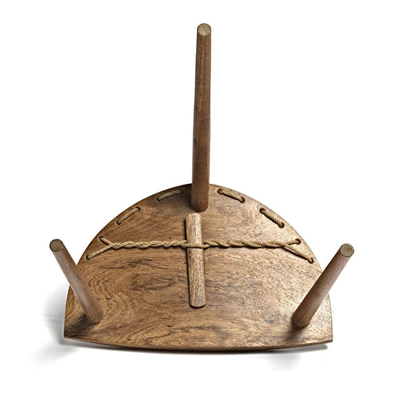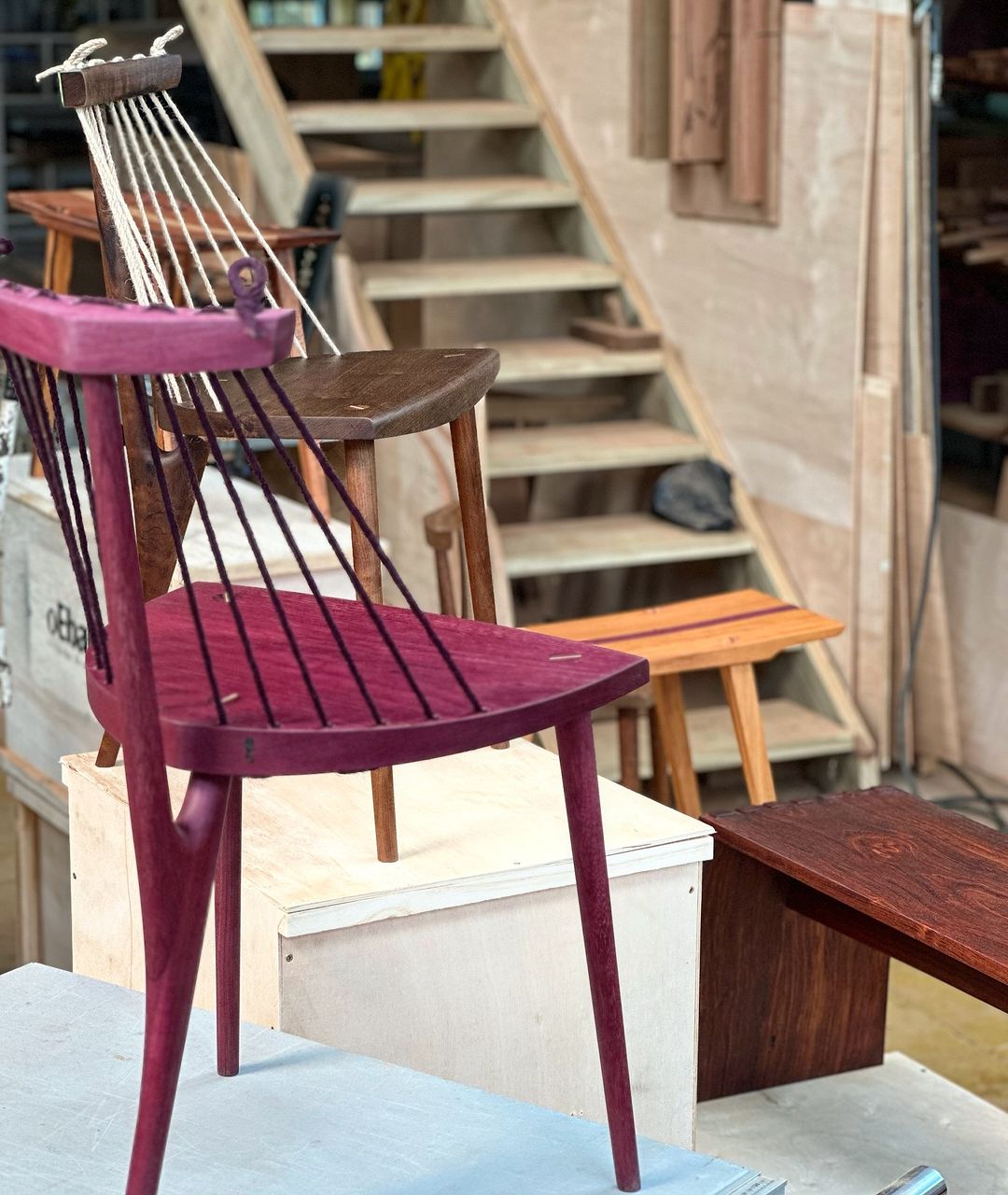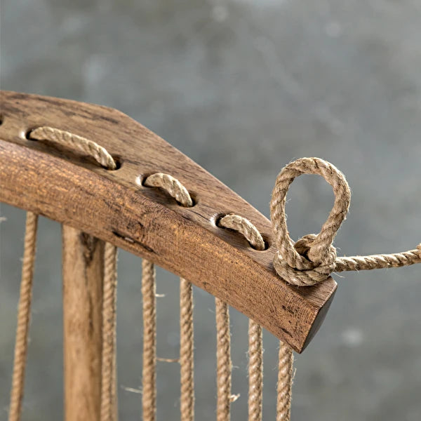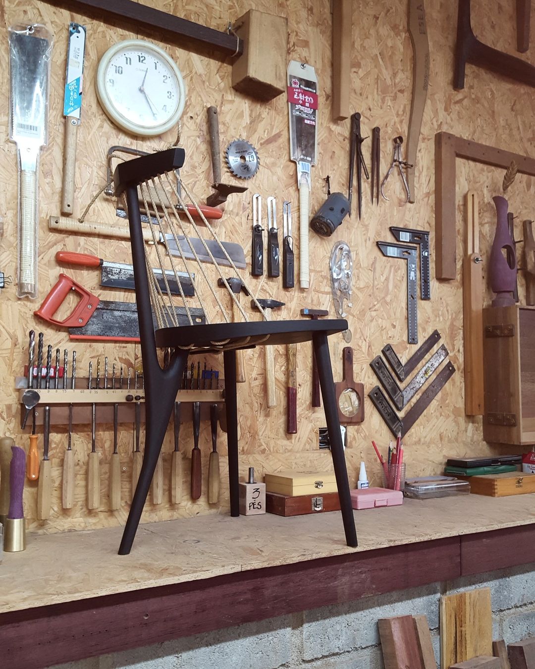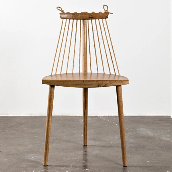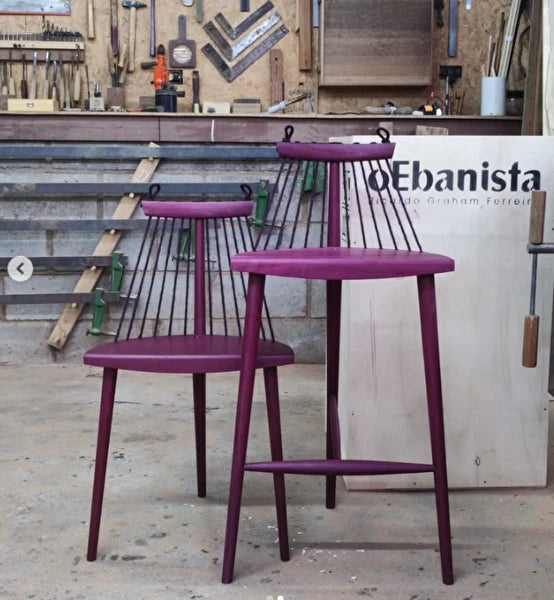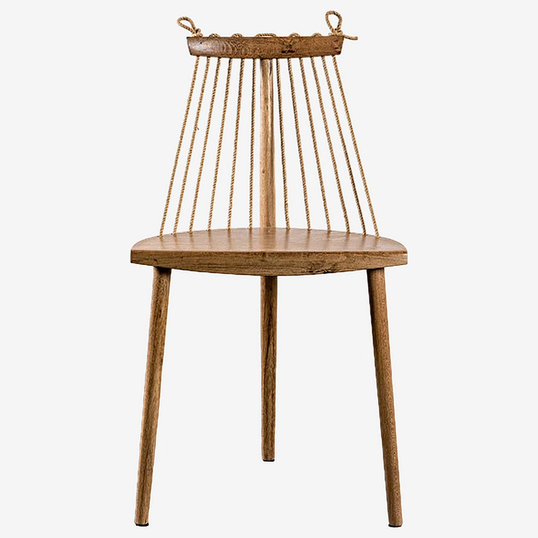 Esta cadeira contemporânea é uma peça de mobiliário de três pernas, confortável e elegante, feita de madeira tropical brasileira e corda de fibra natural na oficina do artista. Sua singularidade é complementada por sua simplicidade e excelente artesanato. A forma do encosto é criada por uma corda, cuja tensão é gerada por uma alavanca que torce o cordão sob o assento, uma solução elegante, simples e muito eficaz. As pernas se encaixam com segurança no assento com articulações tradicionais de cunha. As cunhas são feitas de madeiras preciosas escuras ou madeira tropical clara. As cadeiras são assinadas e numeradas.