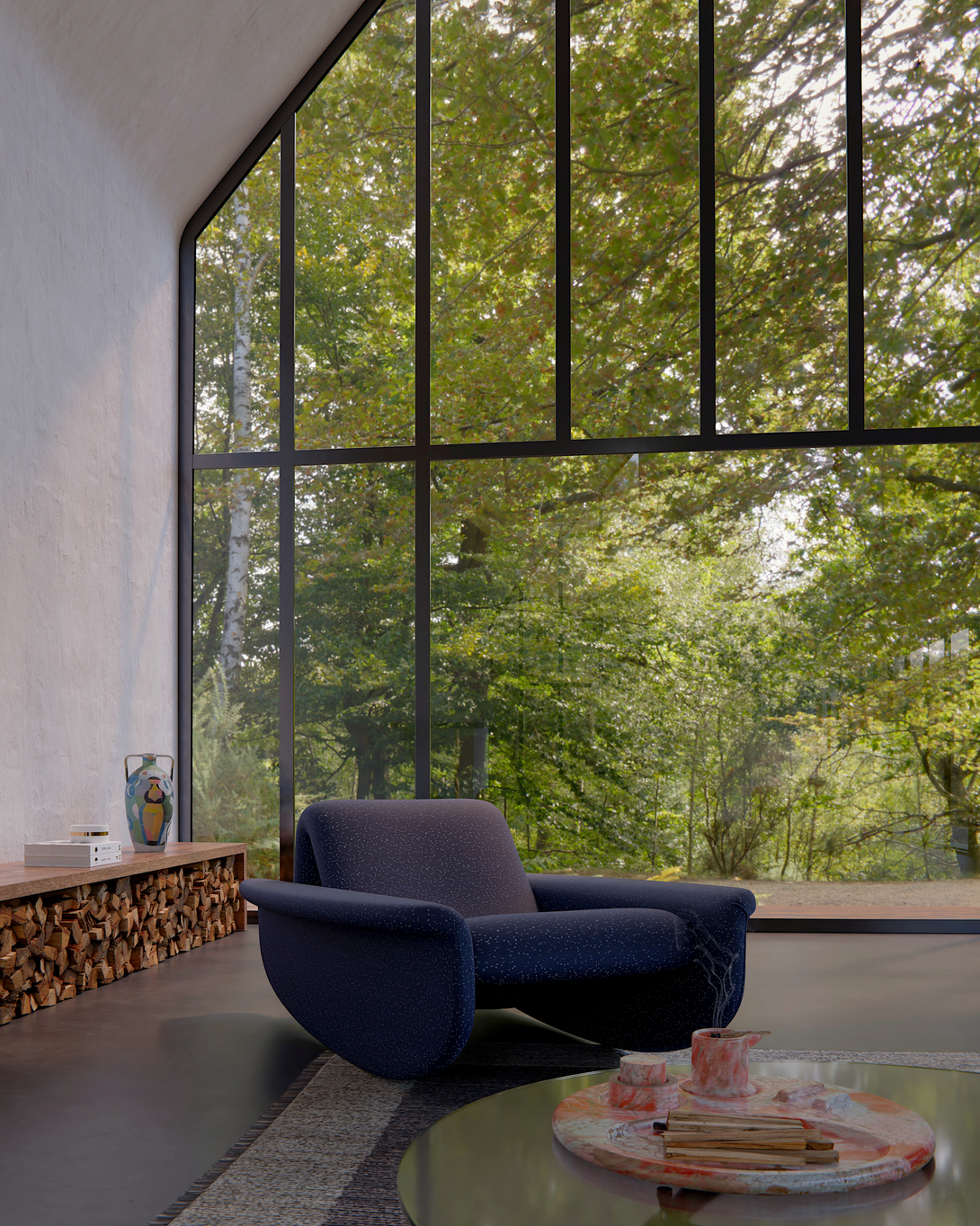 A Canoa é uma poltrona de balanço que balança suavemente como o mar, evocando a sensação de estar nas águas. Seu design é curvo e sinuoso, e seu assento tem um ângulo aconchegante onde o corpo pode reclinar, relaxar e se afastar. A altura permite um movimento suave para frente e para trás, e os pés, próximos ao chão, fornecem estabilidade ao ritmo — como dois remos, adicionando fluidez ou pausa ao descanso. Também há tranquilidade nas águas. O estofamento é coberto com tecido WE-KNIT — uma malha 3D feita de PET reciclado, proveniente de garrafas coletadas dos oceanos.