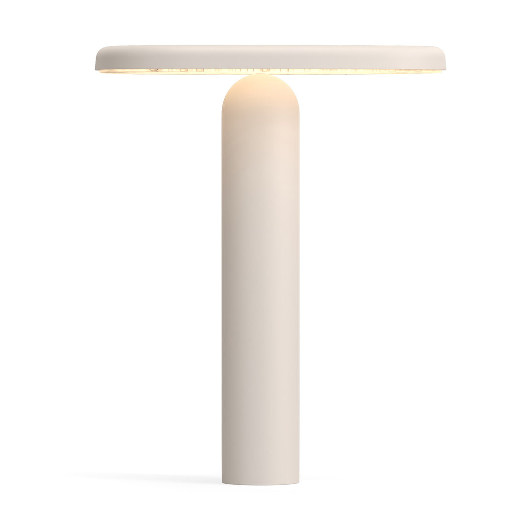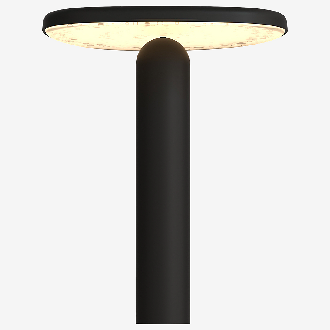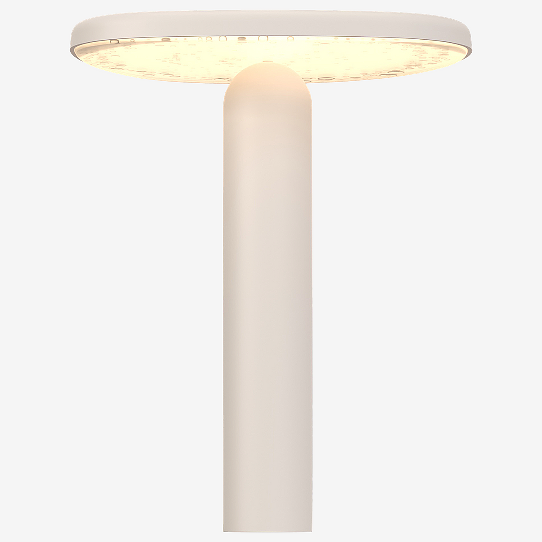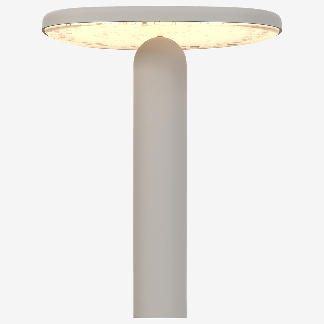 A luminária oferece iluminação difusa e possui corpo feito em alumínio, disponível em pintura líquida fosca com verniz soft-touch para as versões Off White, Off Black e Cement, ou verniz alto brilho para a versão Café. Inclui um difusor de vidro transparente, feito por meio de um processo de fundição artesanal. Um interruptor de botão localizado na base permite uma função de dimmer de 3 etapas, e a luminária vem com um LED integrado.