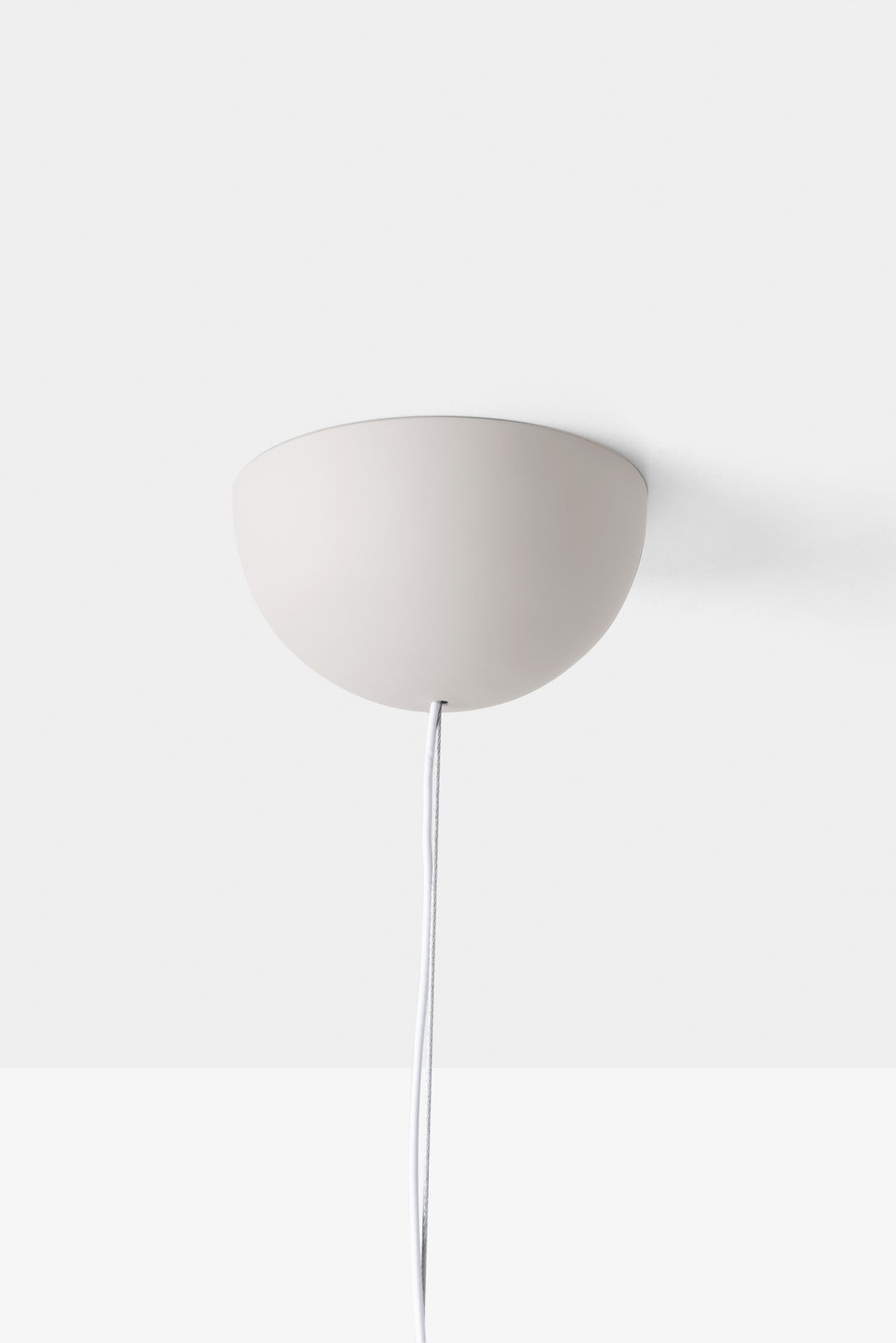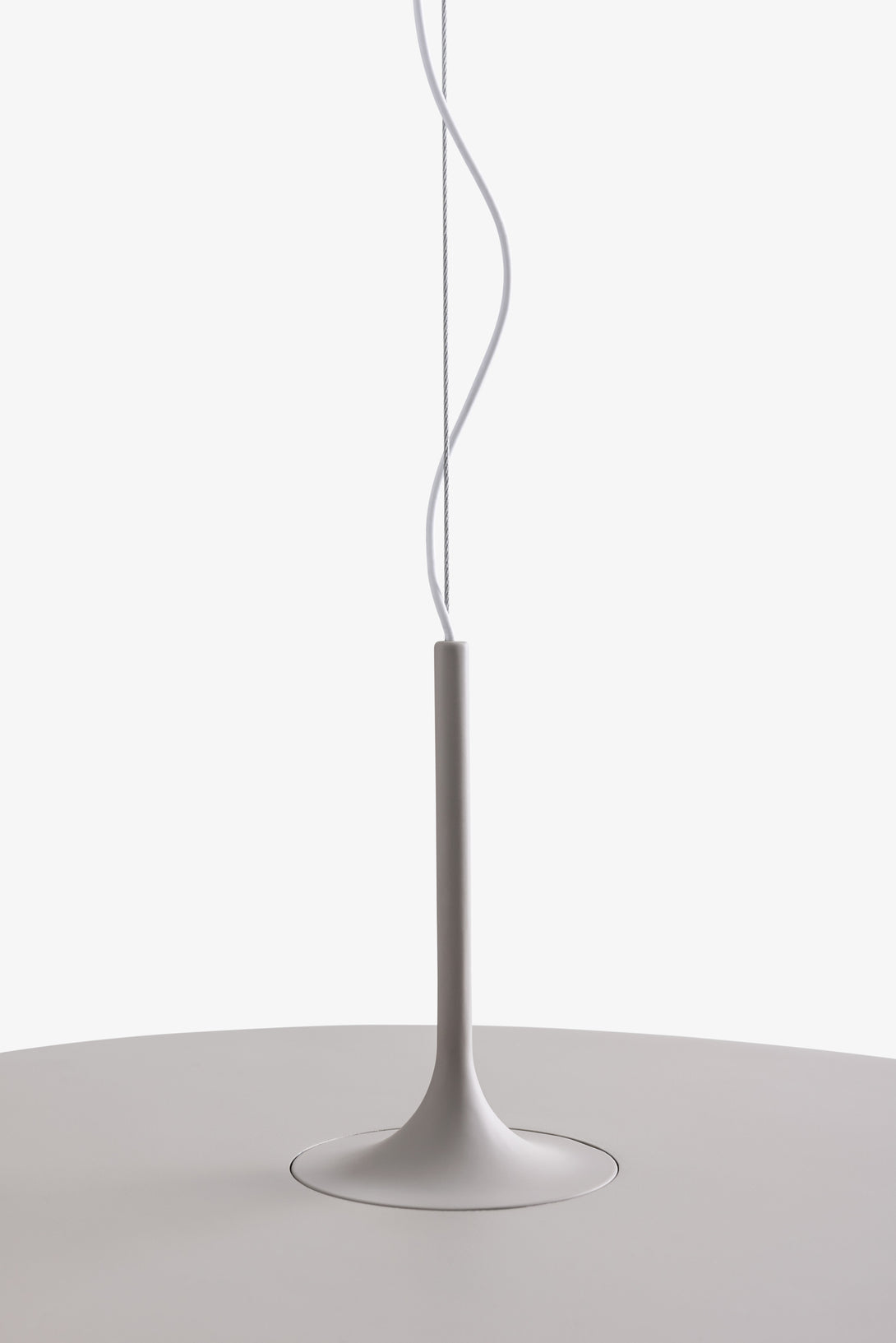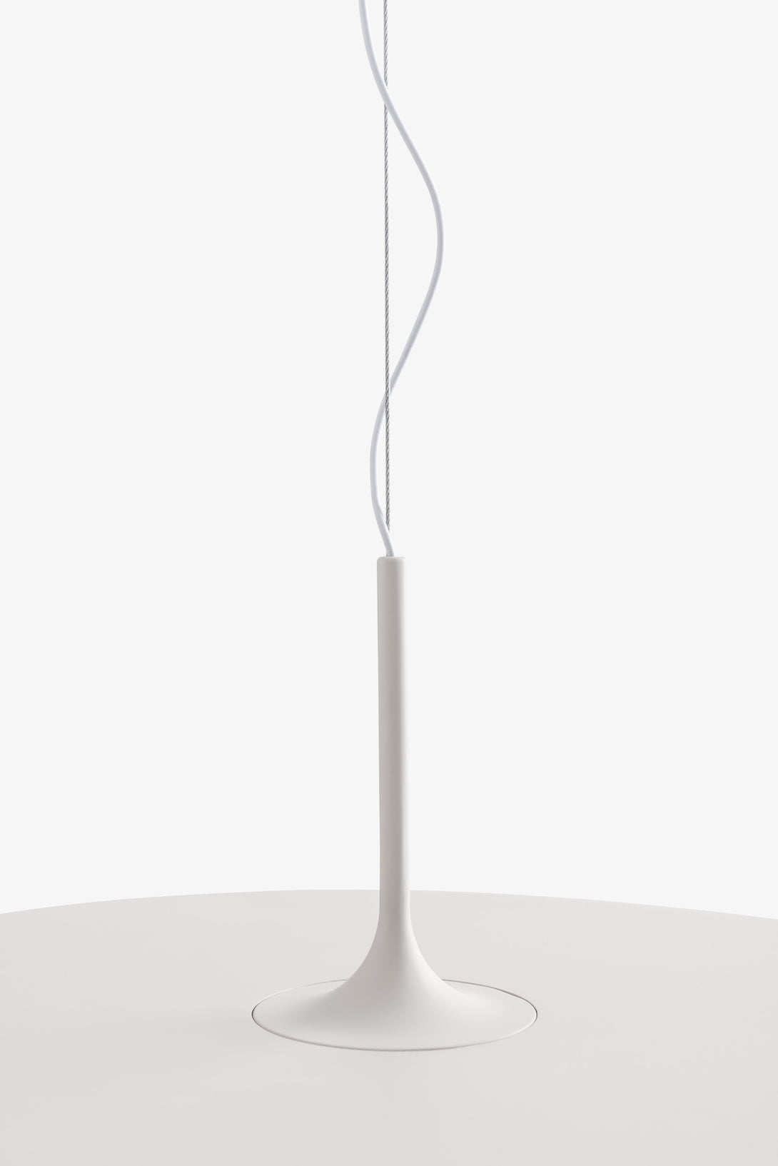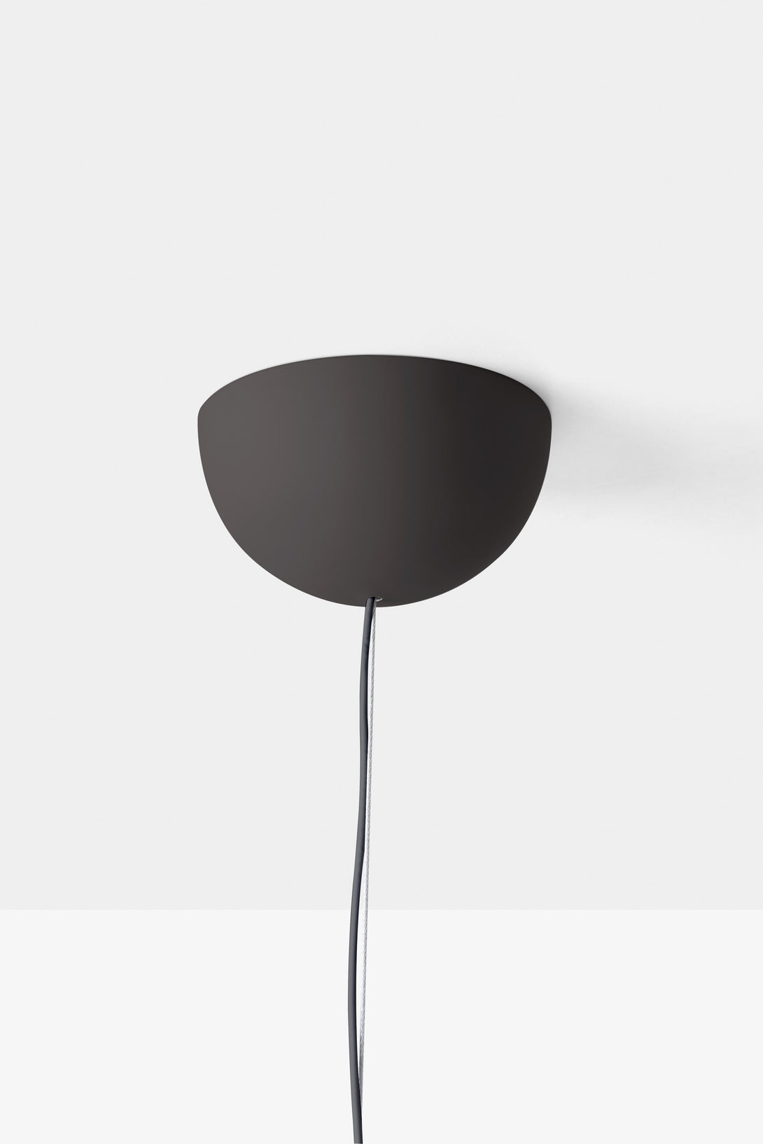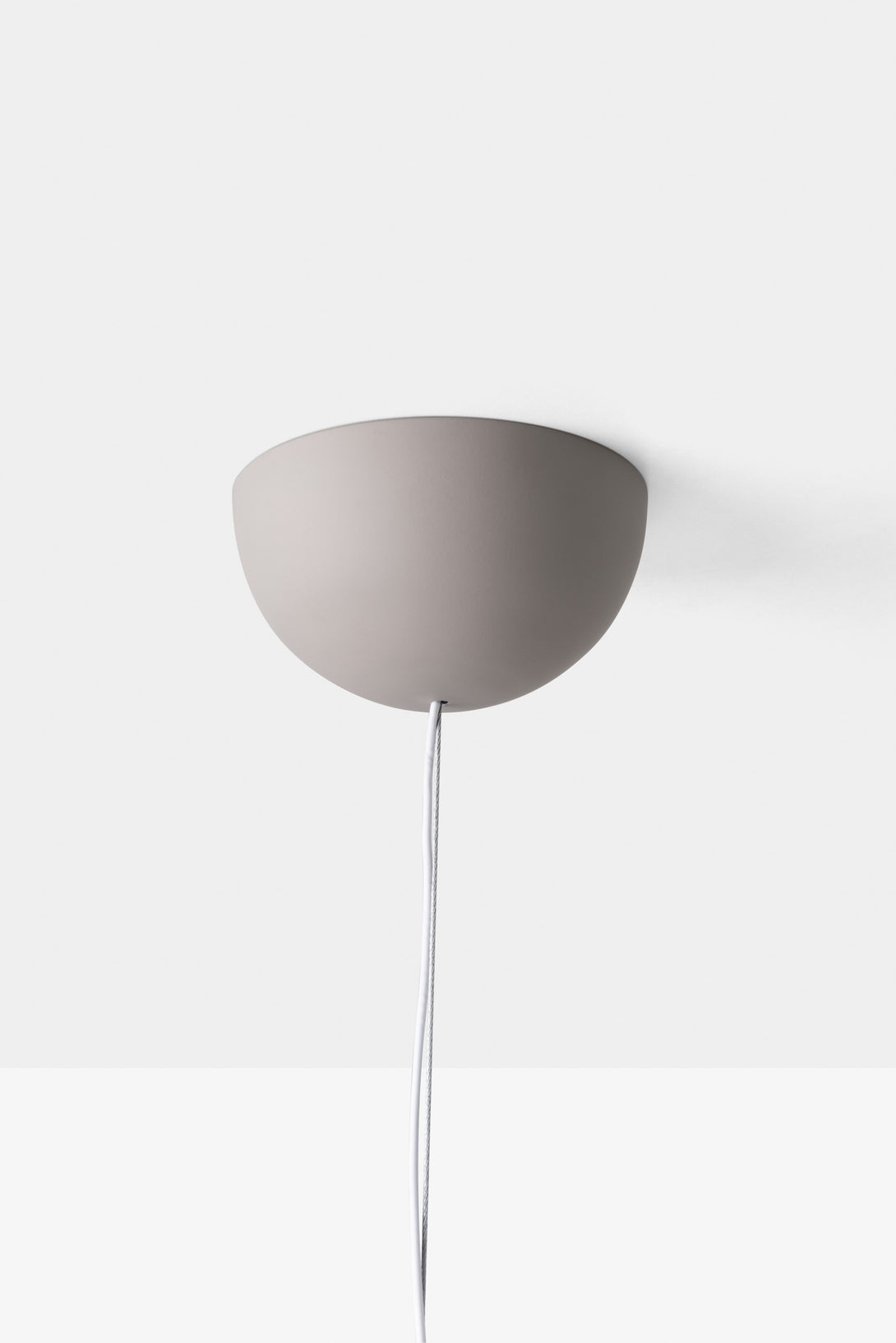 Luminária pendente que oferece luz difusa. O corpo é feito de alumínio com acabamento em tinta líquida fosca e verniz soft-touch disponível nas versões Off White, Off Black e Cement, ou verniz de alto brilho para a versão Café. Possui um difusor de vidro transparente feito por meio de um processo de fundição artesanal e inclui um LED integrado.