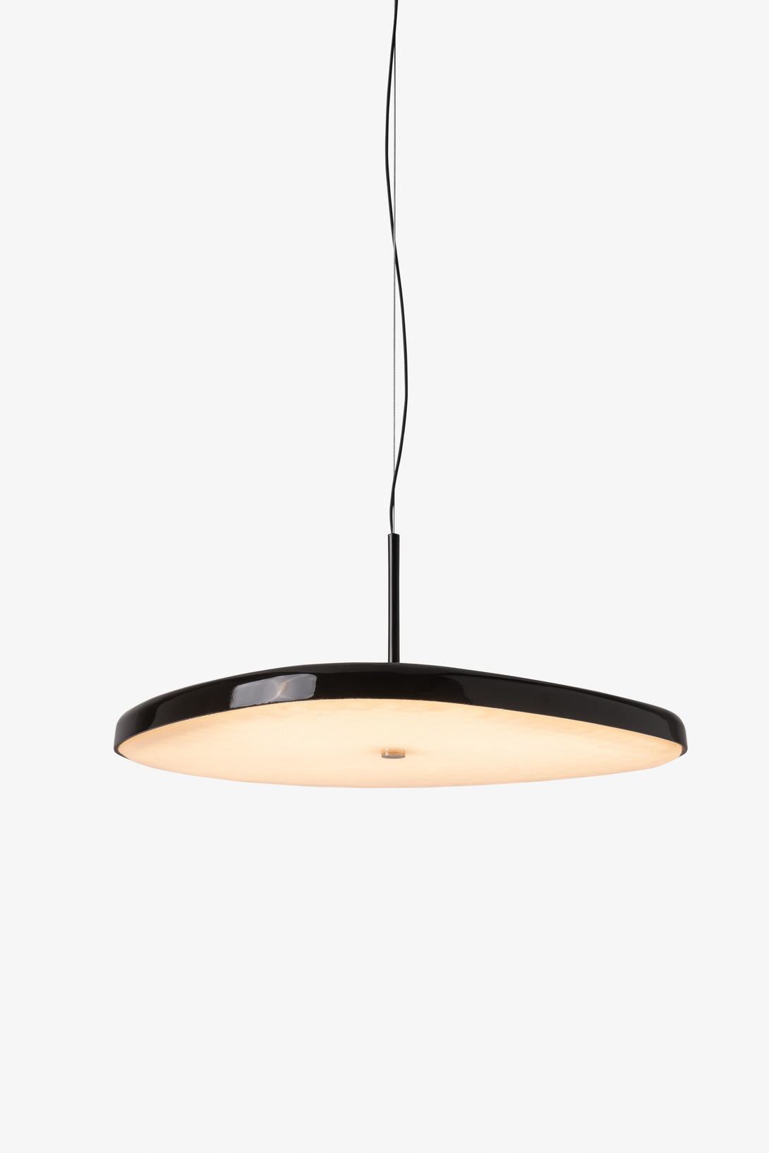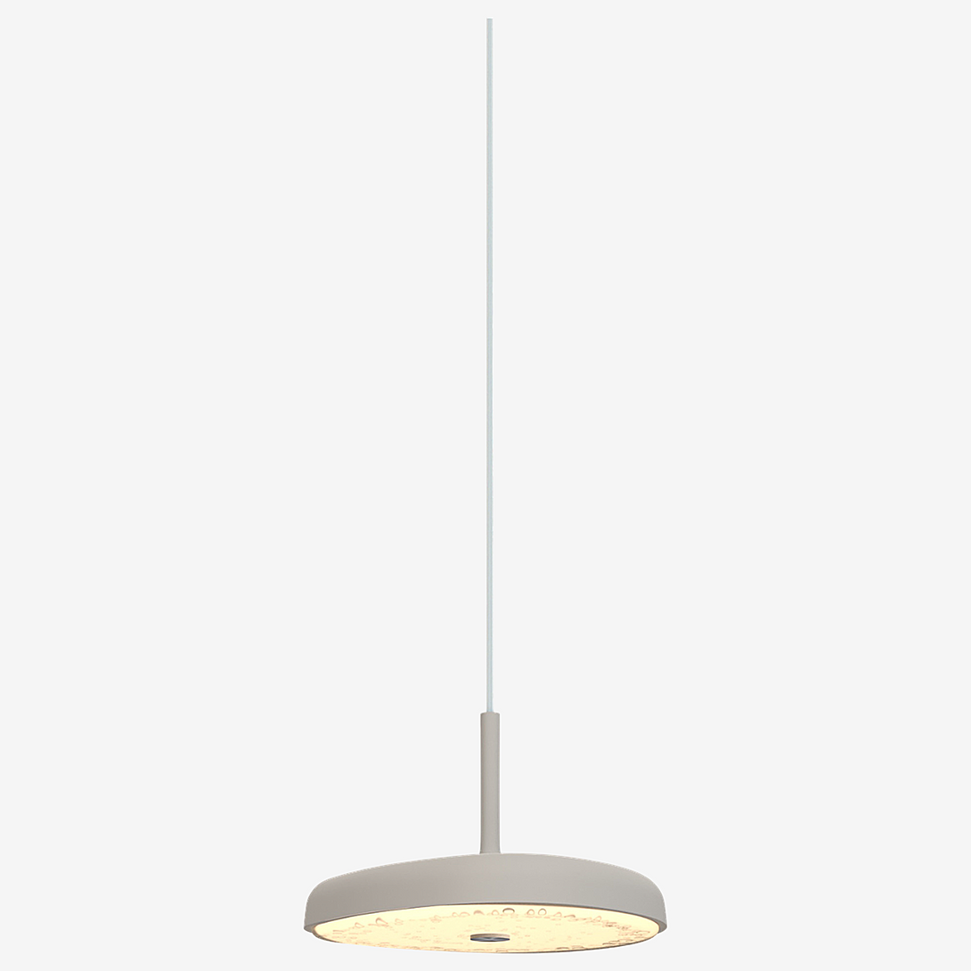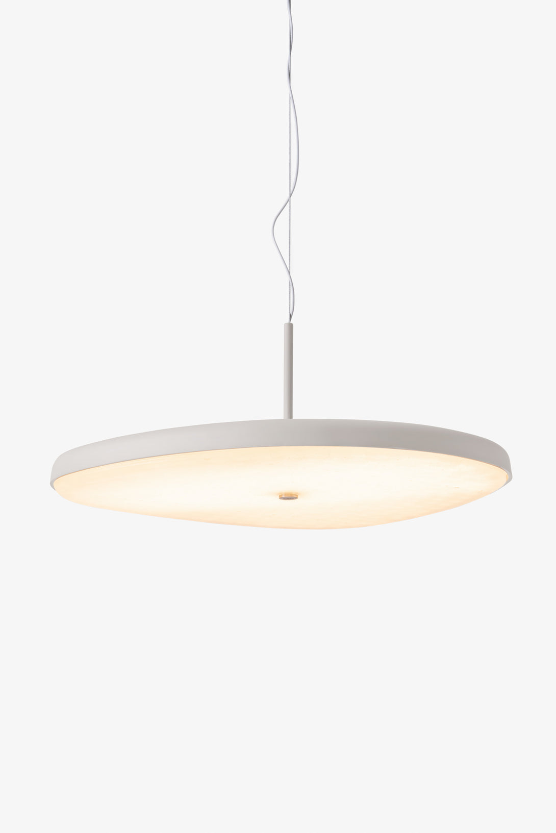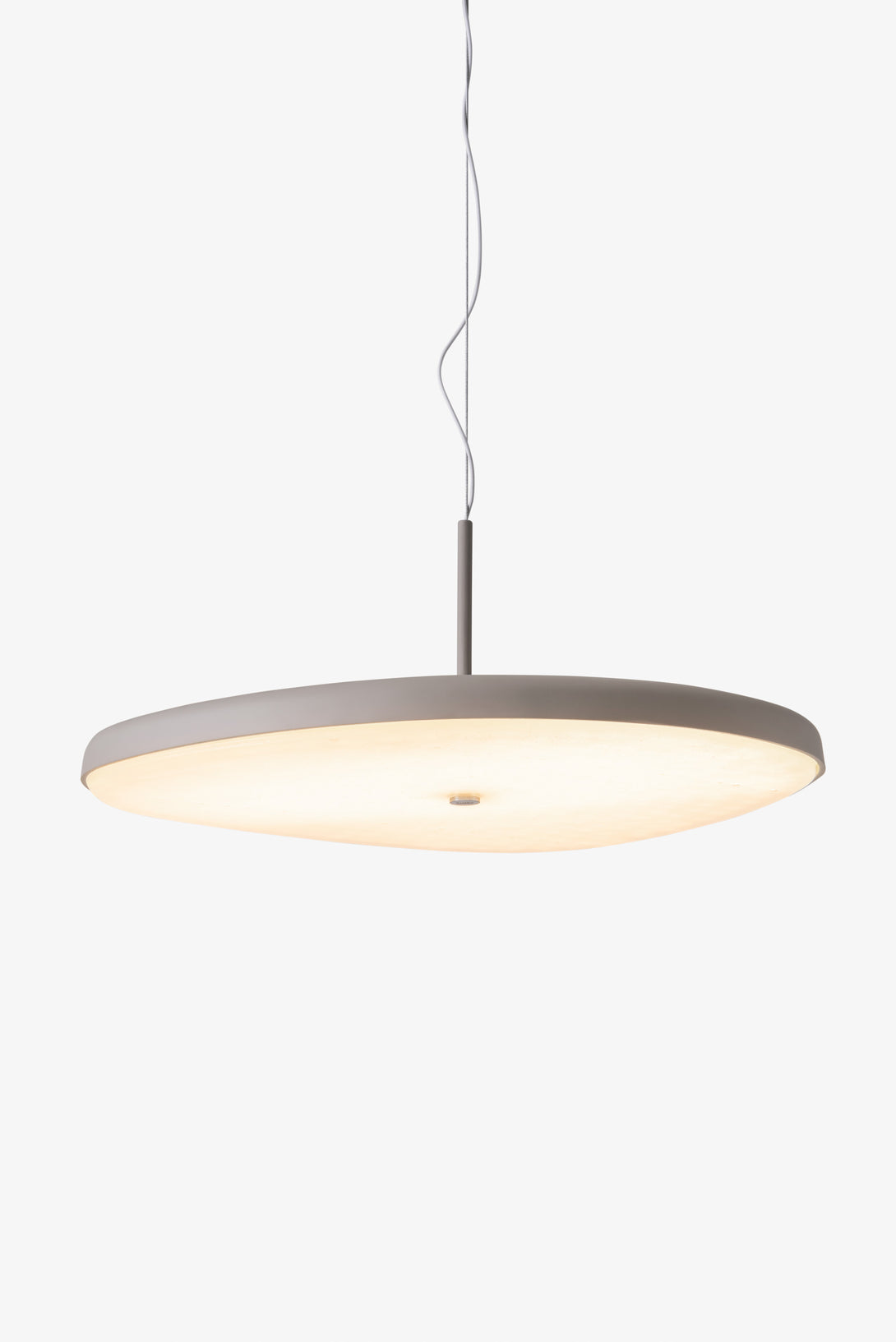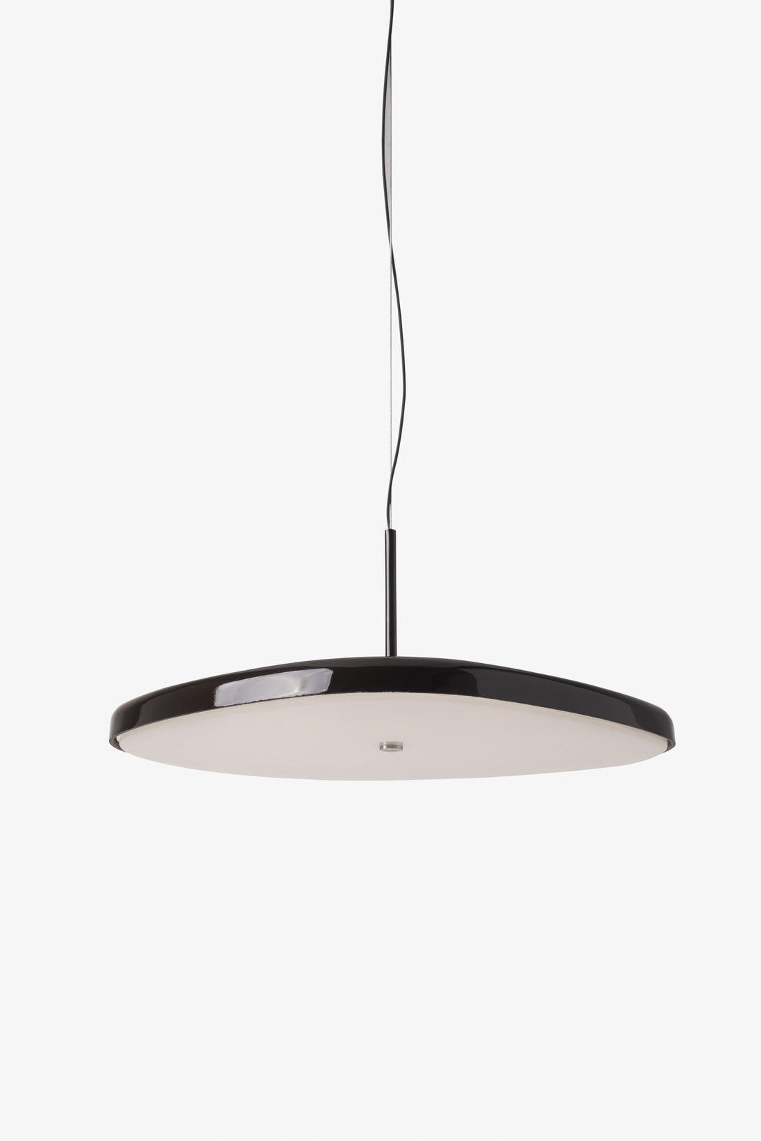 Luminária pendente que oferece luz difusa. O corpo é feito de alumínio com acabamento em tinta líquida fosca e verniz soft-touch disponível nas versões Off White, Off Black e Cement, ou verniz de alto brilho para a versão Café. Possui um difusor de vidro transparente feito por meio de um processo de fundição artesanal e inclui um LED integrado.