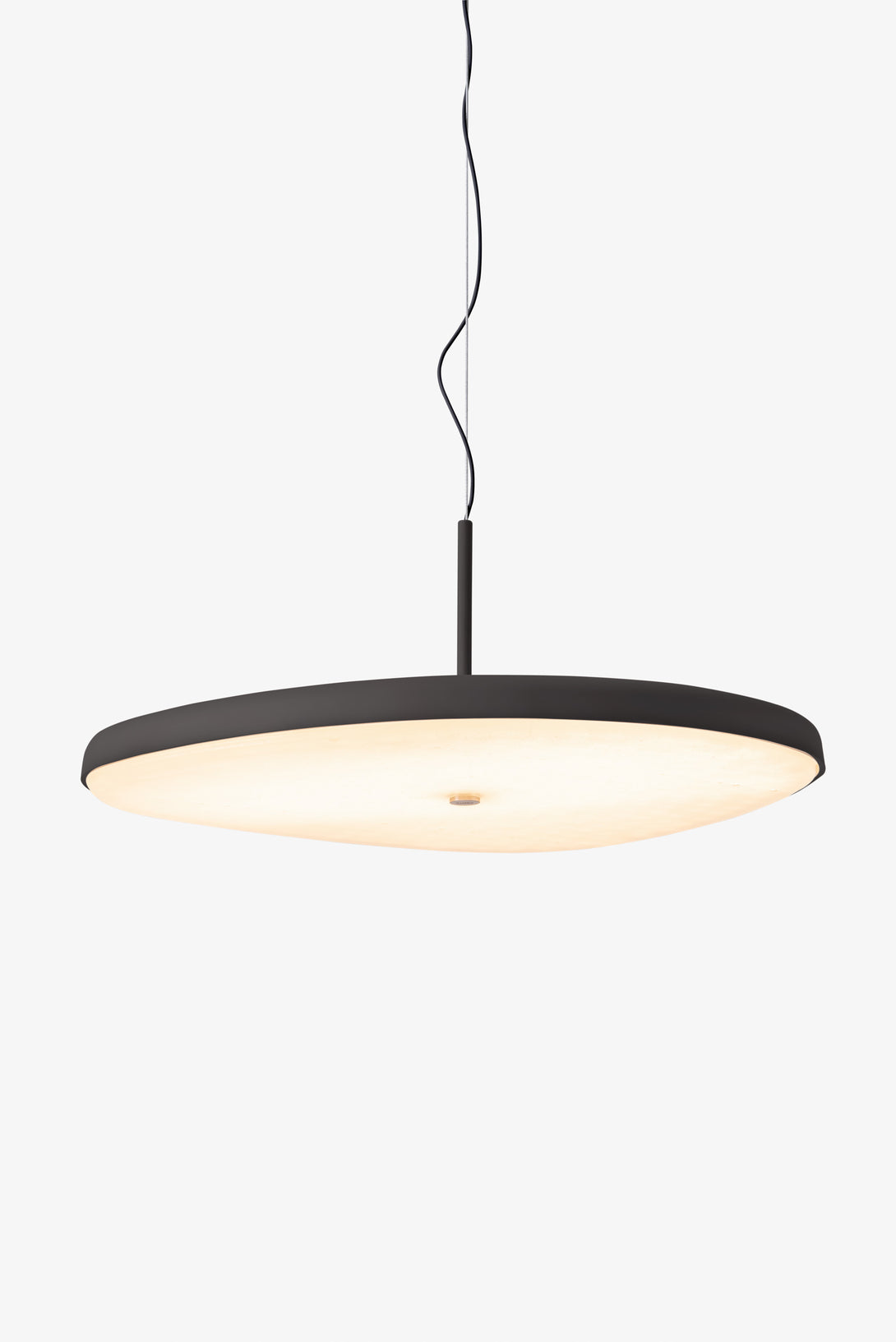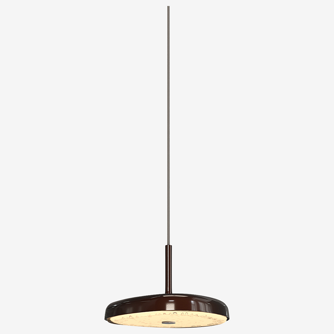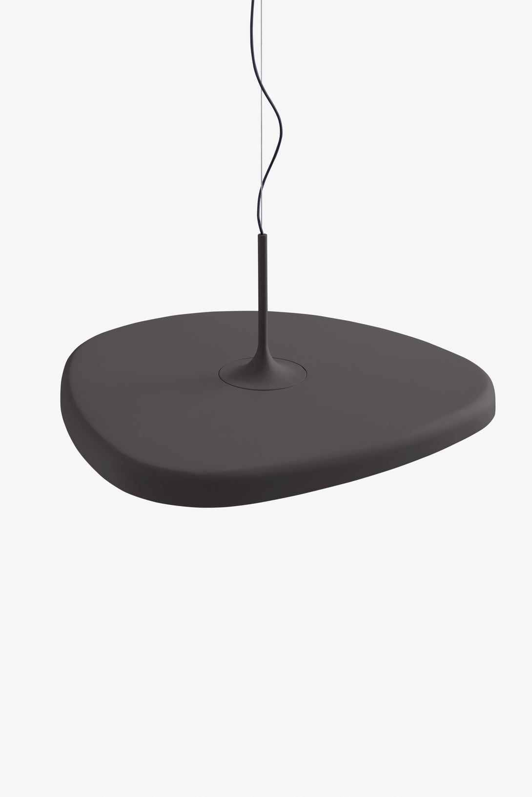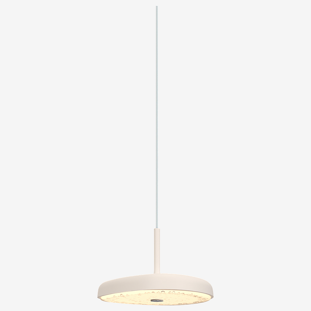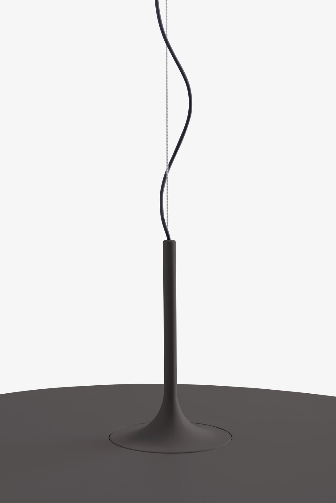 Luminária pendente que oferece luz difusa. O corpo é feito de alumínio com acabamento em tinta líquida fosca e verniz soft-touch disponível nas versões Off White, Off Black e Cement, ou verniz de alto brilho para a versão Café. Possui um difusor de vidro transparente feito por meio de um processo de fundição artesanal e inclui um LED integrado.