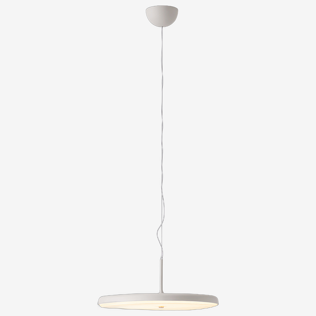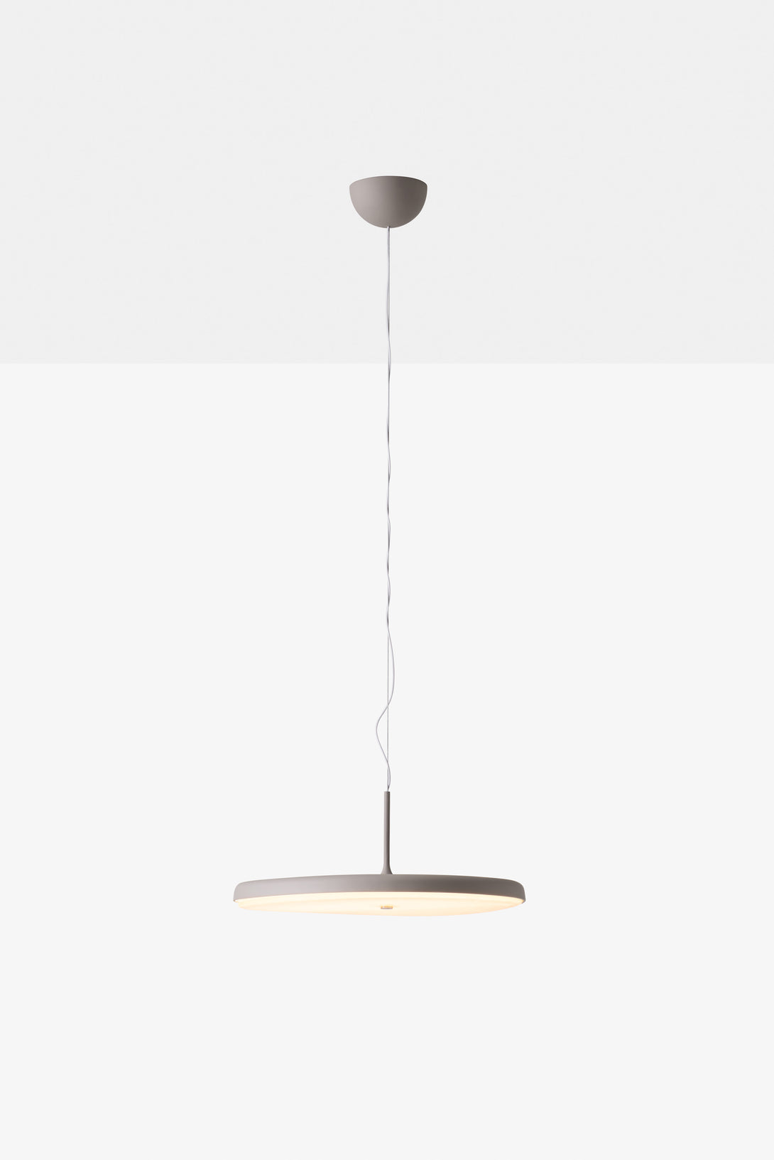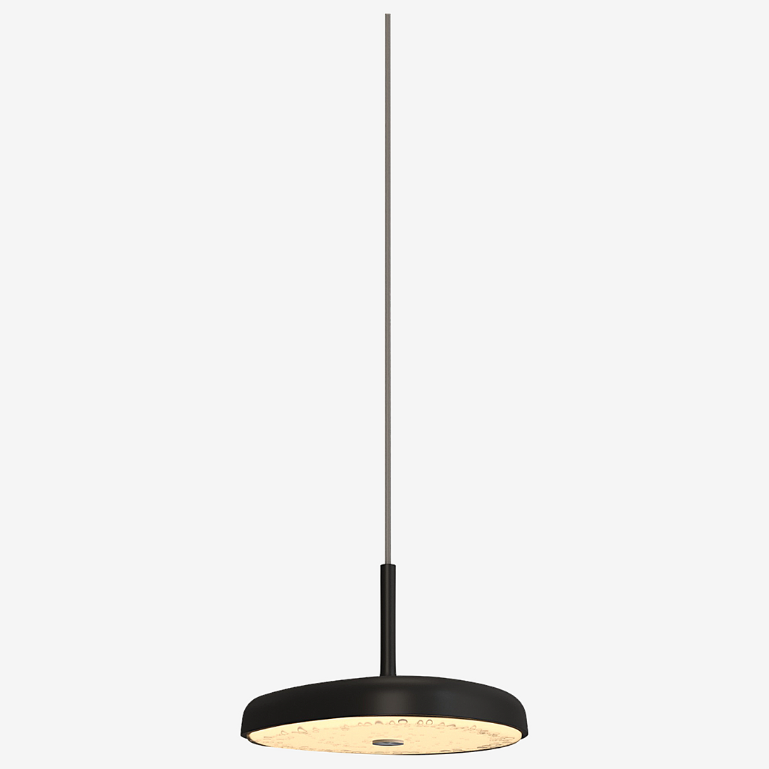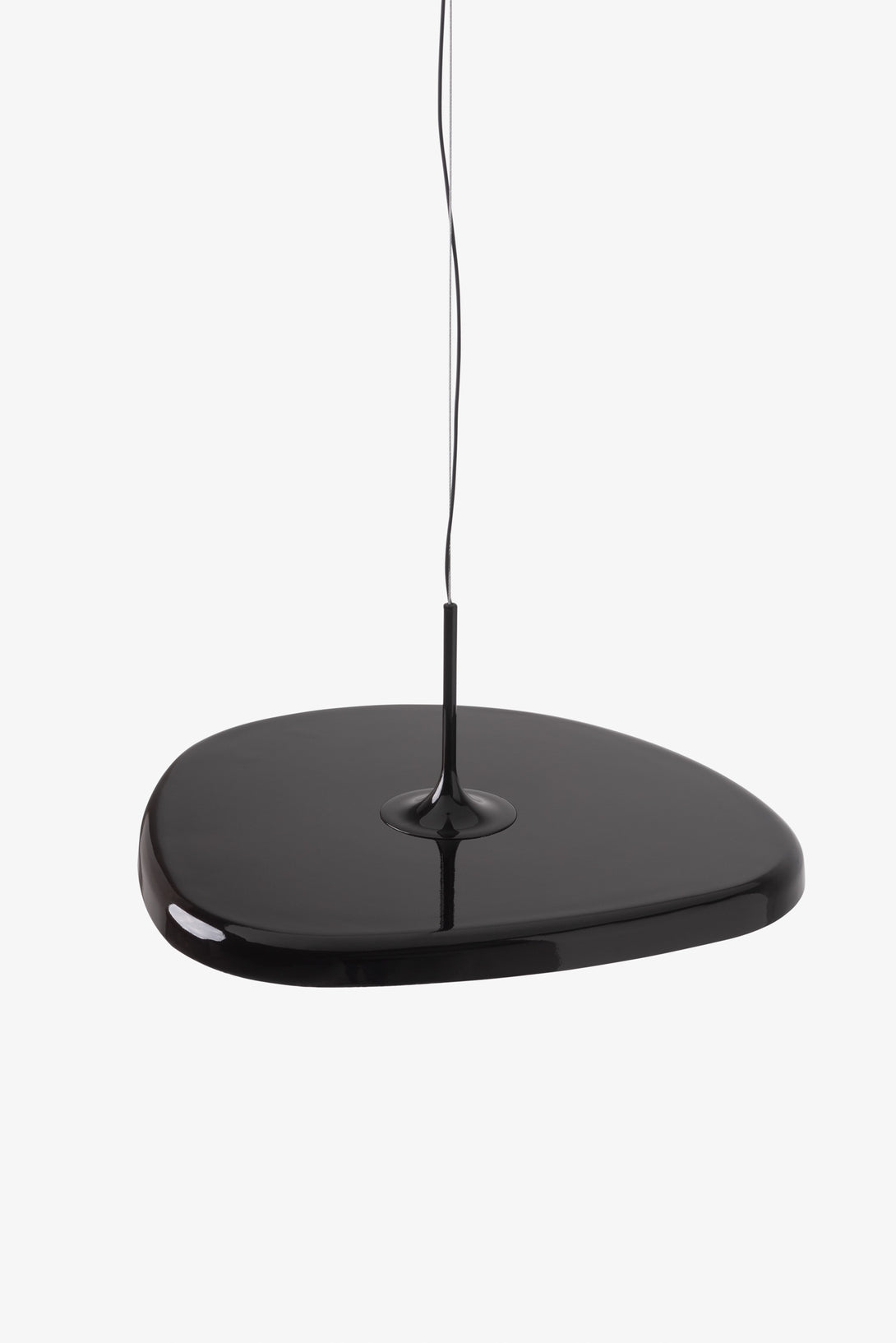 Luminária pendente que oferece luz difusa. O corpo é feito de alumínio com acabamento em tinta líquida fosca e verniz soft-touch disponível nas versões Off White, Off Black e Cement, ou verniz de alto brilho para a versão Café. Possui um difusor de vidro transparente feito por meio de um processo de fundição artesanal e inclui um LED integrado.