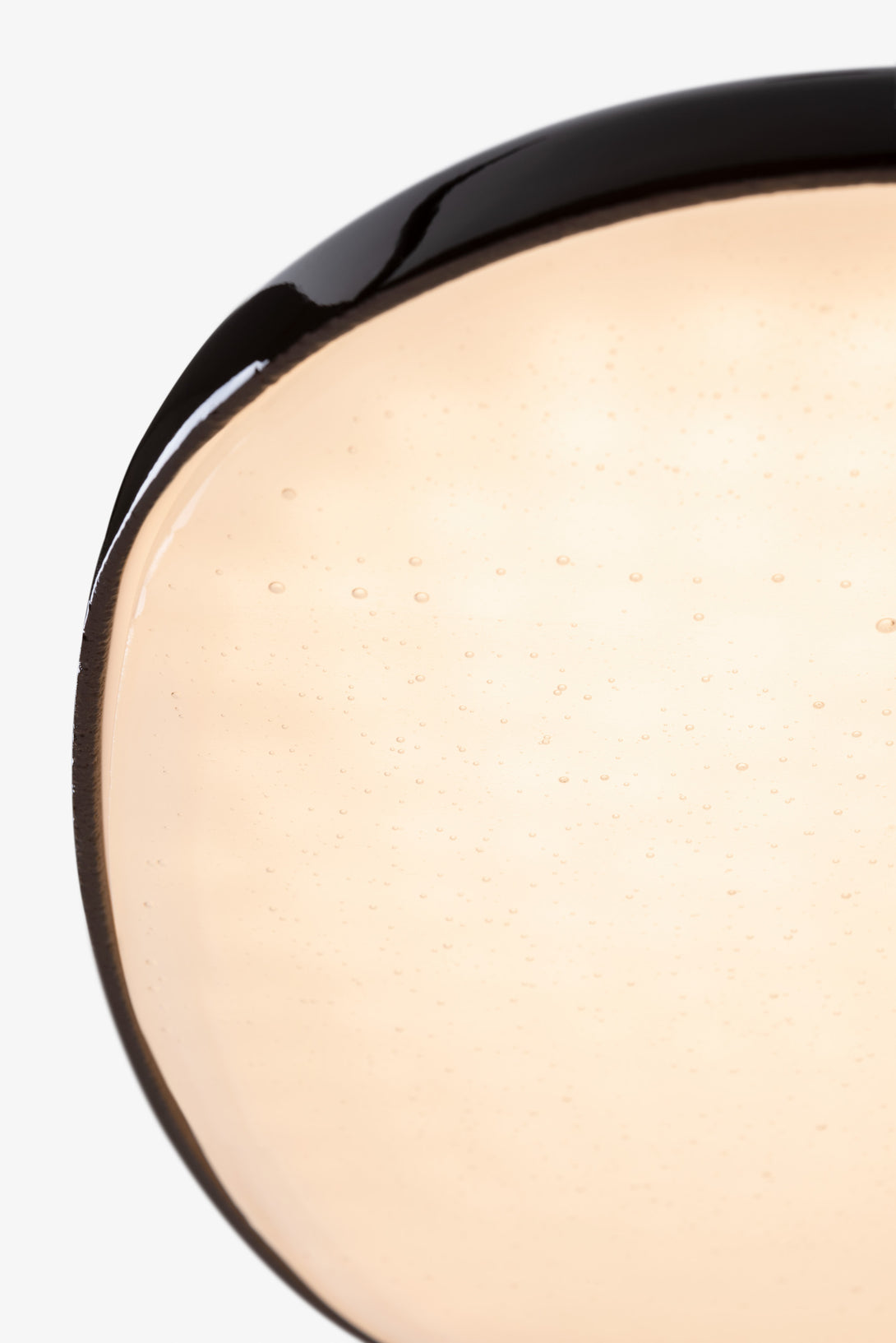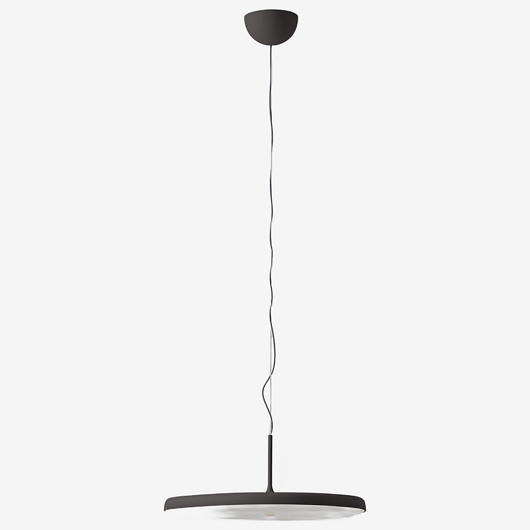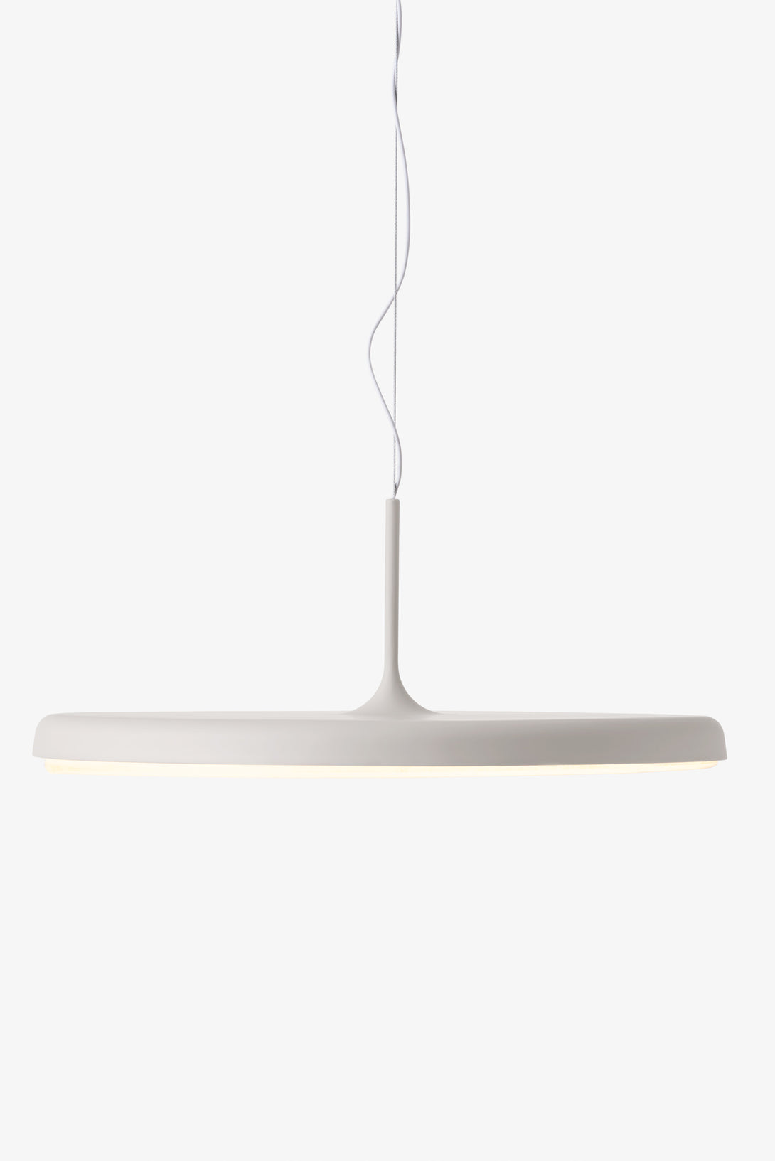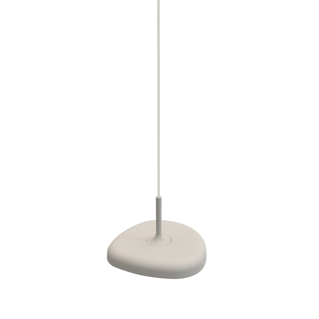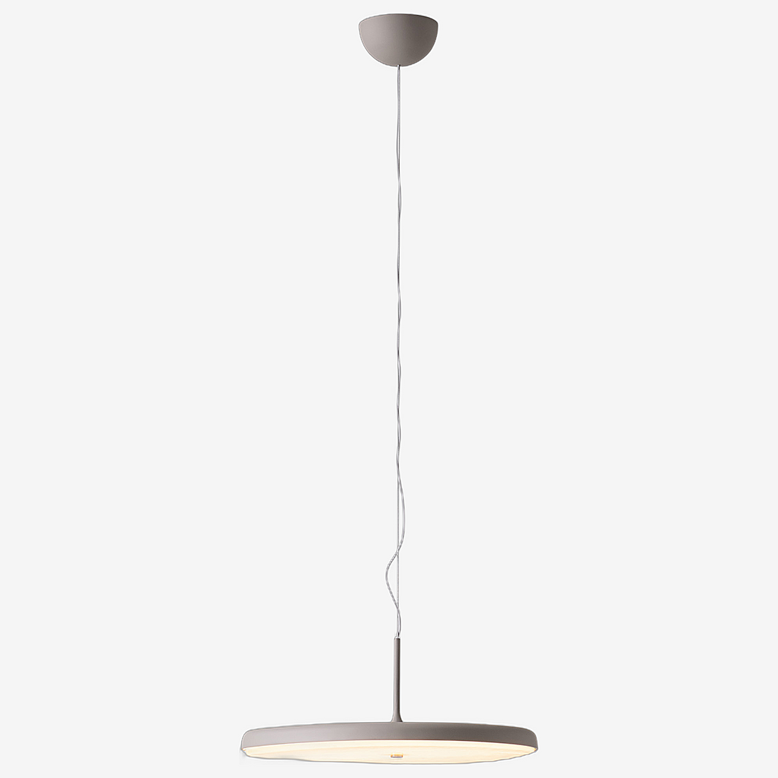 Luminária pendente que oferece luz difusa. O corpo é feito de alumínio com acabamento em tinta líquida fosca e verniz soft-touch disponível nas versões Off White, Off Black e Cement, ou verniz de alto brilho para a versão Café. Possui um difusor de vidro transparente feito por meio de um processo de fundição artesanal e inclui um LED integrado.