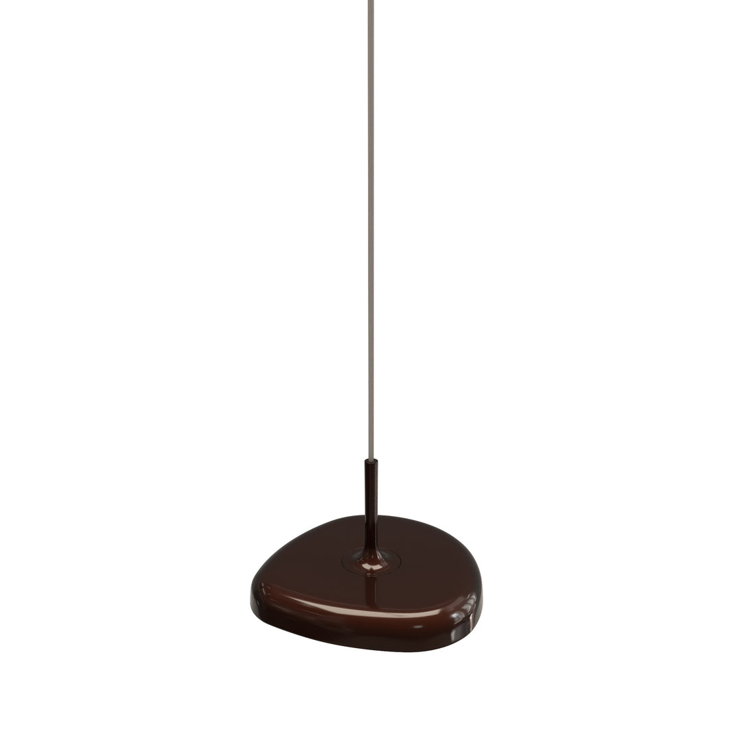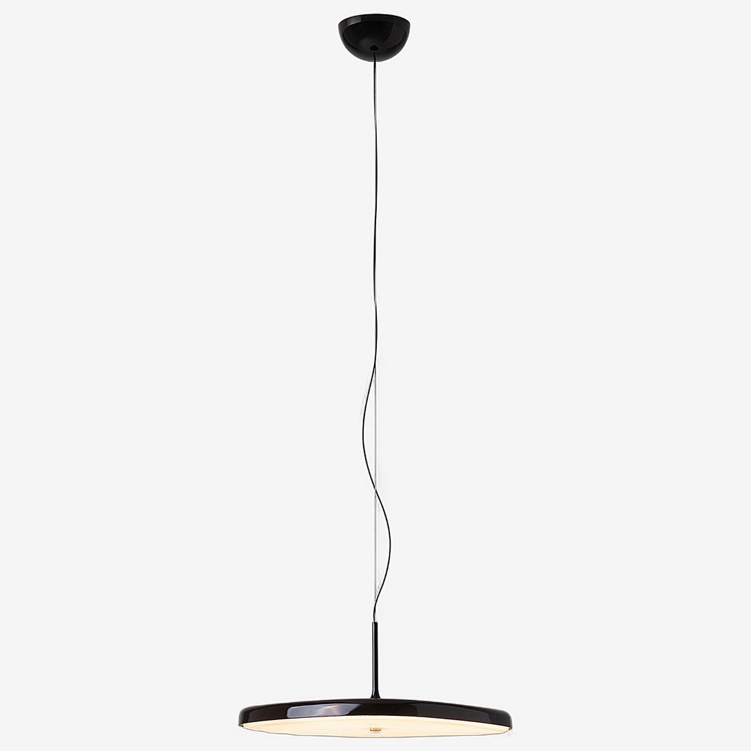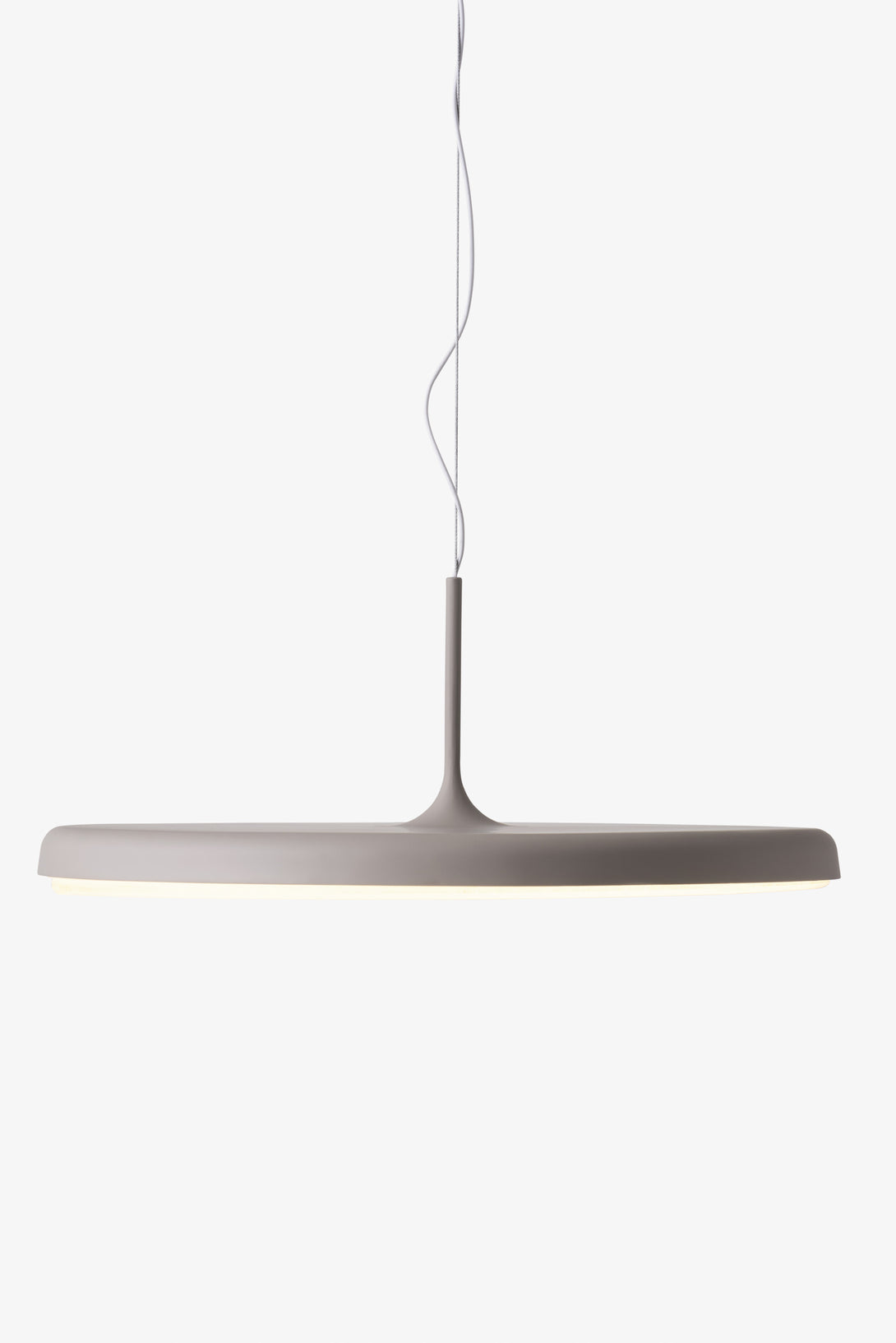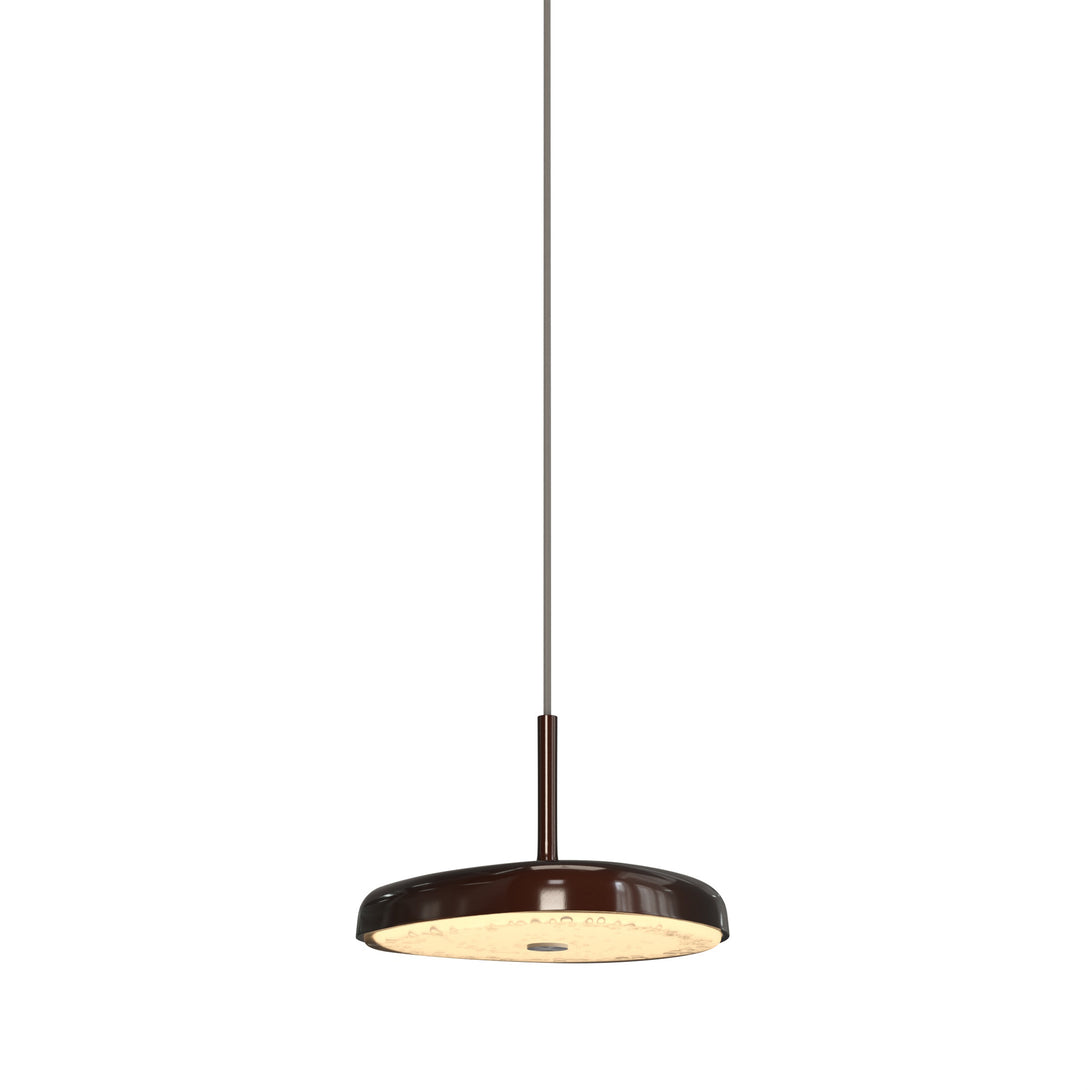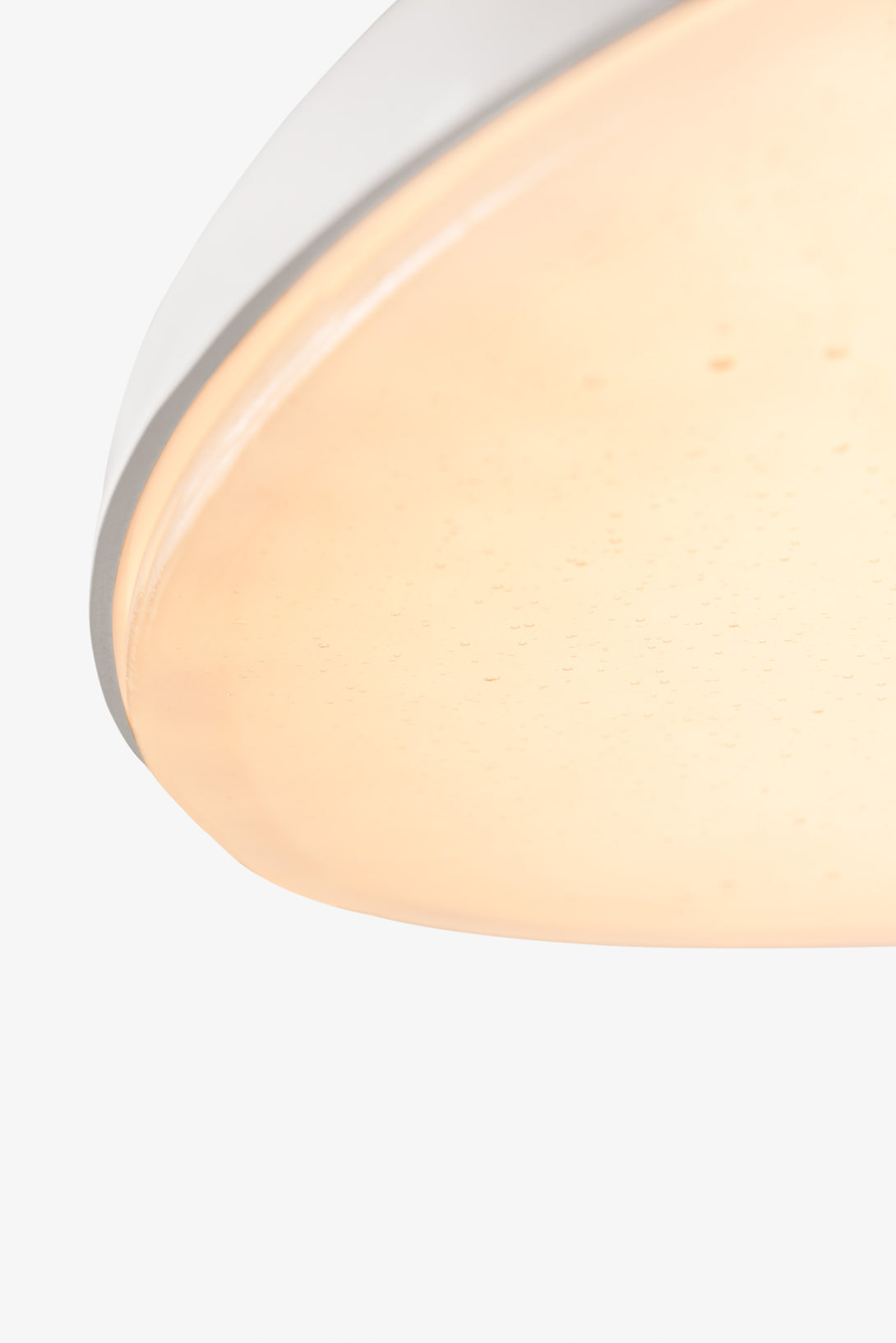 Luminária pendente que oferece luz difusa. O corpo é feito de alumínio com acabamento em tinta líquida fosca e verniz soft-touch disponível nas versões Off White, Off Black e Cement, ou verniz de alto brilho para a versão Café. Possui um difusor de vidro transparente feito por meio de um processo de fundição artesanal e inclui um LED integrado.