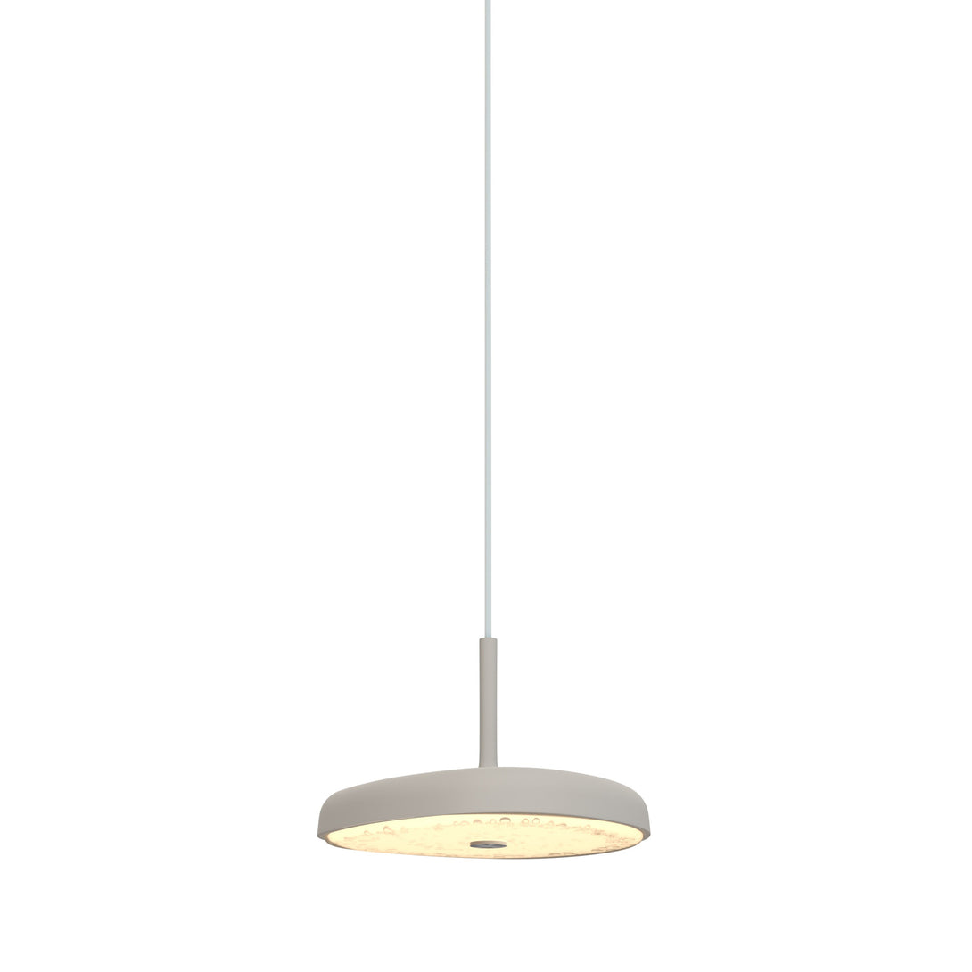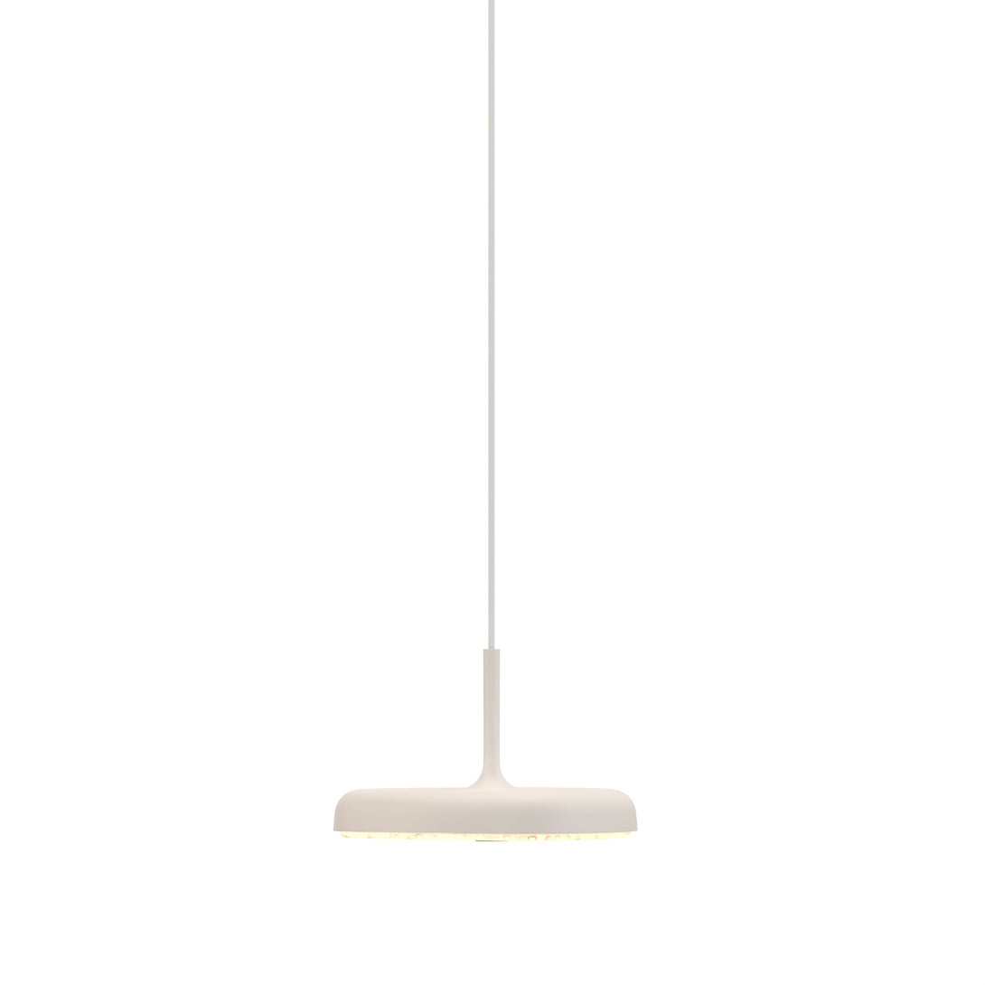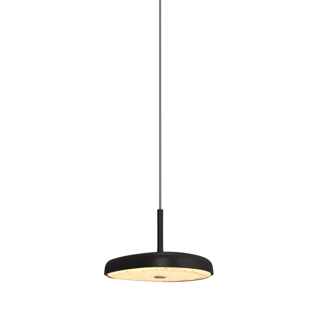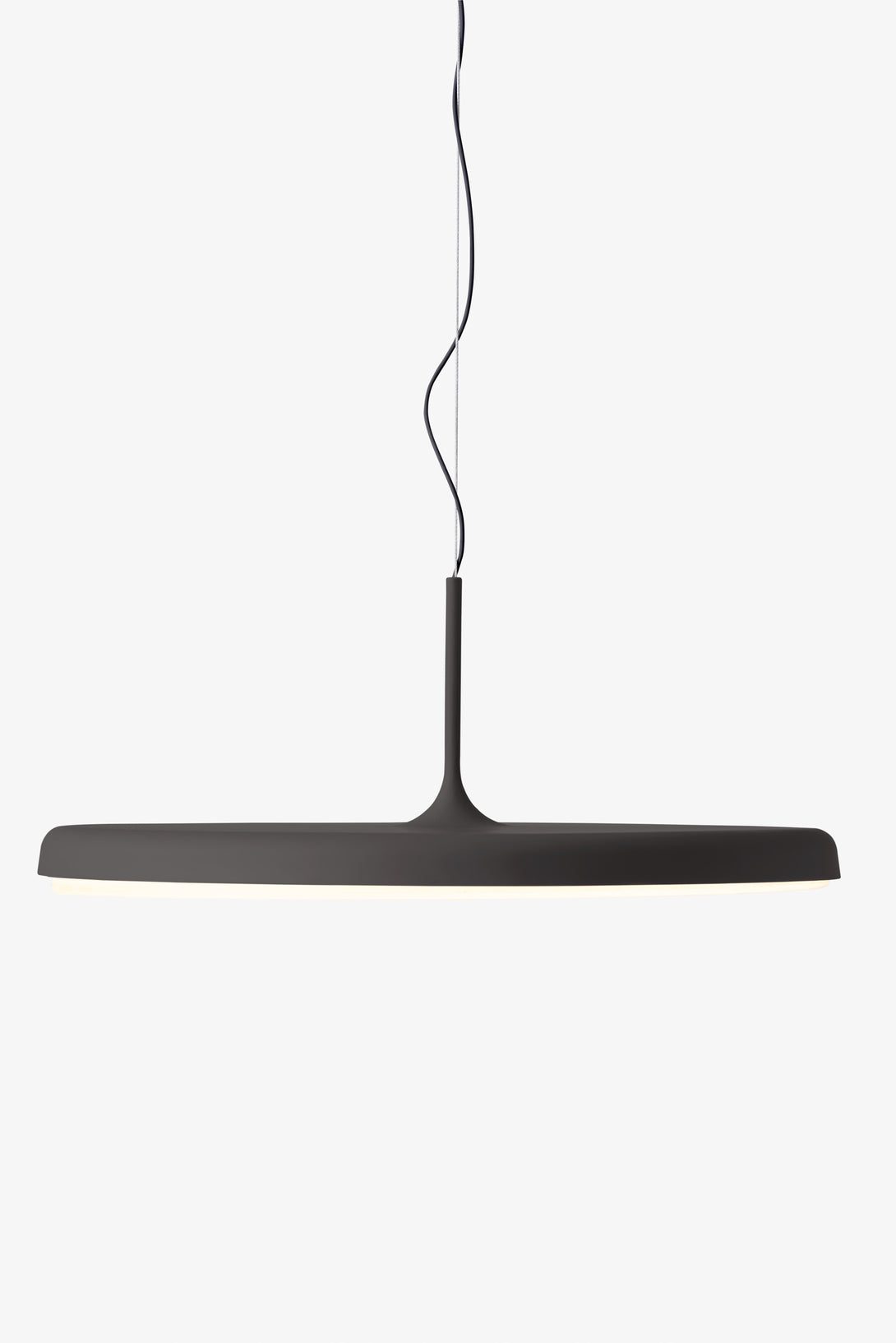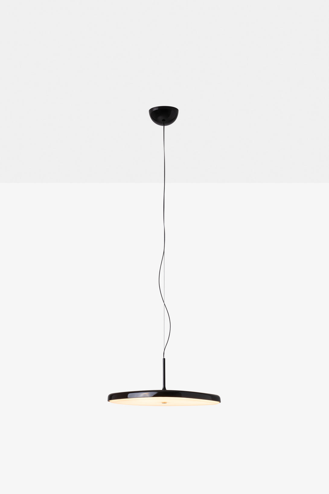 Luminária pendente que oferece luz difusa. O corpo é feito de alumínio com acabamento em tinta líquida fosca e verniz soft-touch disponível nas versões Off White, Off Black e Cement, ou verniz de alto brilho para a versão Café. Possui um difusor de vidro transparente feito por meio de um processo de fundição artesanal e inclui um LED integrado.