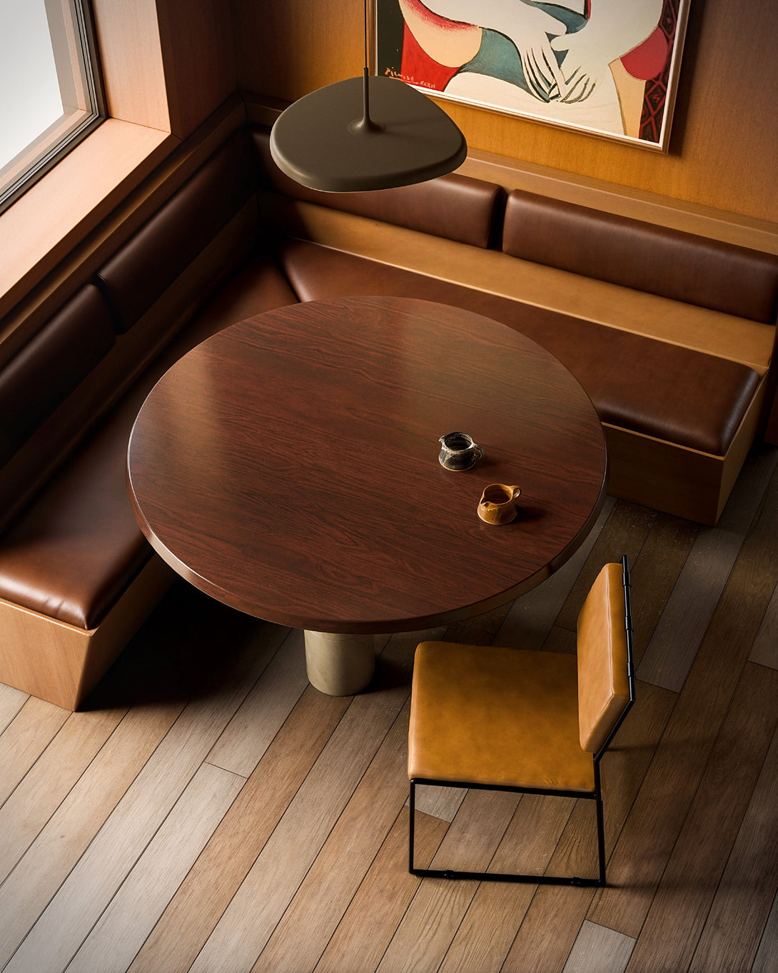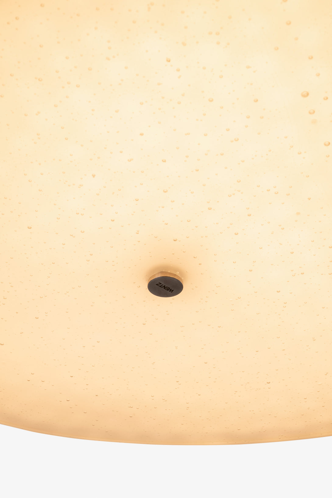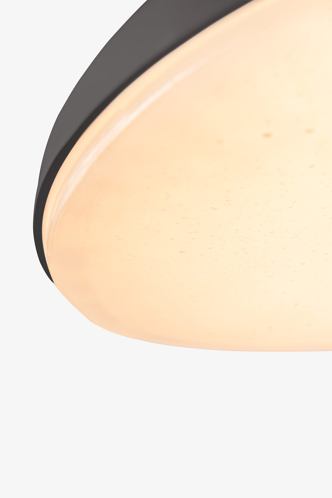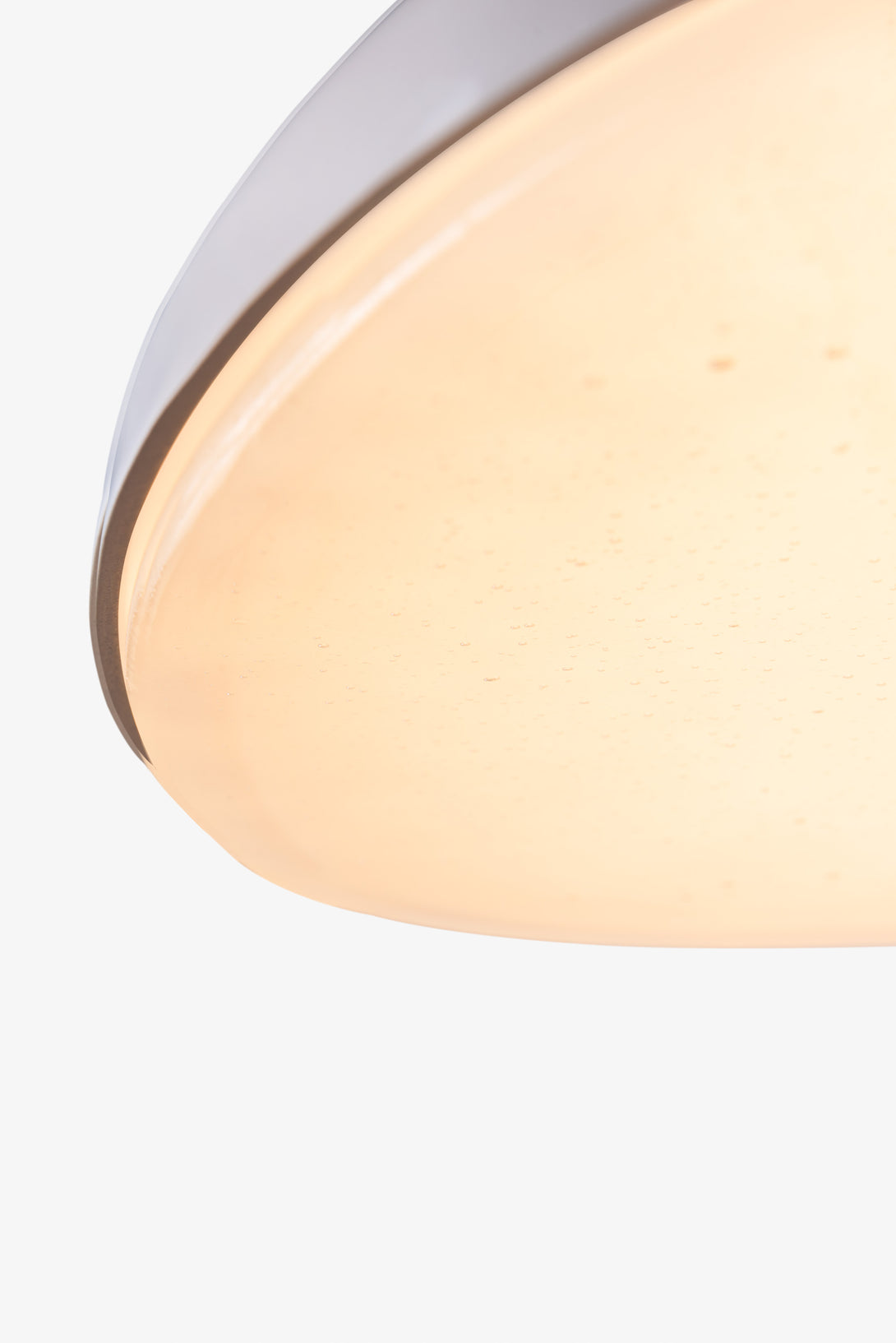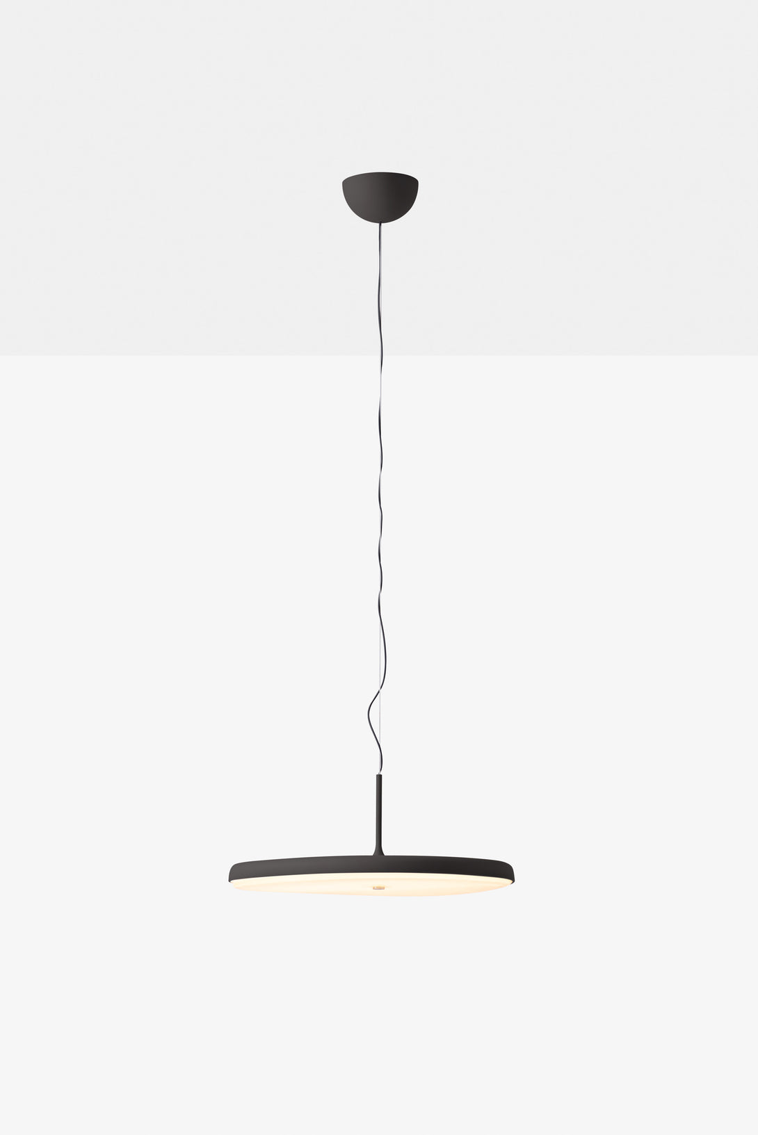 Luminária pendente que oferece luz difusa. O corpo é feito de alumínio com acabamento em tinta líquida fosca e verniz soft-touch disponível nas versões Off White, Off Black e Cement, ou verniz de alto brilho para a versão Café. Possui um difusor de vidro transparente feito por meio de um processo de fundição artesanal e inclui um LED integrado.
