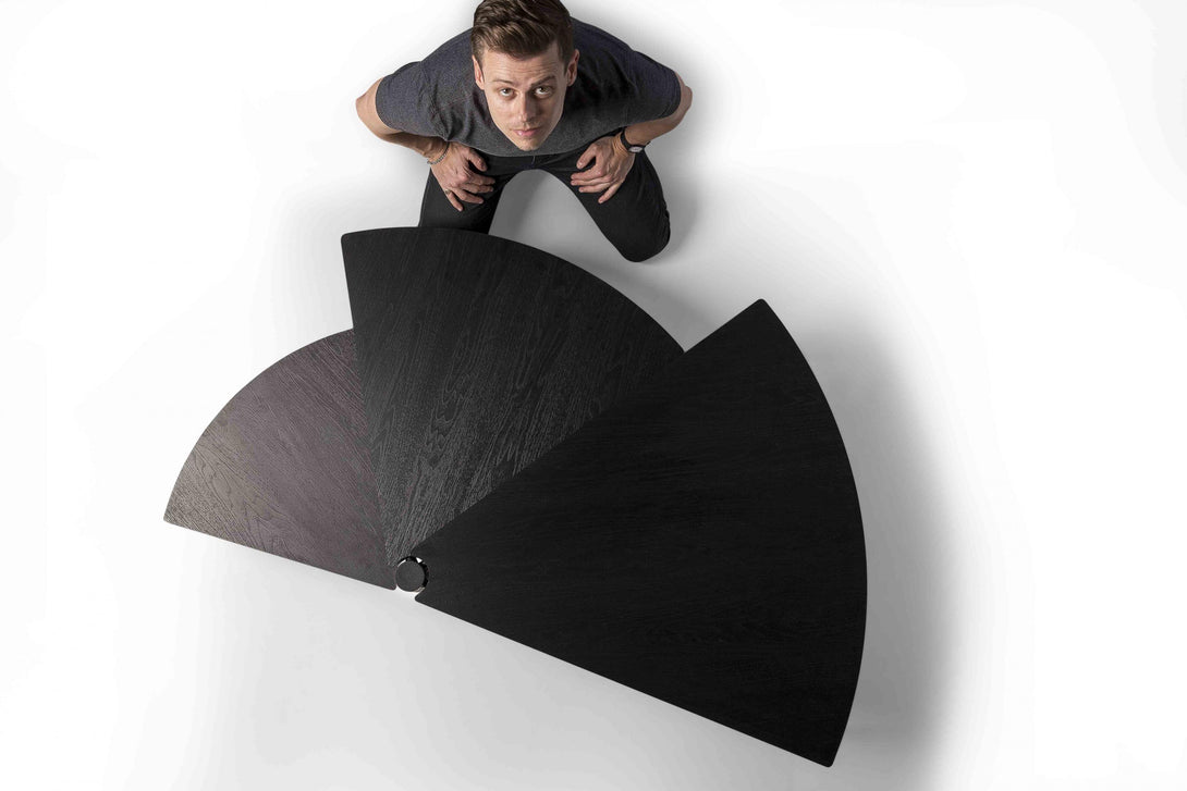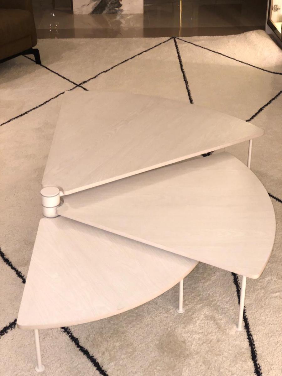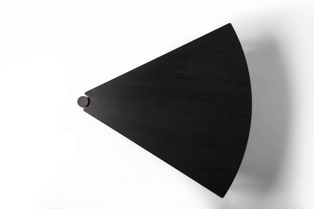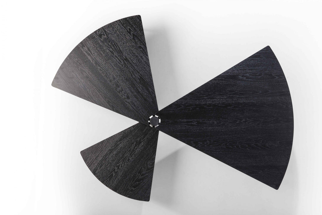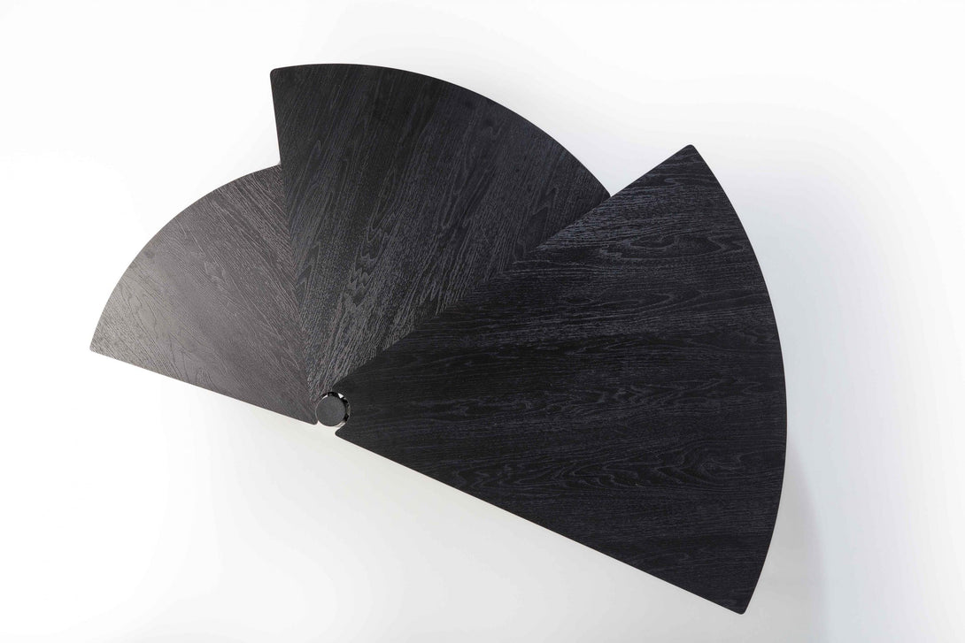 Com 3 tampos independentes que giram no mesmo eixo, a peça cabe em espaços pequenos, mas também maiores, atingindo vão de até 1,70m quando totalmente aberta. A mesa Leque segue o conceito de mobiliário que pode ser configurado de acordo com a necessidade de uso, uma das métricas seguidas pelo ateliê Tiago Curioni, alinhando-se às tendências de espaços multiuso.