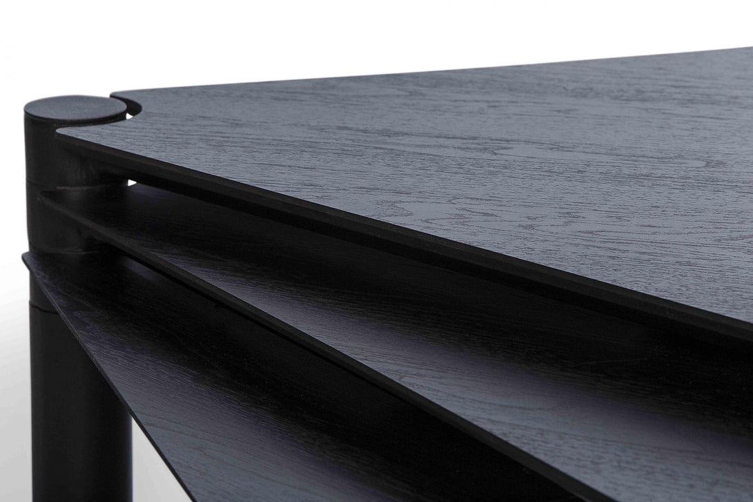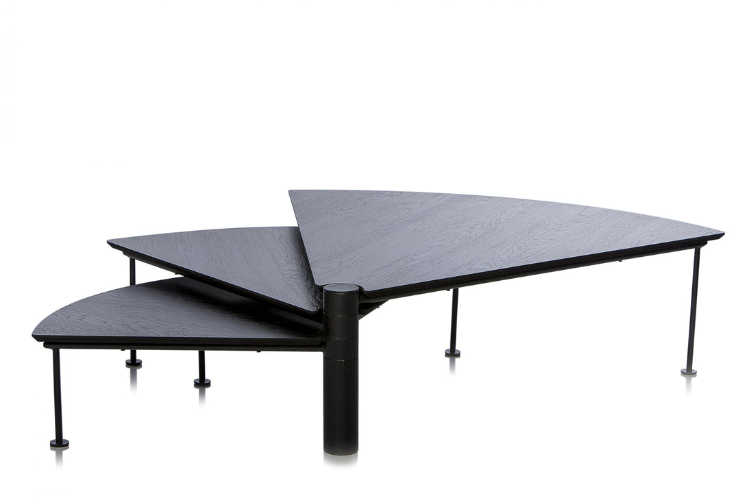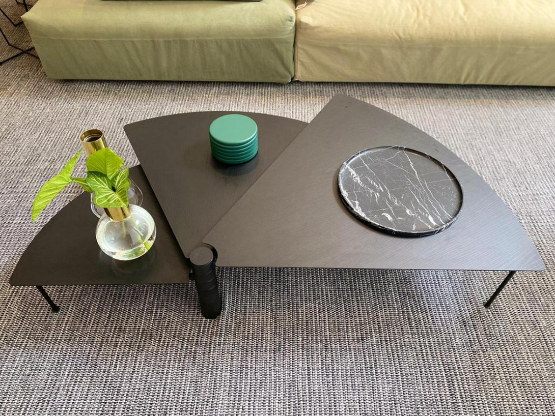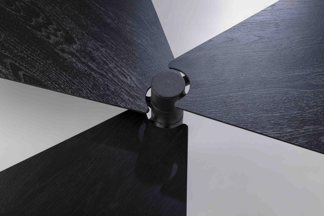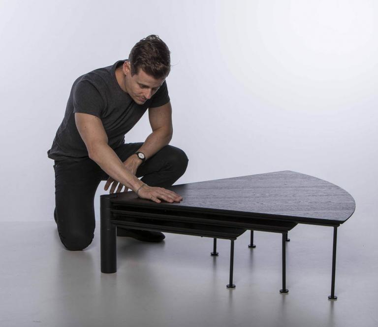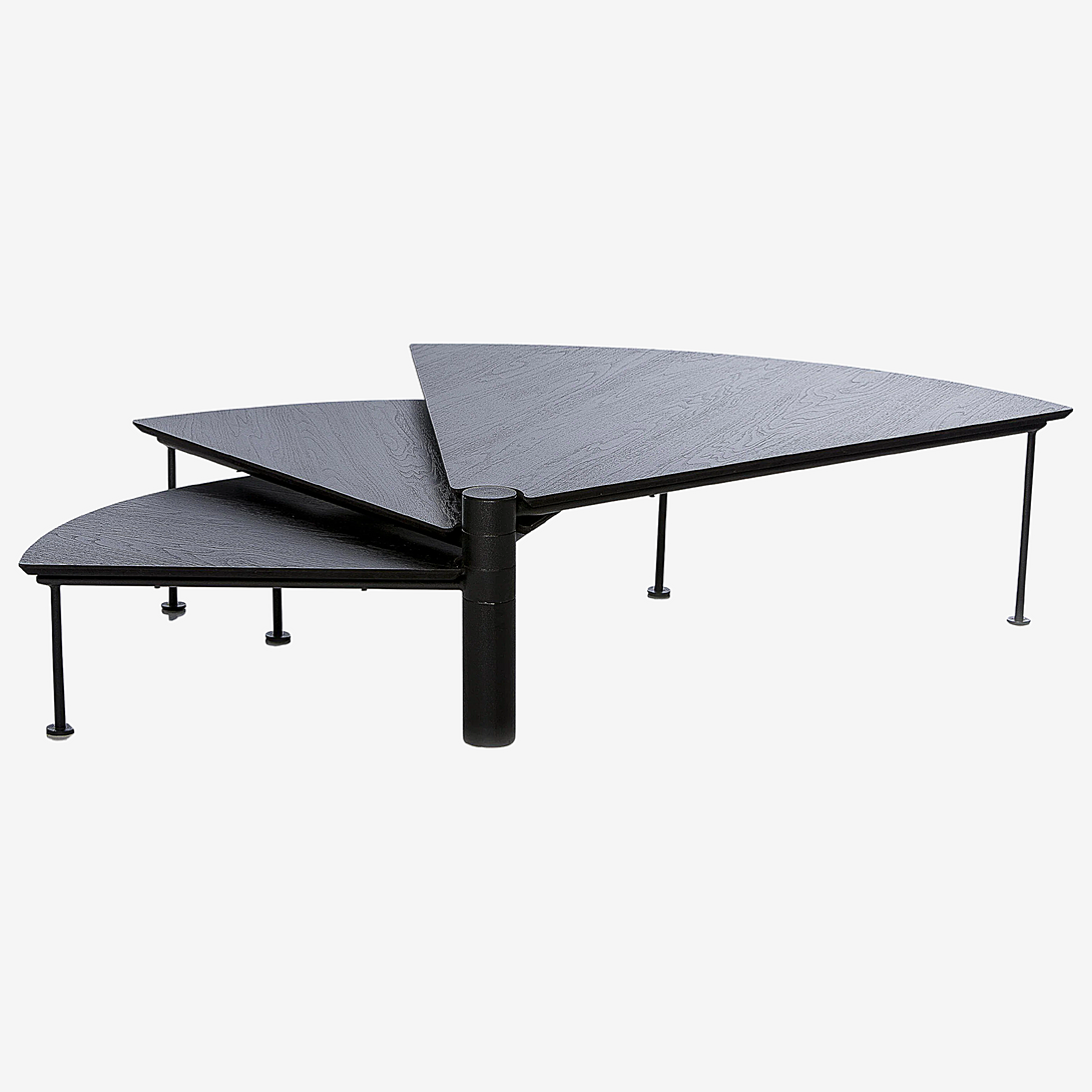 Com 3 tampos independentes que giram no mesmo eixo, a peça cabe em espaços pequenos, mas também maiores, atingindo vão de até 1,70m quando totalmente aberta. A mesa Leque segue o conceito de mobiliário que pode ser configurado de acordo com a necessidade de uso, uma das métricas seguidas pelo ateliê Tiago Curioni, alinhando-se às tendências de espaços multiuso.