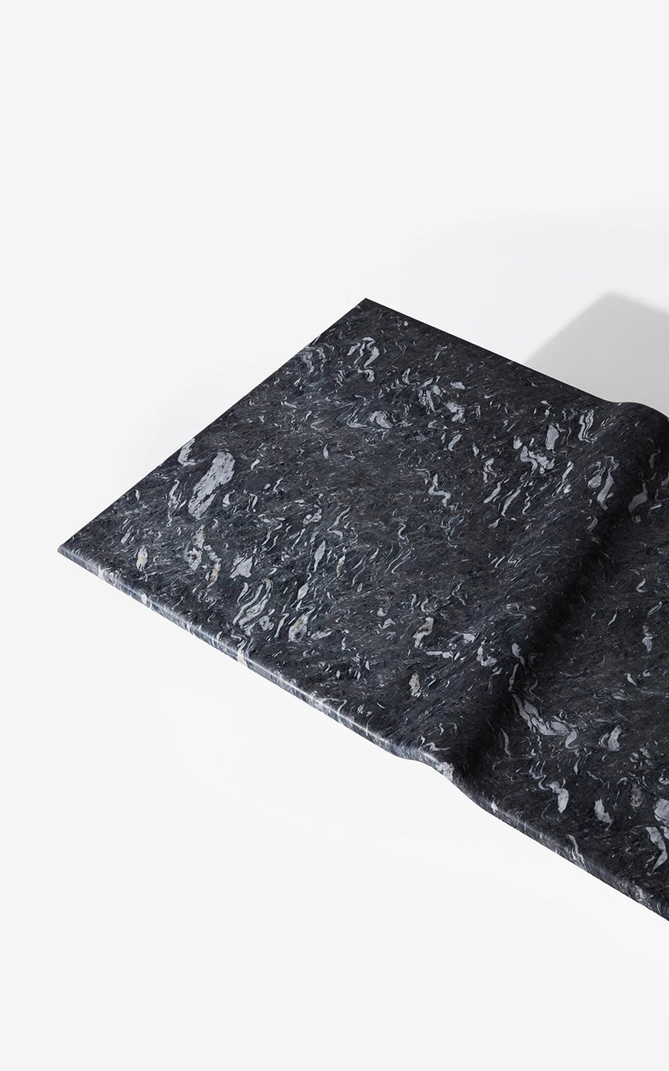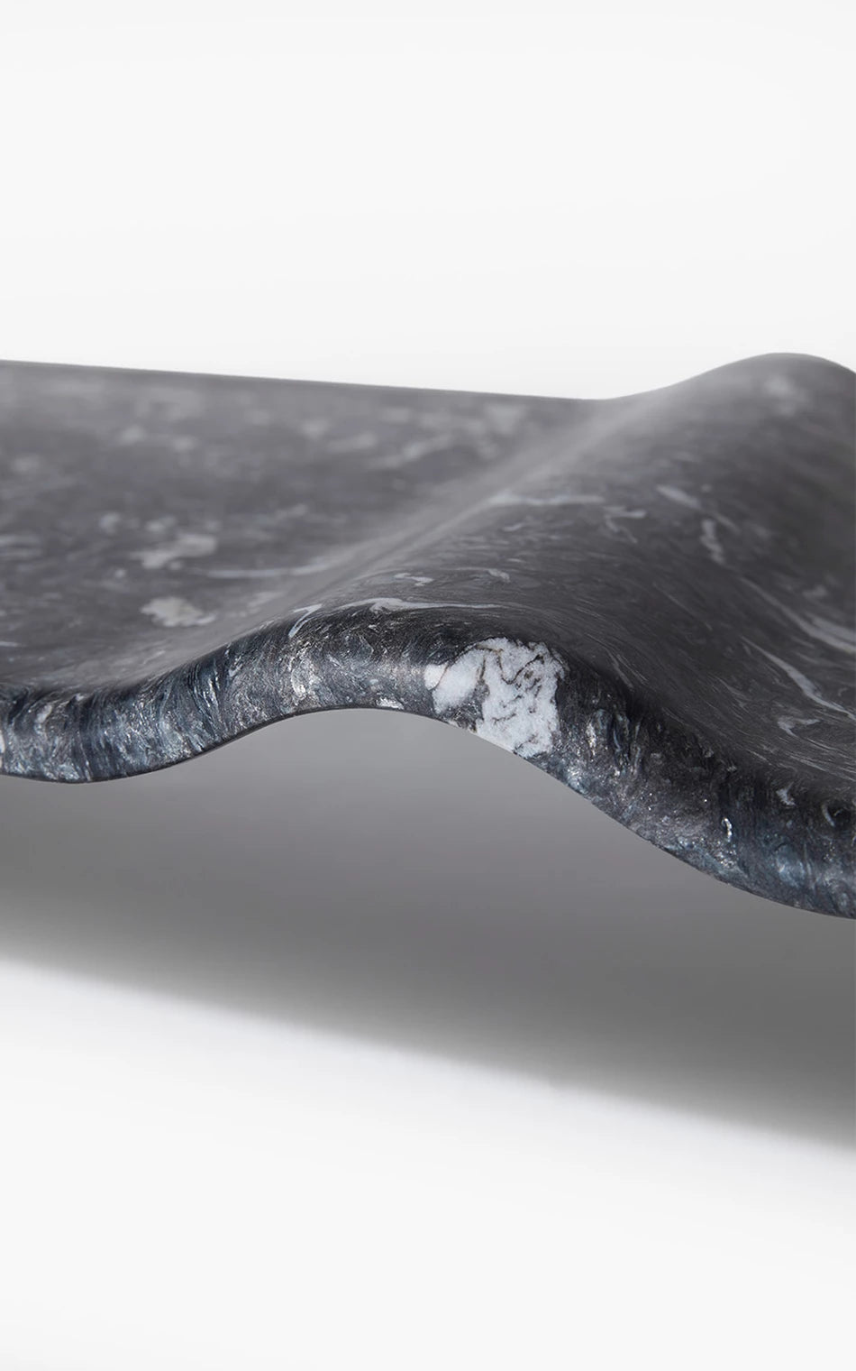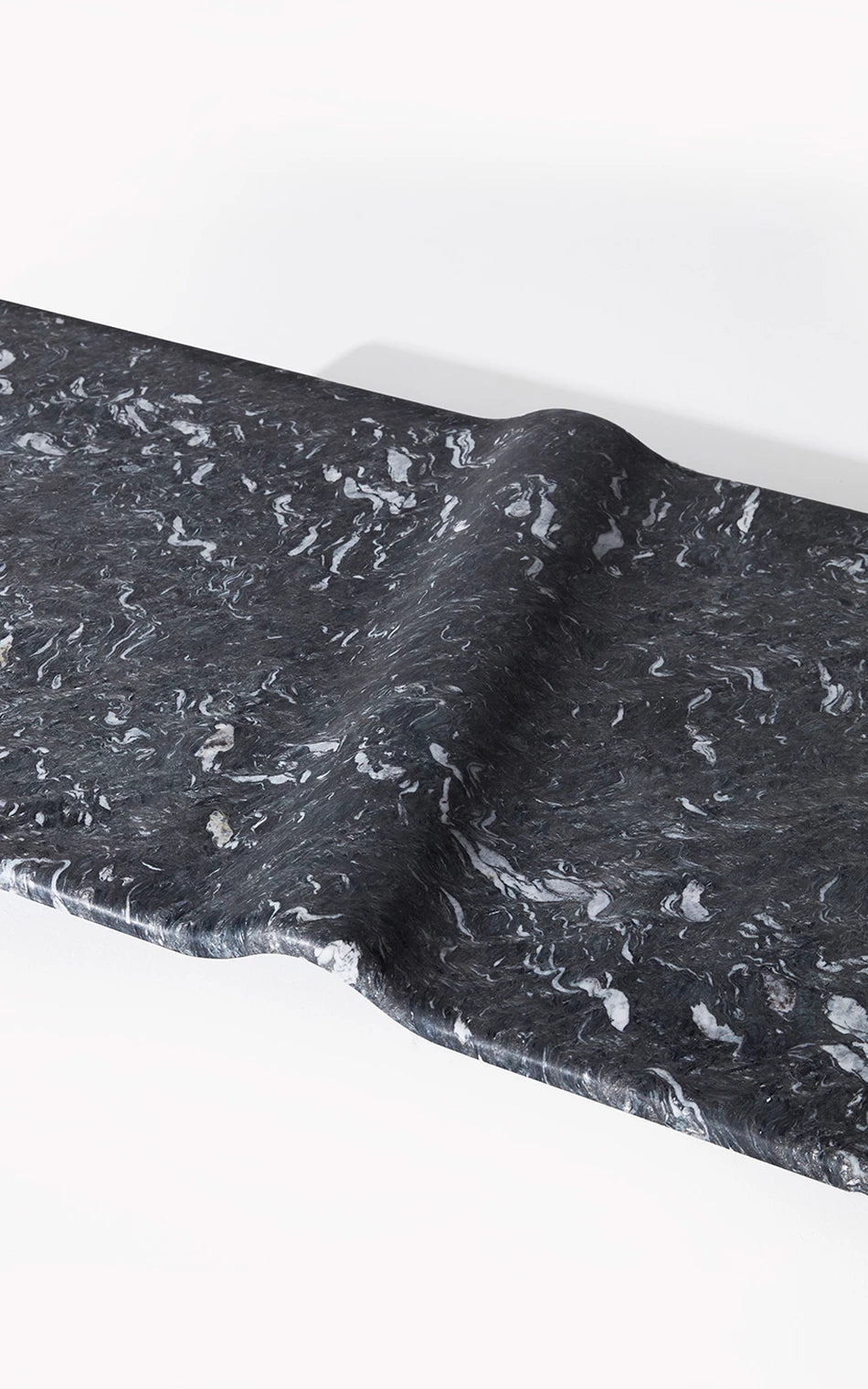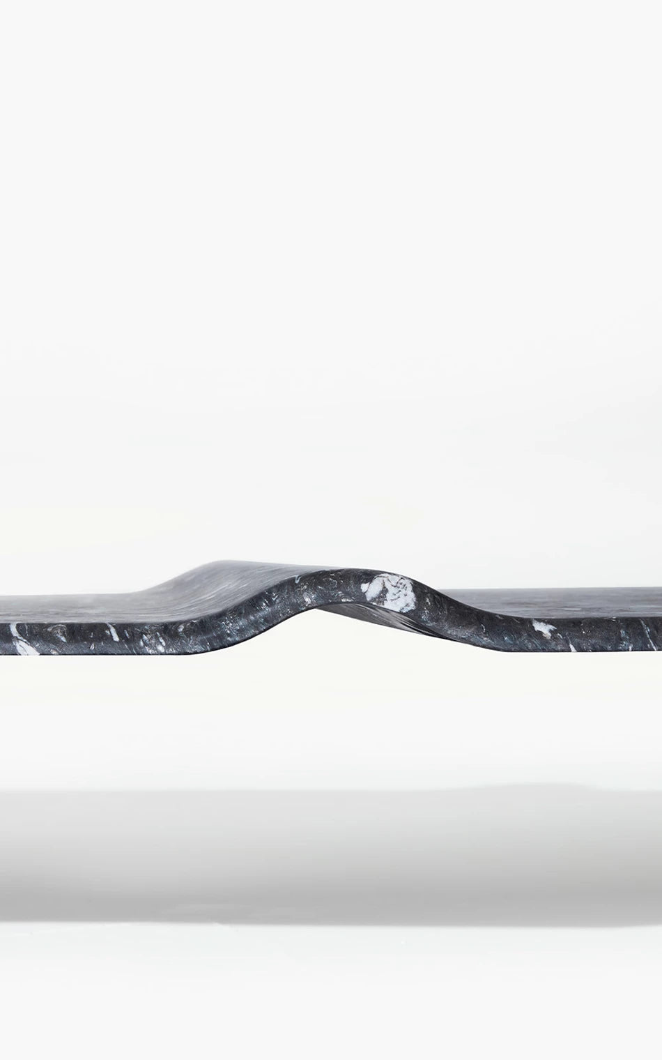 A Mesa de Centro Onda associa-se à imagem do mar. A escultura em pedra granítica cria a curva perfeita - Marcada pela amplitude do ponto de equilíbrio do repouso à crista da onda. Um movimento das águas que apresenta força e delicadeza em um bloco de pedra brasileira. A base preta dá uma sensação de profundidade, de que a matéria é densa, complexa e misteriosa, como um oceano noturno. As manchas brancas, em oposição, lembram a espuma da arrebentação, o futuro da onda: água agitada, clareza e atrito. A escolha de uma base longa e retangular contrasta com a forma orgânica ondulada, que curva e diagonaliza o centro da mesa. O móvel vira paisagem, ou melhor: fotografia de paisagem.