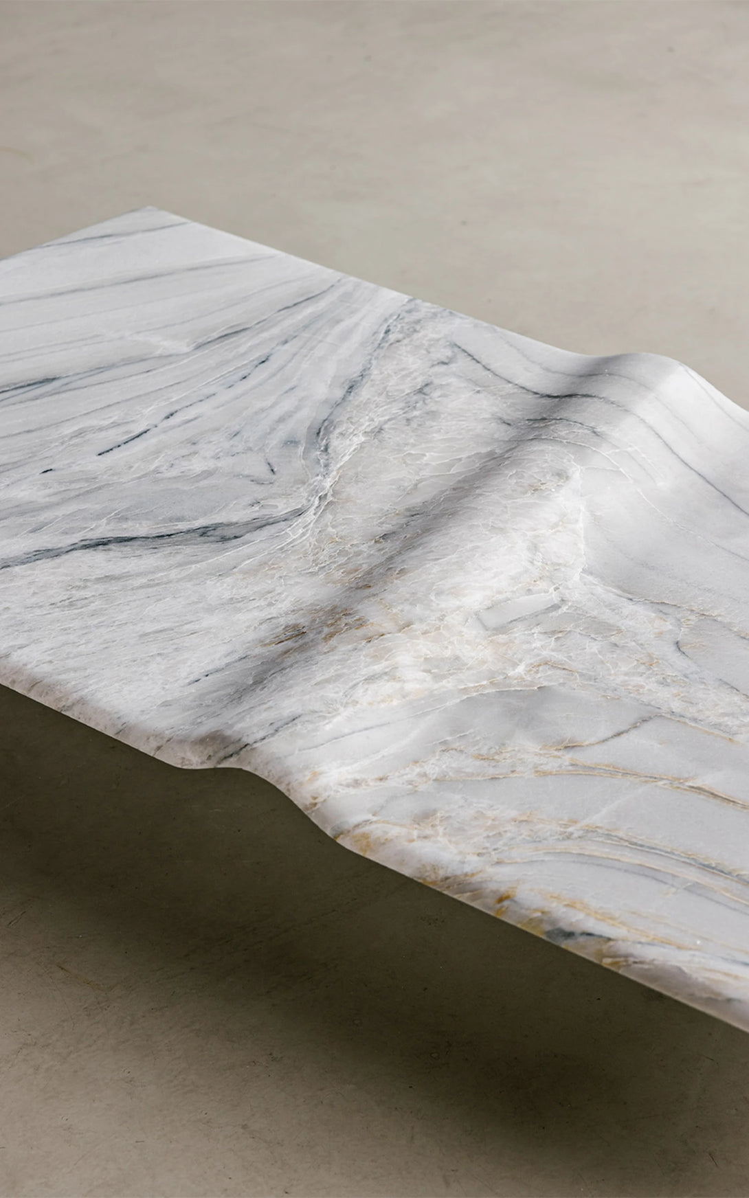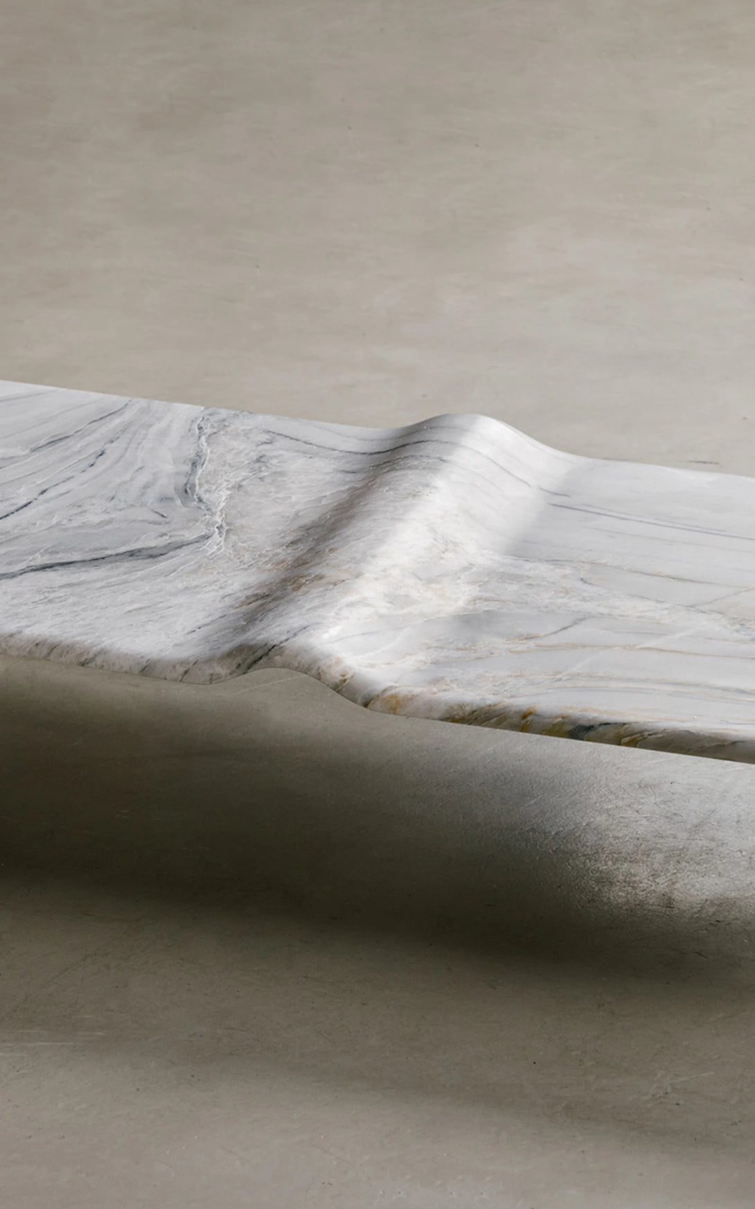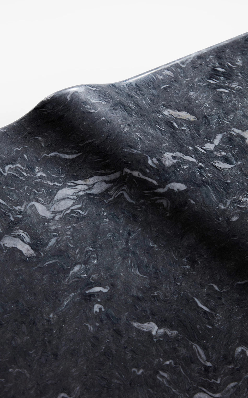 A Mesa de Centro Onda associa-se à imagem do mar. A escultura em pedra granítica cria a curva perfeita - Marcada pela amplitude do ponto de equilíbrio do repouso à crista da onda. Um movimento das águas que apresenta força e delicadeza em um bloco de pedra brasileira. A base preta dá uma sensação de profundidade, de que a matéria é densa, complexa e misteriosa, como um oceano noturno. As manchas brancas, em oposição, lembram a espuma da arrebentação, o futuro da onda: água agitada, clareza e atrito. A escolha de uma base longa e retangular contrasta com a forma orgânica ondulada, que curva e diagonaliza o centro da mesa. O móvel vira paisagem, ou melhor: fotografia de paisagem.