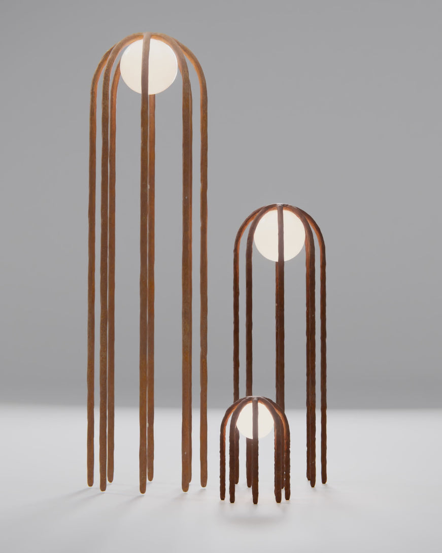 Apando as luminárias Açafrão & Urucum - Feitas de metal revestido com especiarias brasileiras autênticas, essas luminárias refletem a paleta de cores vibrantes do mercado. Feitas à mão por artistas experientes, a textura ondulada de cada luminária é única devido à mistura ser adicionada manualmente. Disponíveis em três tamanhos e duas cores: vermelho intenso (annatto) ou laranja terroso (saffron).