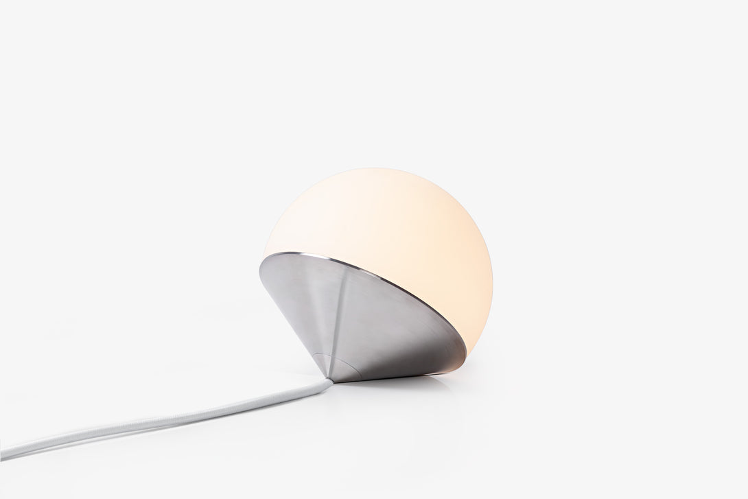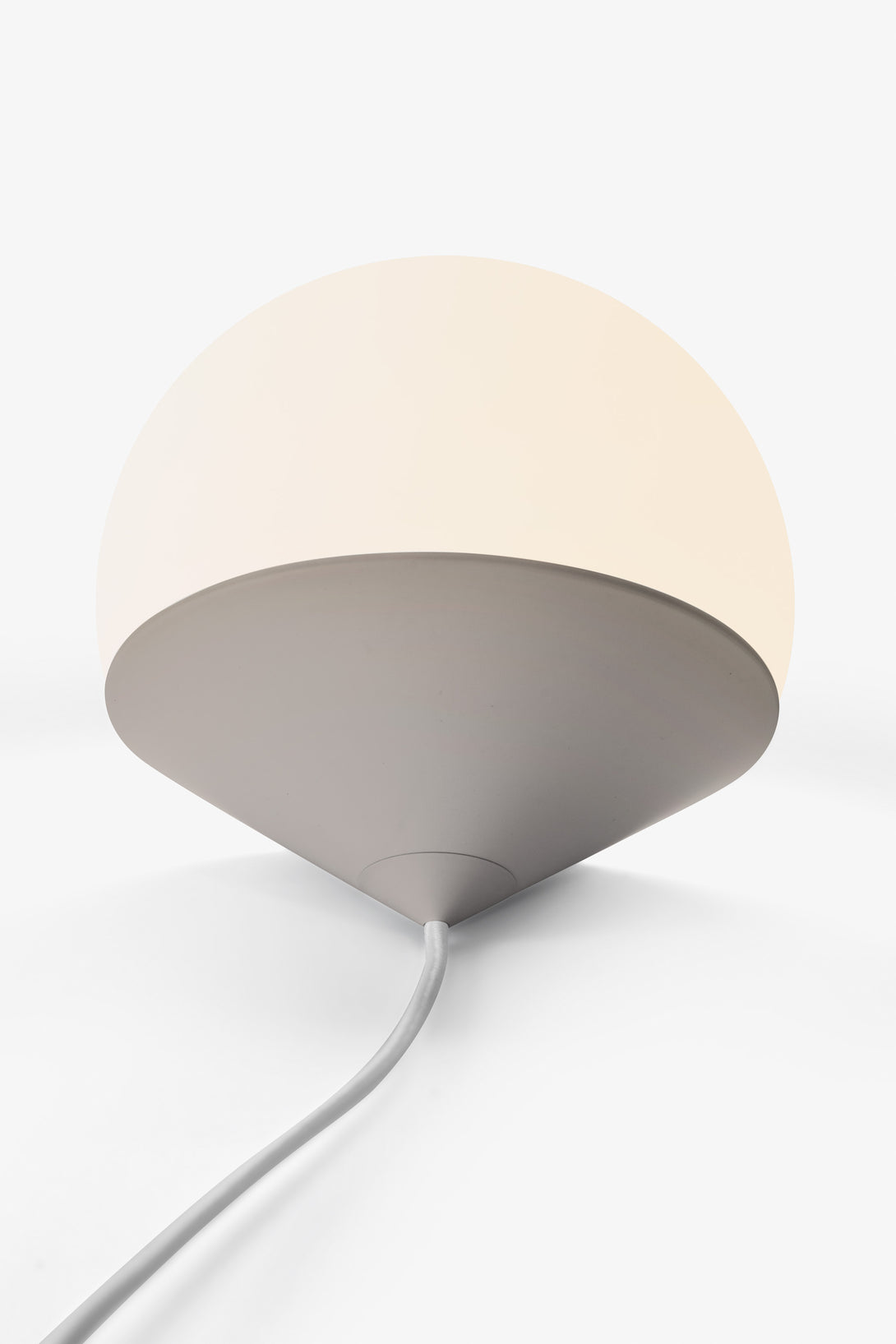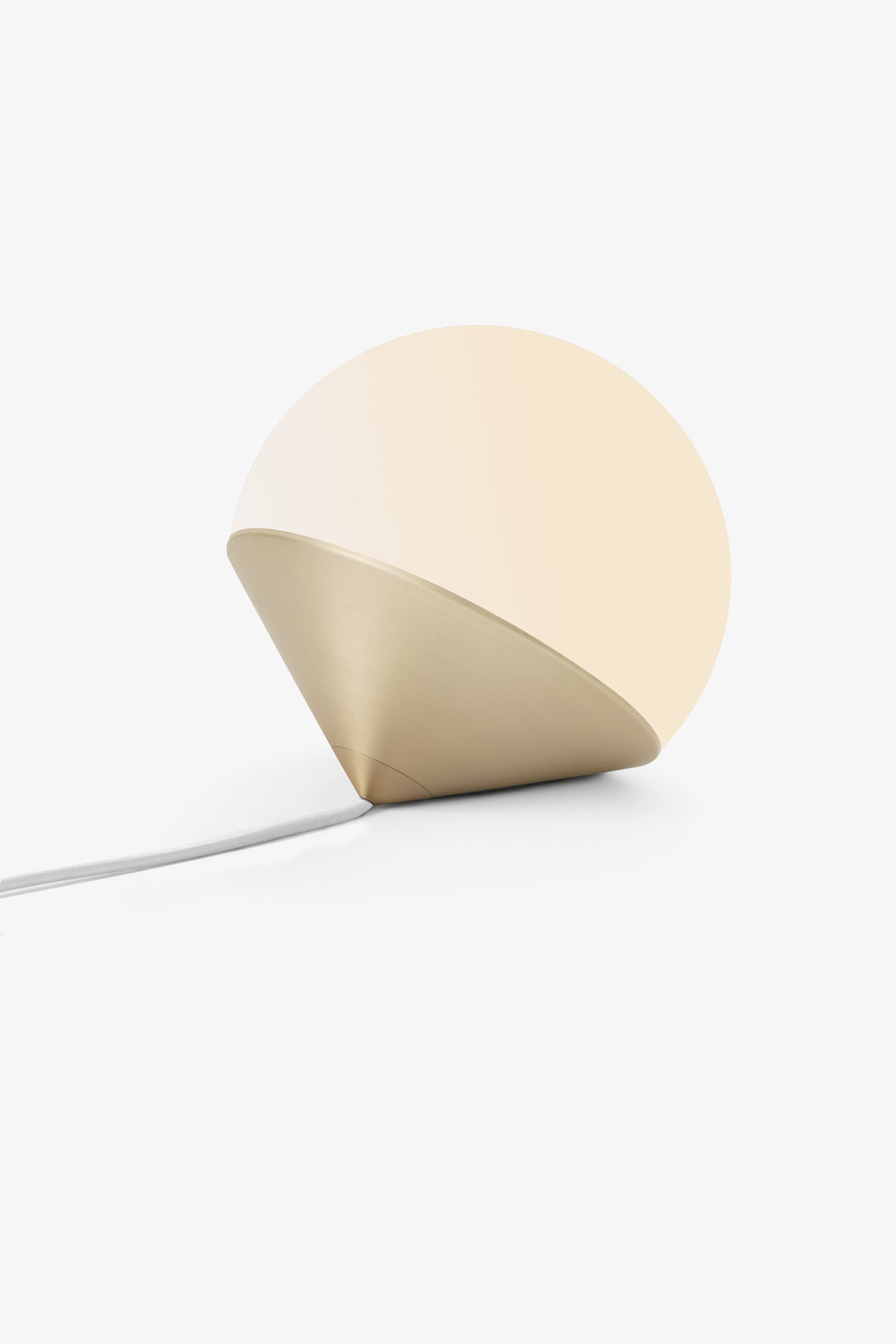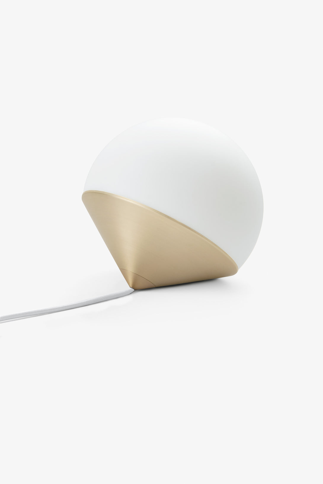 Luz difusa. Base de alumínio com tinta líquida e verniz soft-touch; latão escovado com verniz fosco; ou aço inoxidável escovado. Difusor de vidro soprado com acabamento fosco. Alça revestida em tecido. LED integrado.