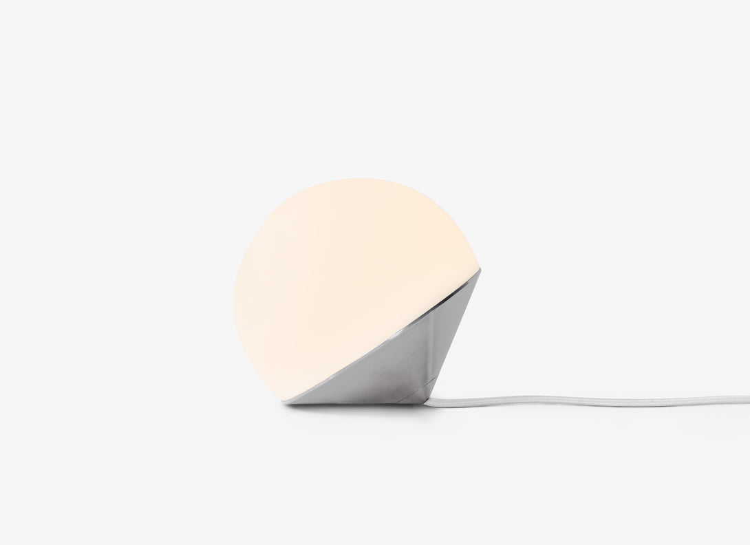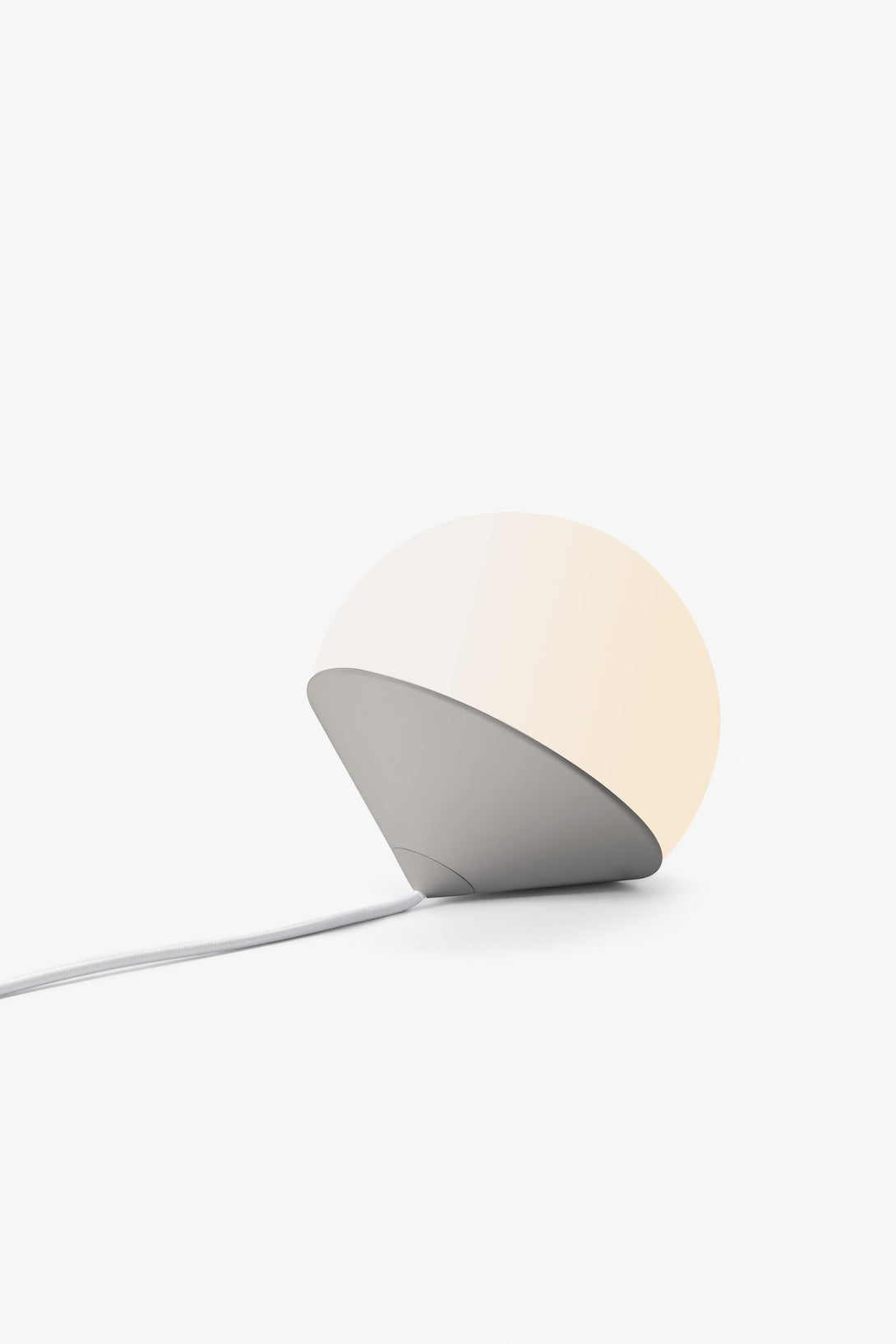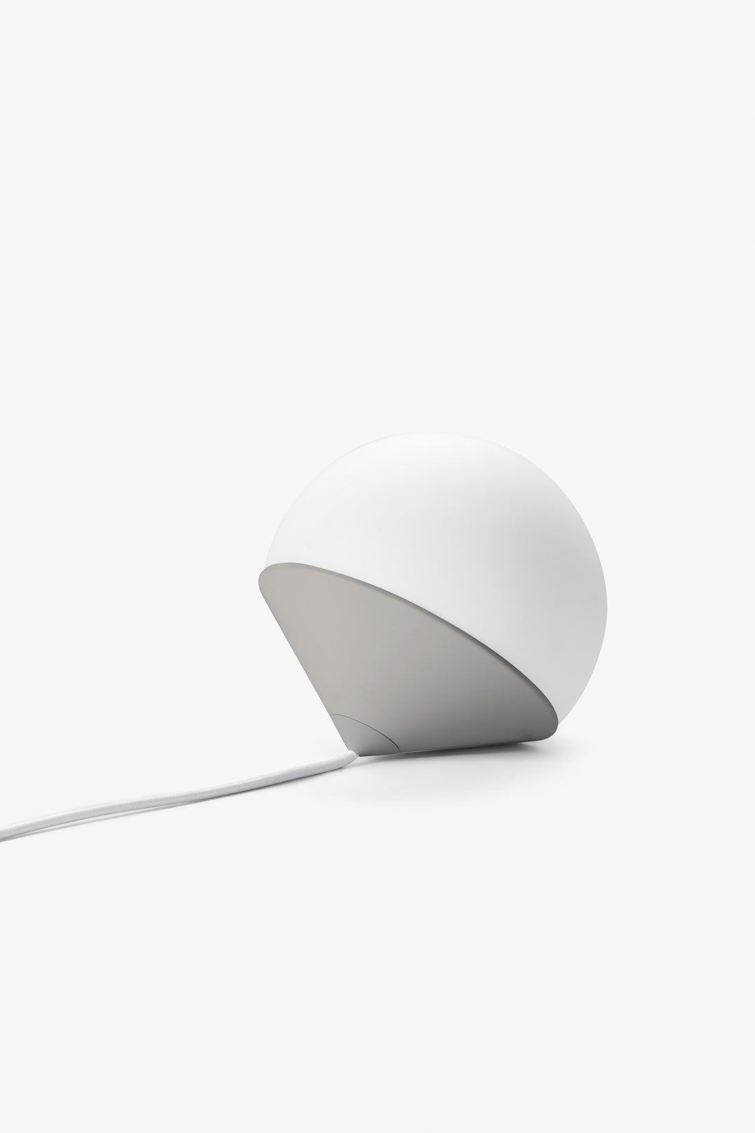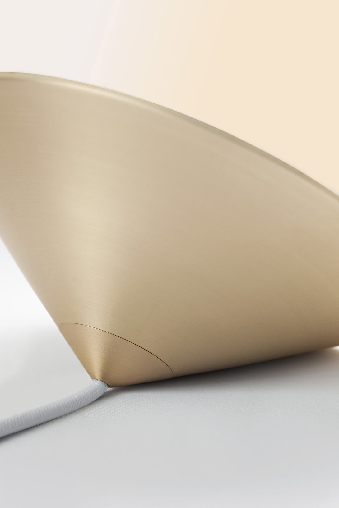 Luz difusa. Base de alumínio com tinta líquida e verniz soft-touch; latão escovado com verniz fosco; ou aço inoxidável escovado. Difusor de vidro soprado com acabamento fosco. Alça revestida em tecido. LED integrado.