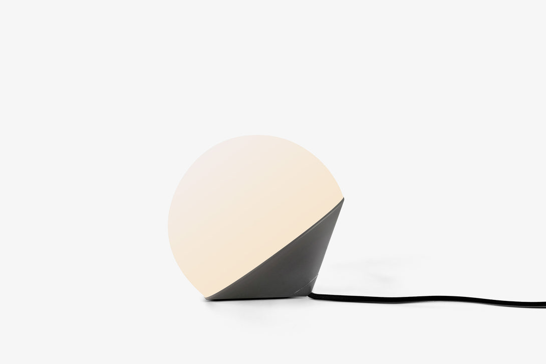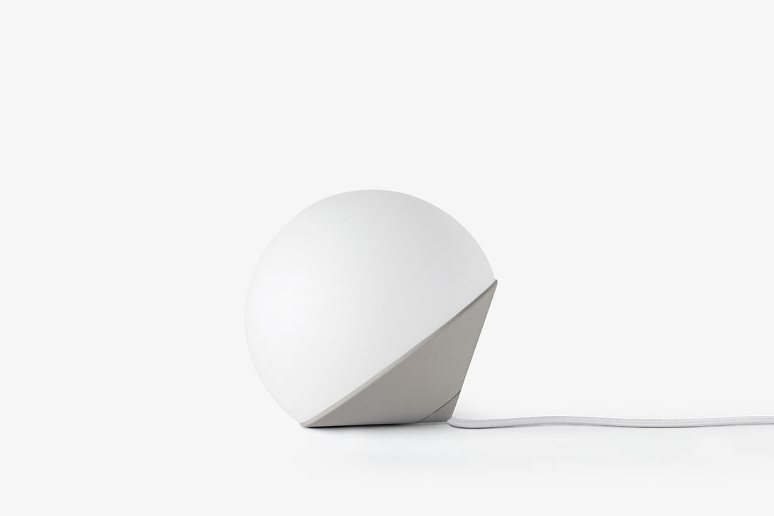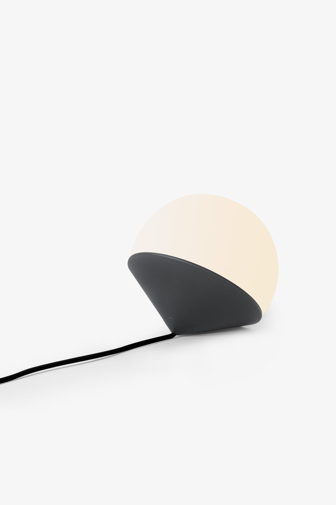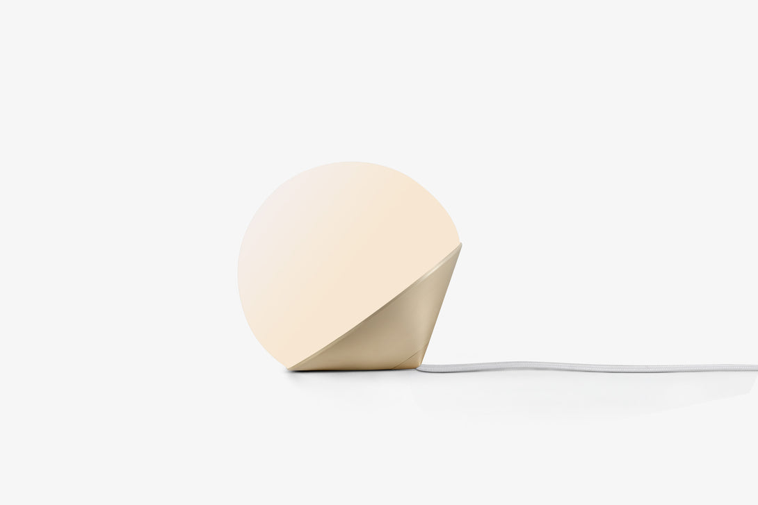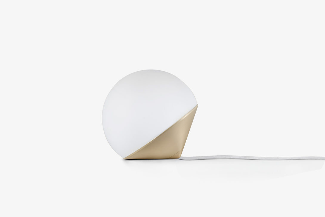 Luz difusa. Base de alumínio com tinta líquida e verniz soft-touch; latão escovado com verniz fosco; ou aço inoxidável escovado. Difusor de vidro soprado com acabamento fosco. Alça revestida em tecido. LED integrado.