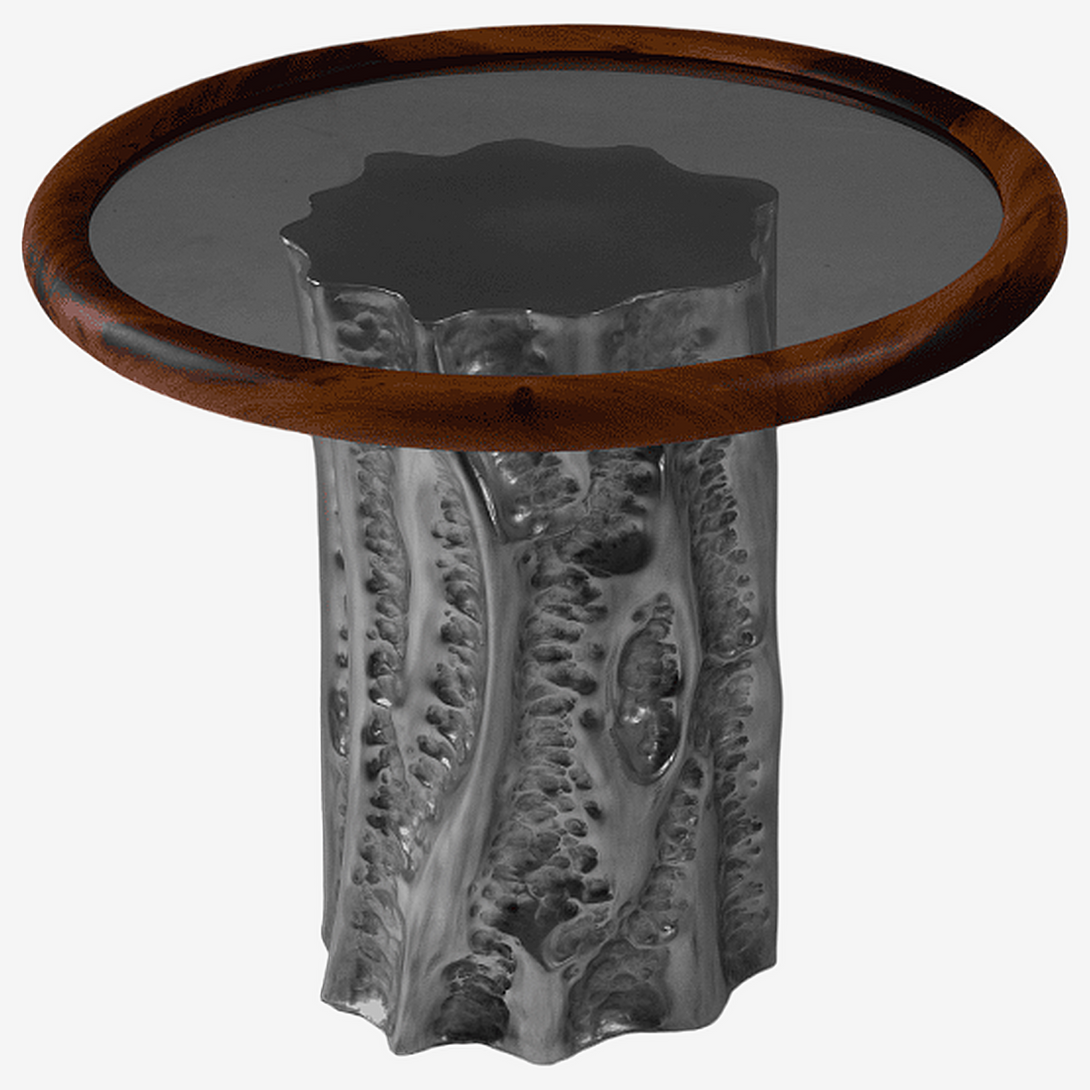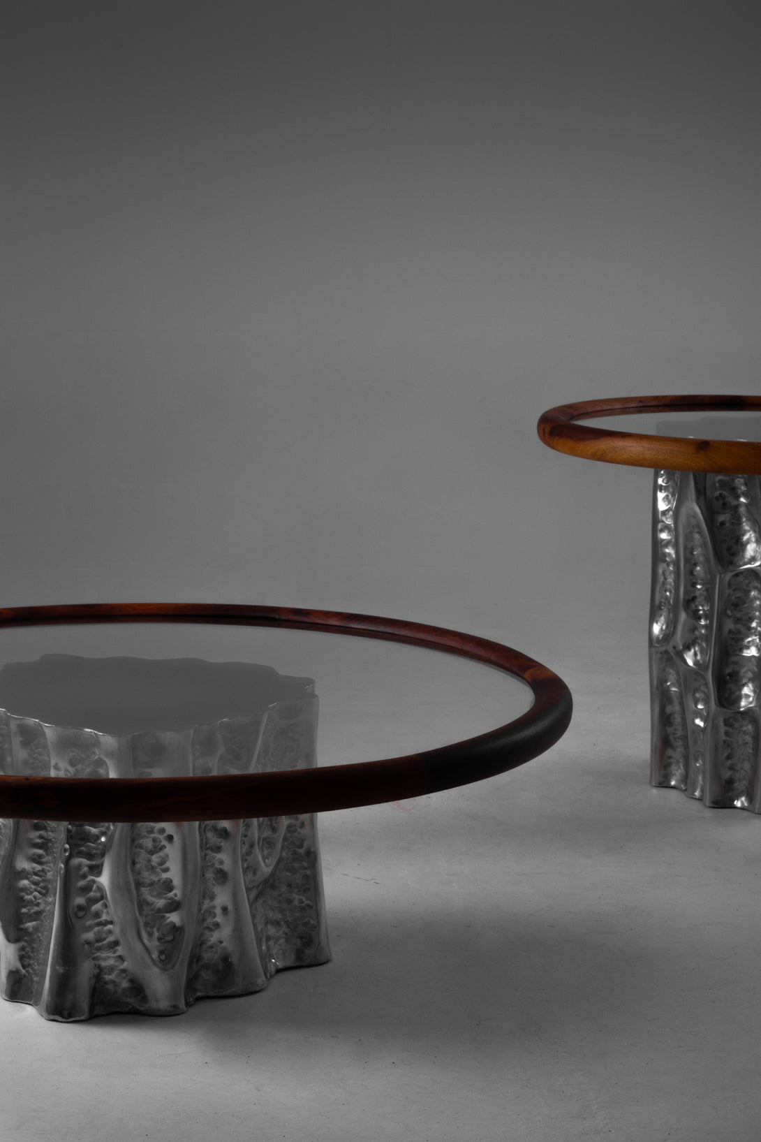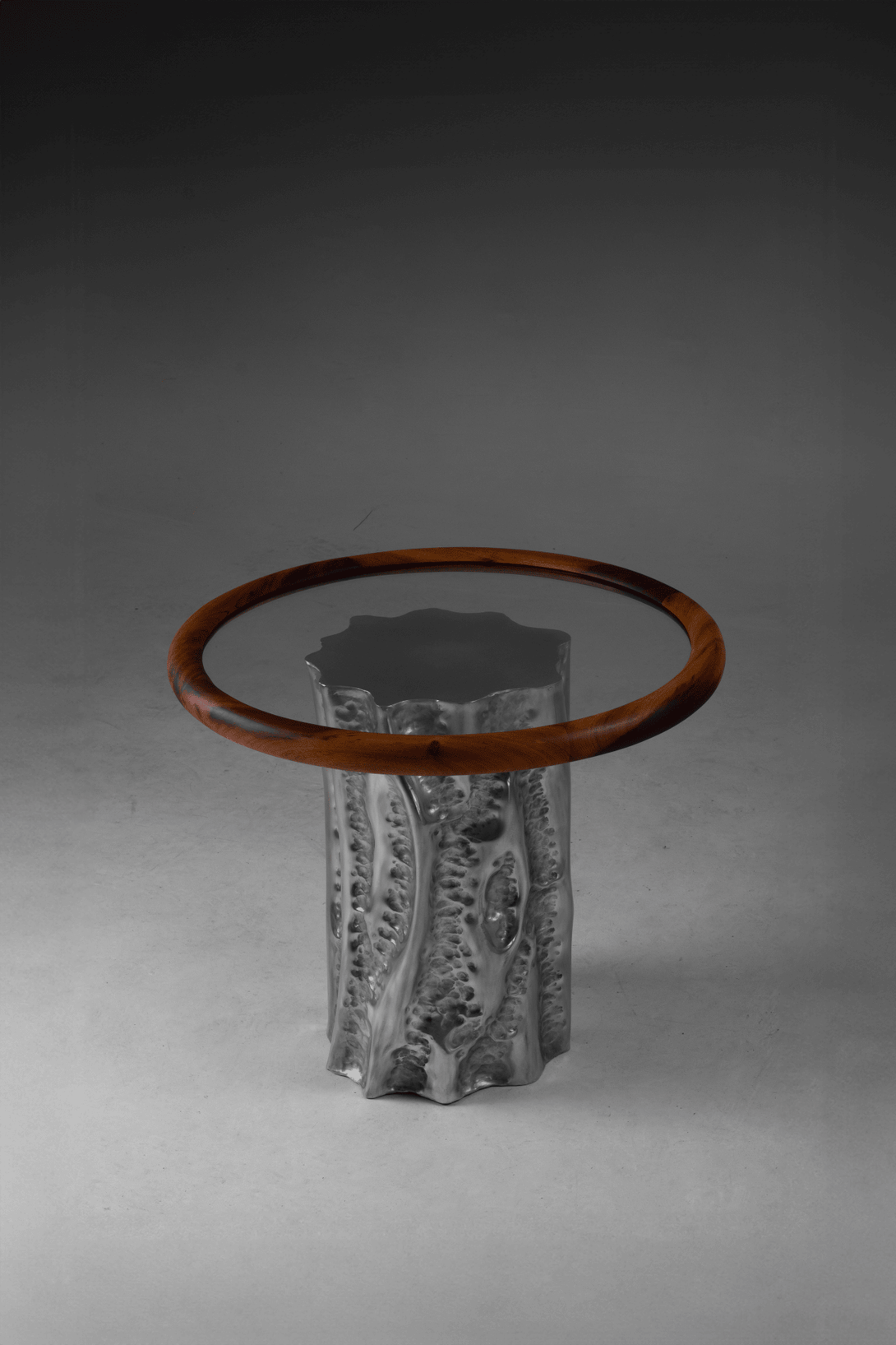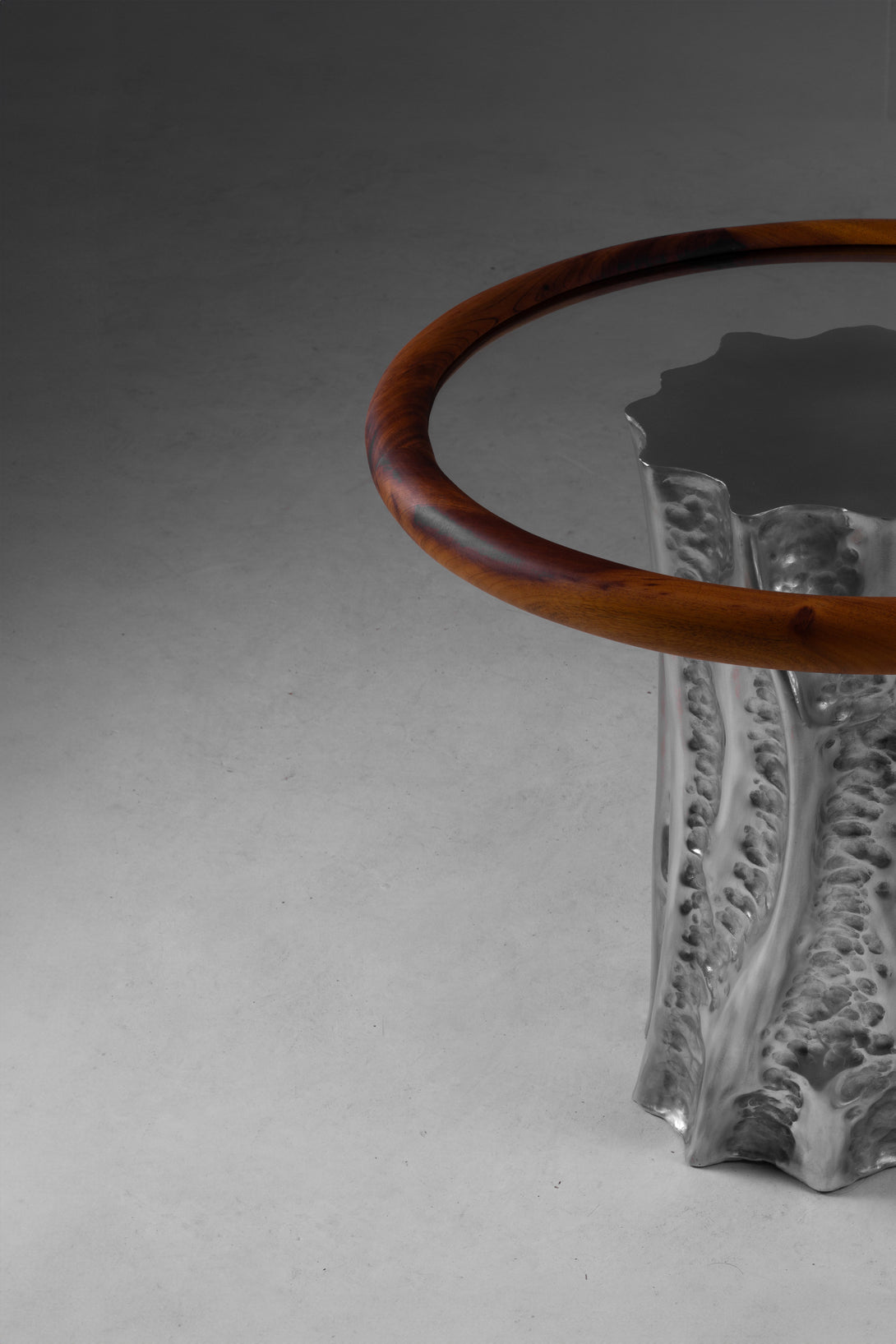 A mesa lateral é uma peça de design sofisticada, cuidadosamente trabalhada em alumínio, com cada peça sendo moldada individualmente à mão para garantir exclusividade e precisão em cada detalhe. O tampo apresenta vidro laminado, oferecendo um toque moderno e elegante, enquanto a borda de madeira maciça adiciona um elemento de calor e naturalidade.
