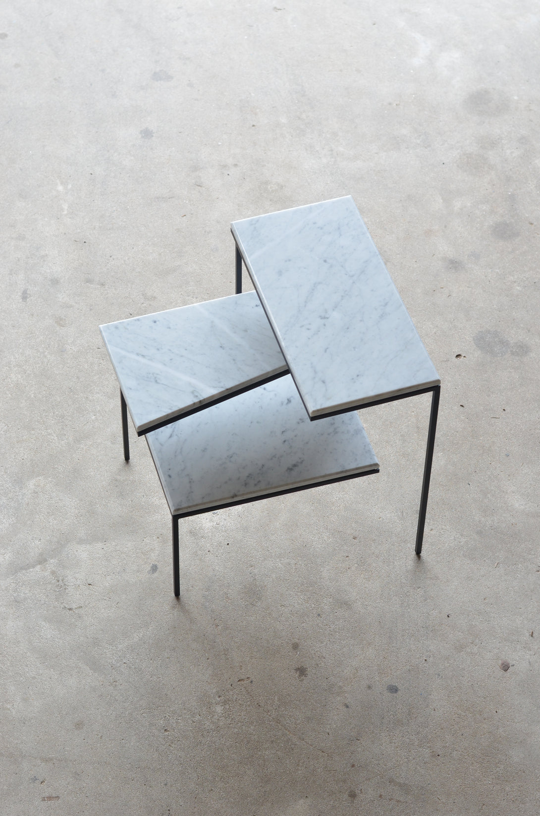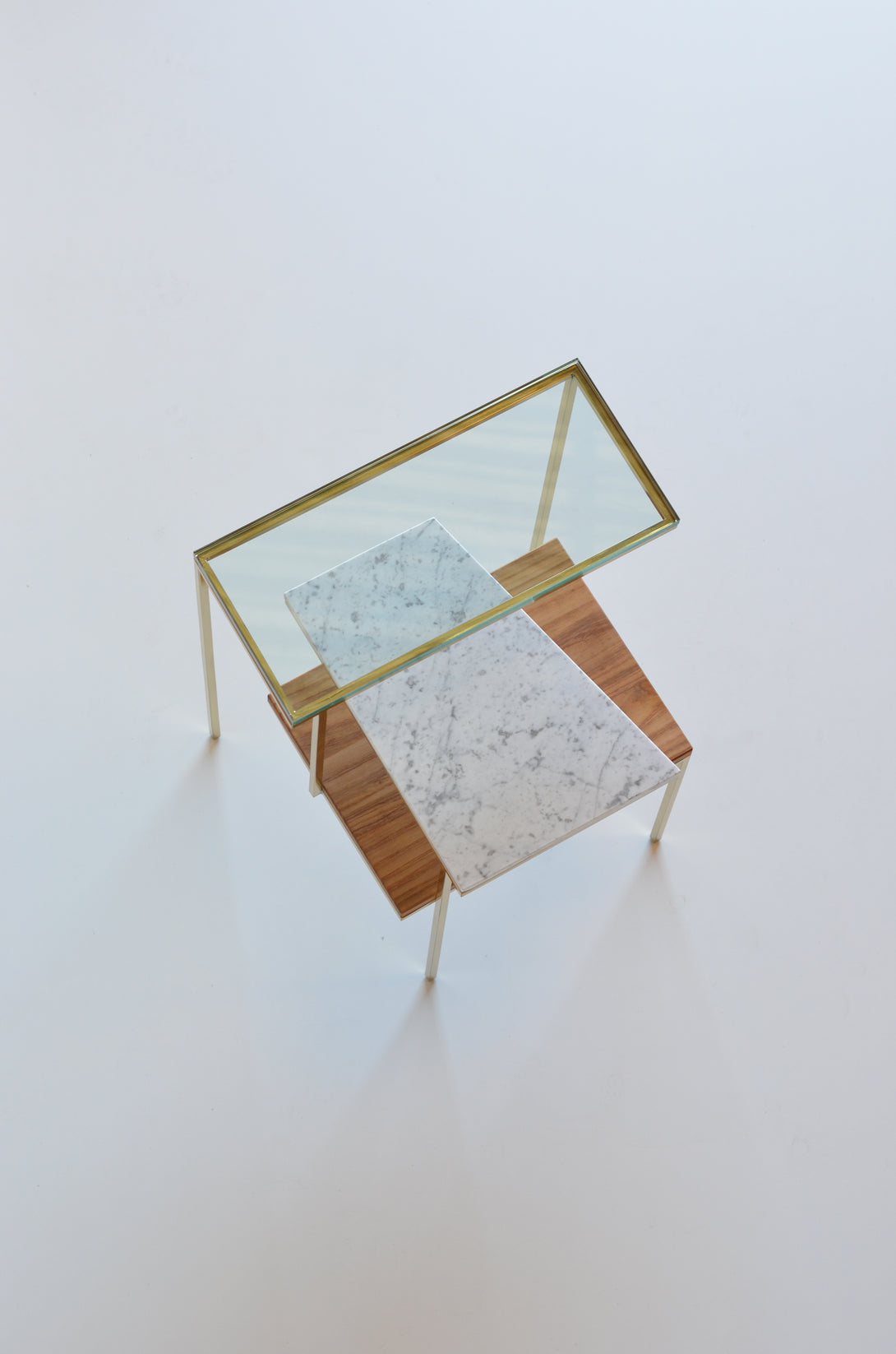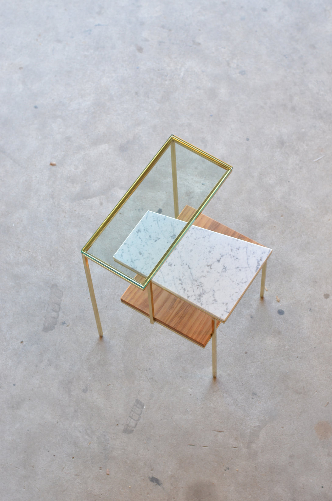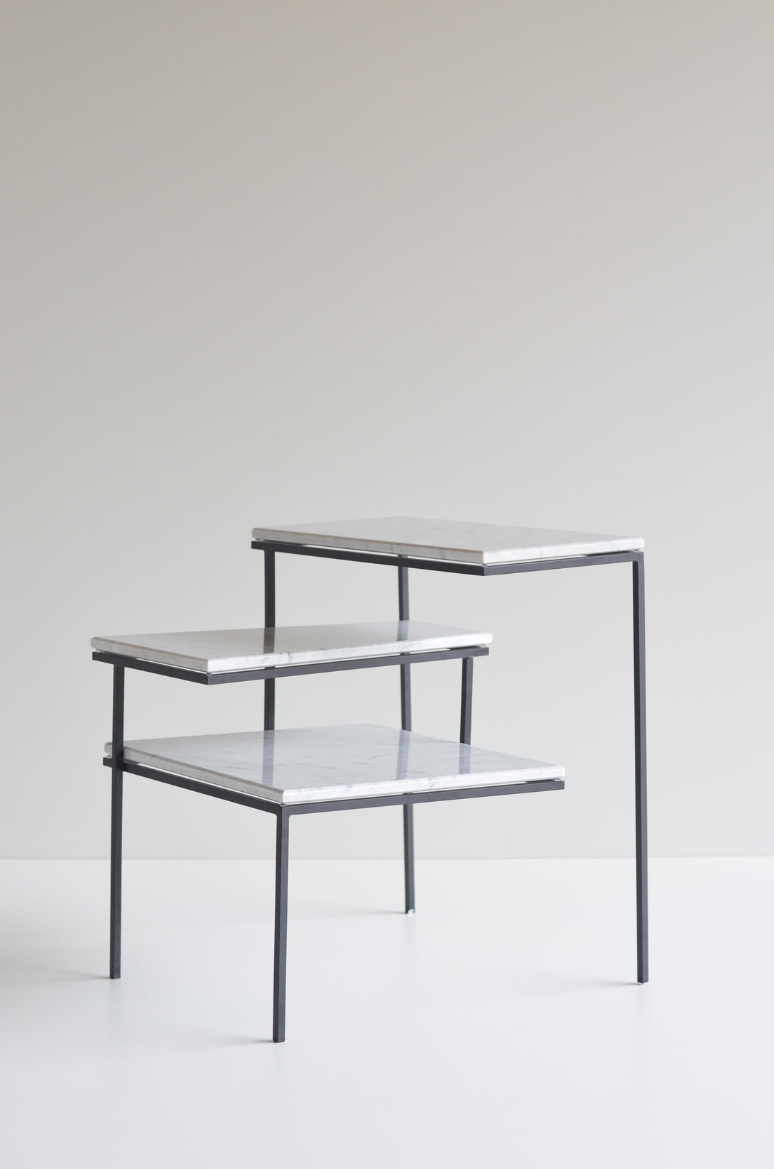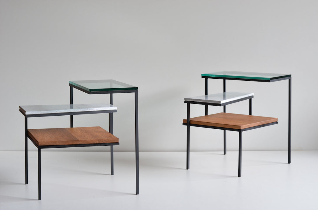A estrutura pode ser feita de aço inoxidável (escovado ou ouro escovado) ou ter acabamento em pintura eletrostática nas cores preta, branca, cinza, verde e marrom. Os tampos podem ser de vidro ou mármore.