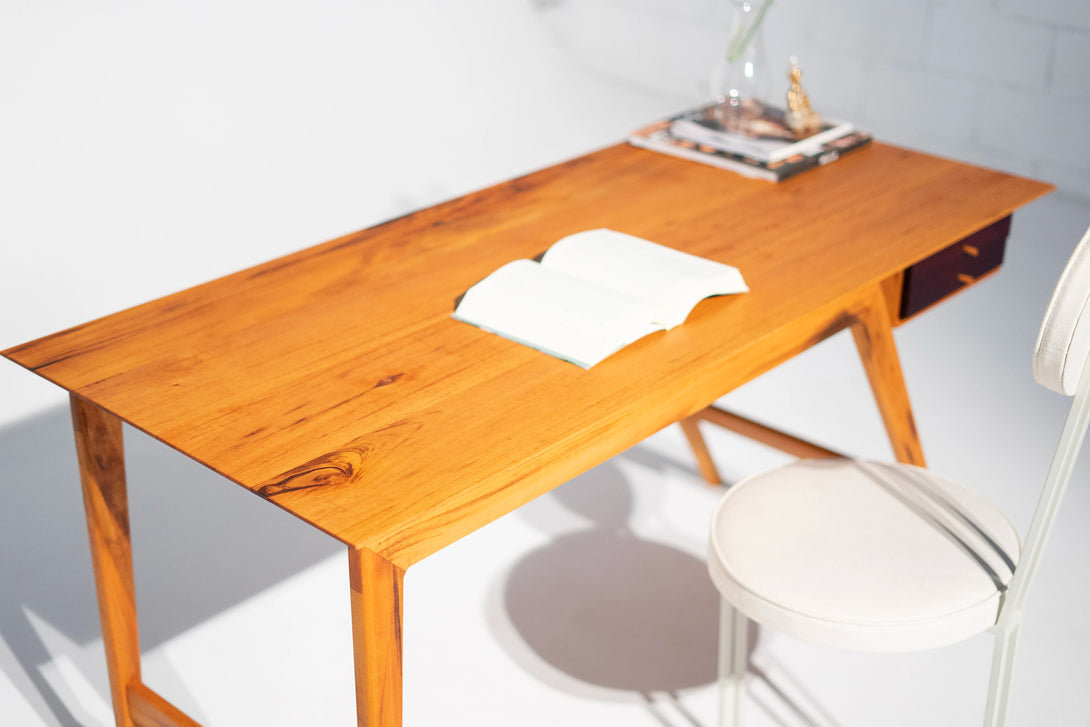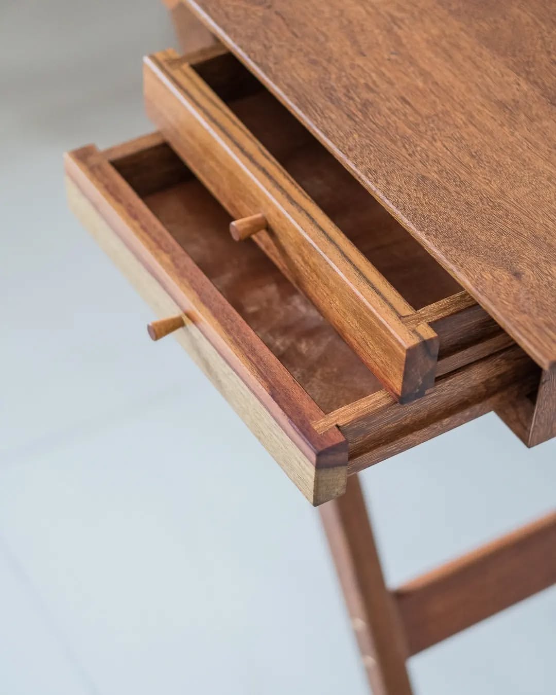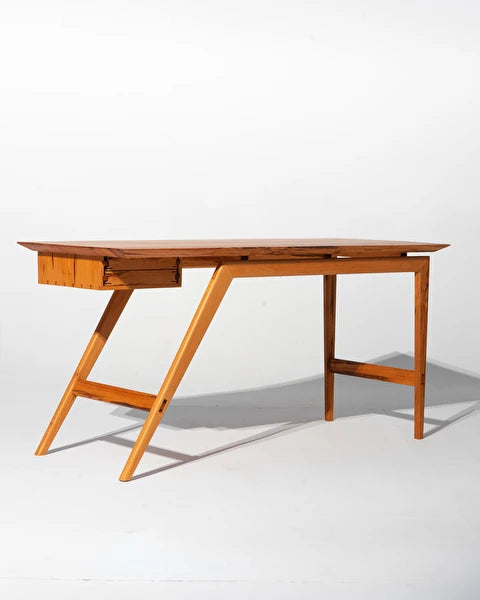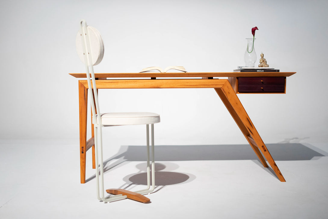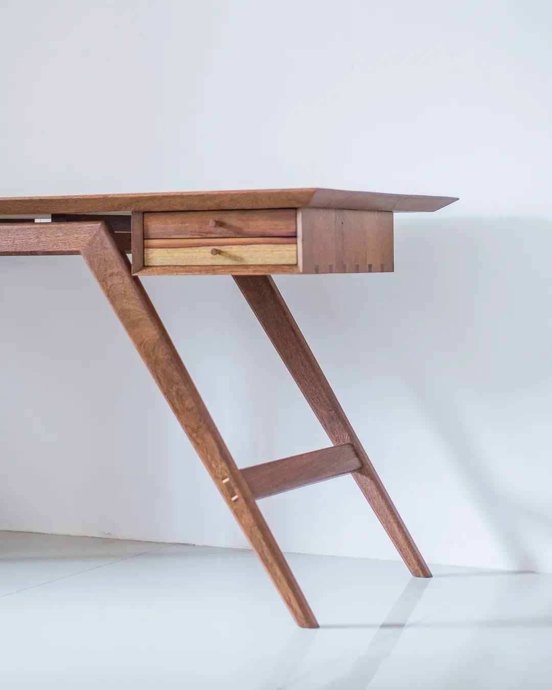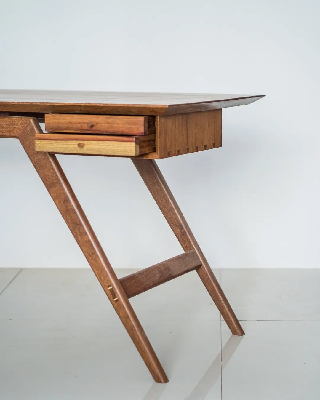 A peça destaca-se pelo design dinâmico e clean, concebido através da combinação de tampo suspenso e pernas anguladas. A escrivaninha Tamanduá é produzida predominantemente em Muiracatiara, madeira nobre com tons alaranjados, resistente e com excelente acabamento. Possui duas gavetas estreitas, ideais para papéis, documentos, pequenos objetos e ferramentas. Construída artesanalmente a quatro mãos, com todo o trabalho e cuidado.