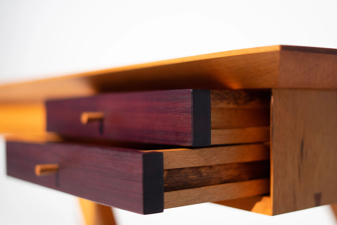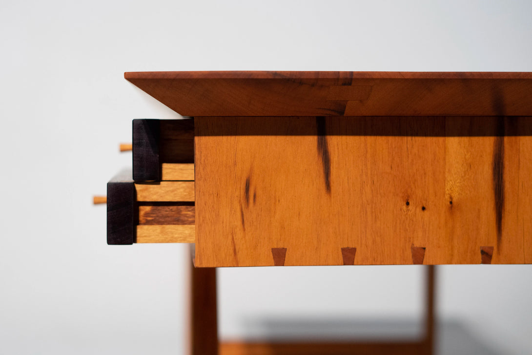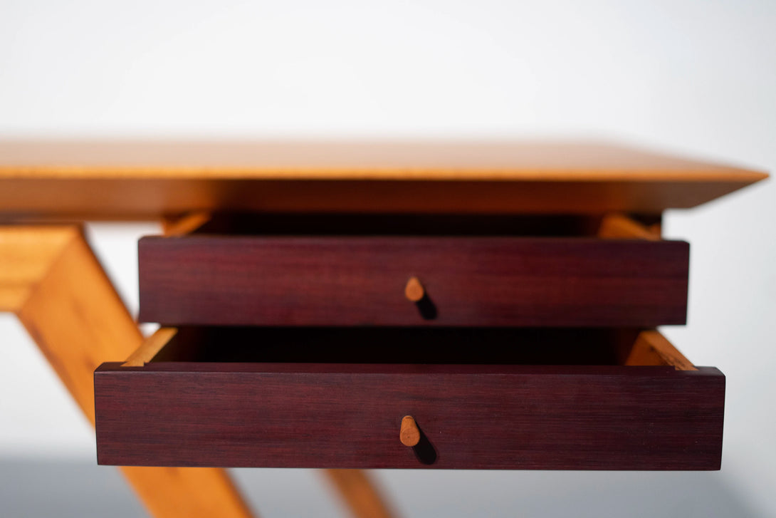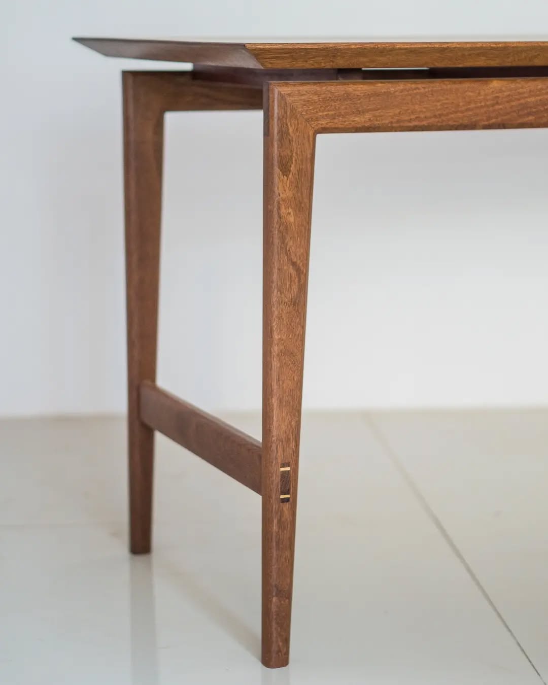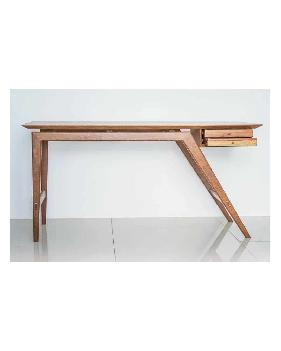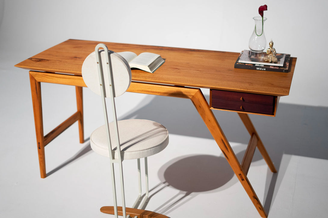 A peça destaca-se pelo design dinâmico e clean, concebido através da combinação de tampo suspenso e pernas anguladas. A escrivaninha Tamanduá é produzida predominantemente em Muiracatiara, madeira nobre com tons alaranjados, resistente e com excelente acabamento. Possui duas gavetas estreitas, ideais para papéis, documentos, pequenos objetos e ferramentas. Construída artesanalmente a quatro mãos, com todo o trabalho e cuidado.