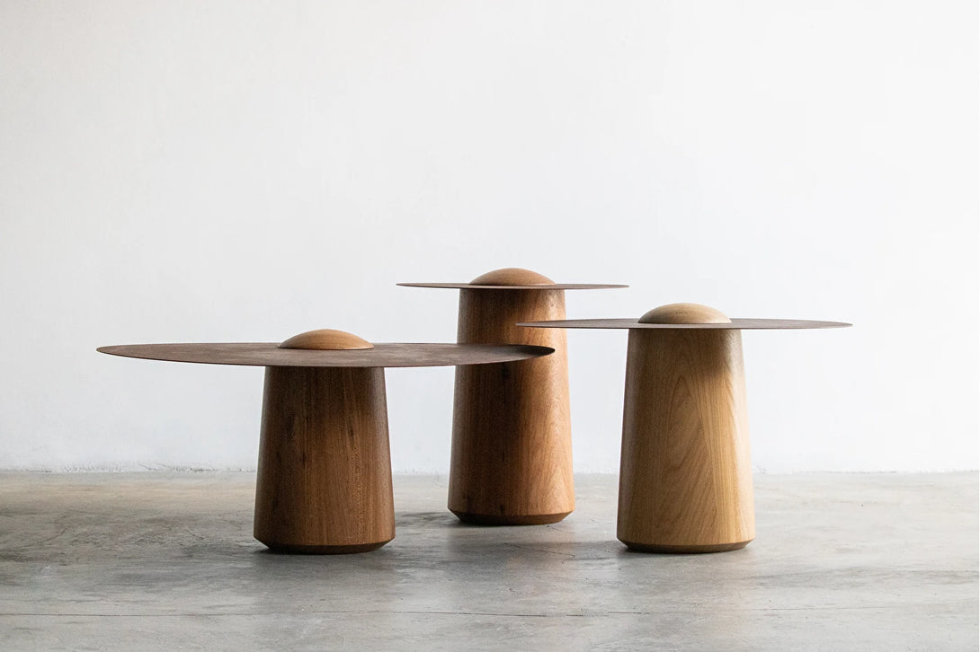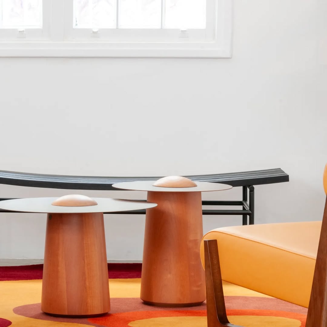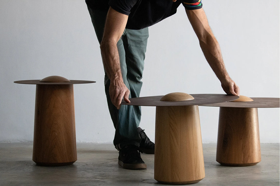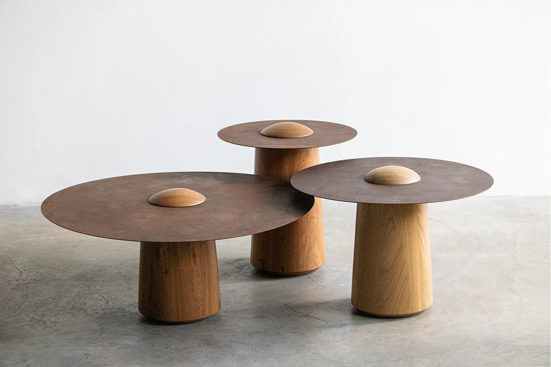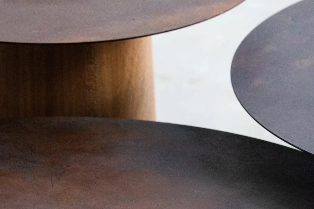 Apresentamos a Mesa de Centro Tempo Rei - Fabricada em madeira Cedro Rosa, Aço Corten e acabamento com verniz à base de água. Os diversos diâmetros e alturas permitem que seja utilizado em conjunto, formando uma grande mesa de centro para ambientes amplos, ou separadamente, cumprindo funções distintas.