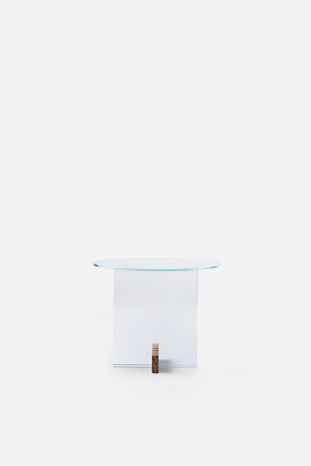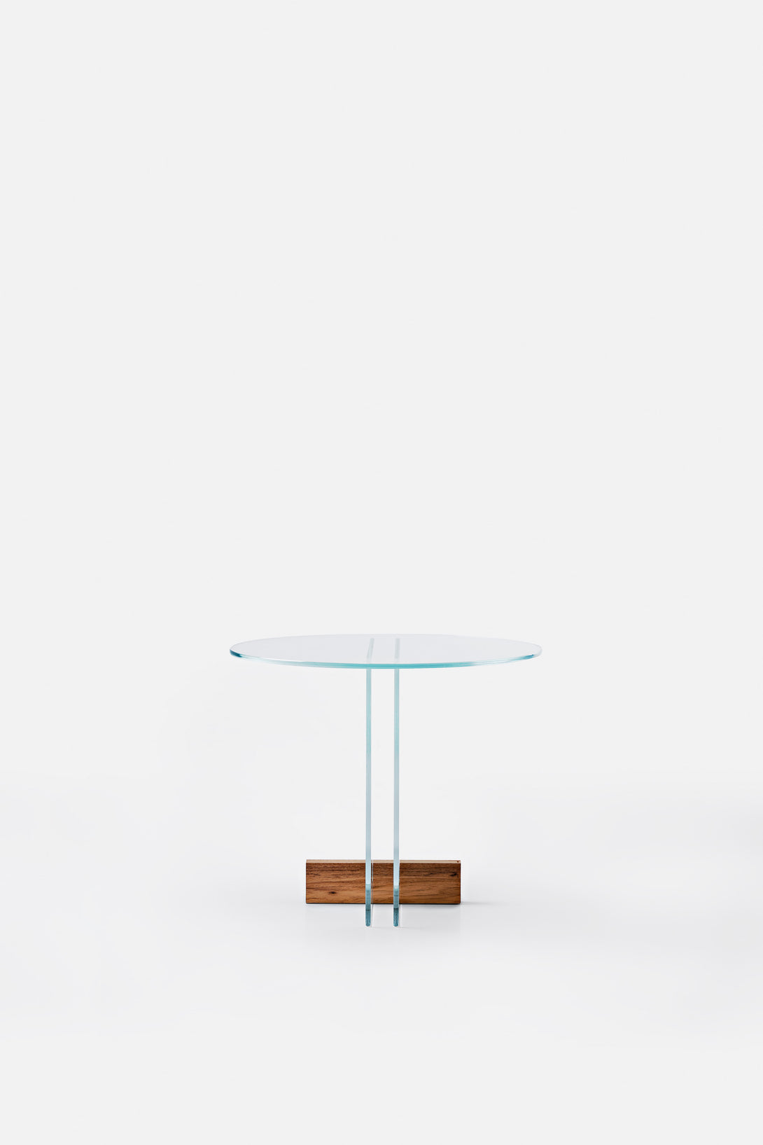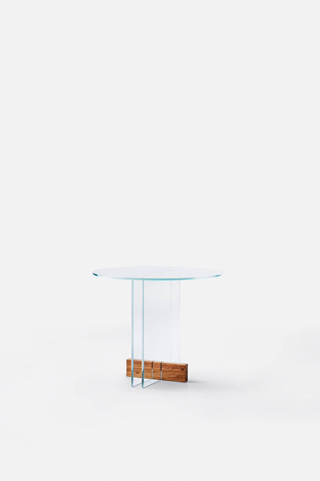 A busca constante pela leveza em diferentes formas levou a um novo projeto que tem o vidro como protagonista. A base de madeira funciona como uma cunha e explicita a relação entre os dois volumes - mesa e base - para o equilíbrio da peça. O contraste entre vidro e madeira - frio e quente, natural e artificial - também é explorado, buscando o equilíbrio entre as texturas e significados de cada material.