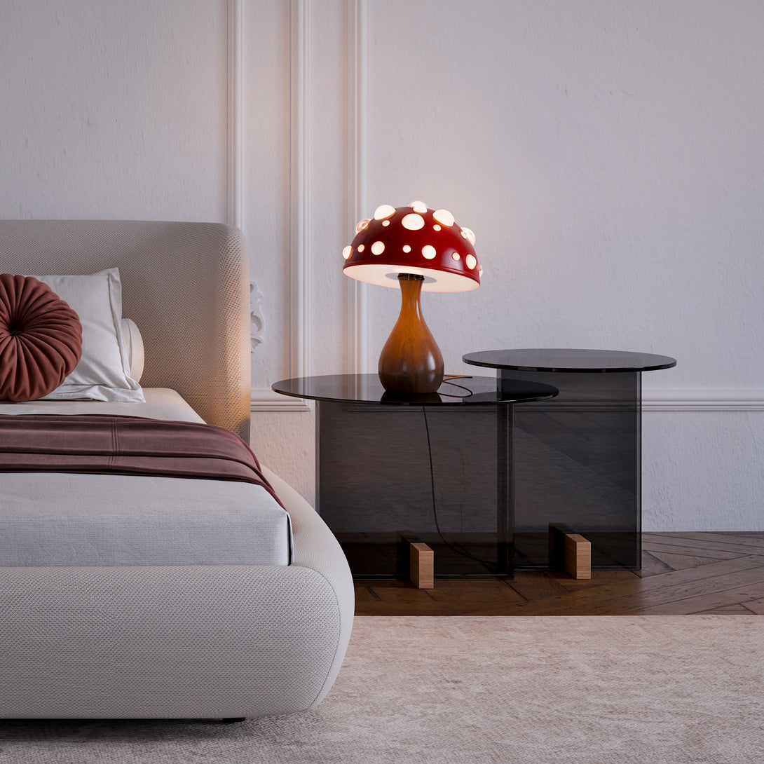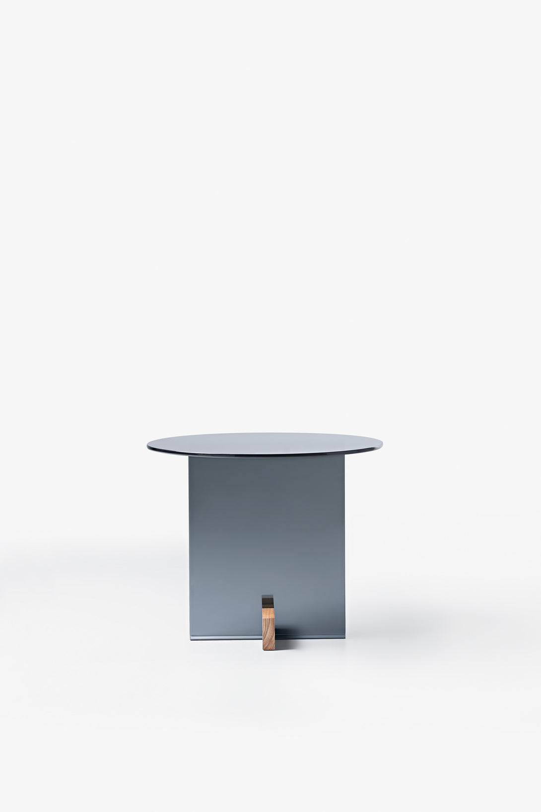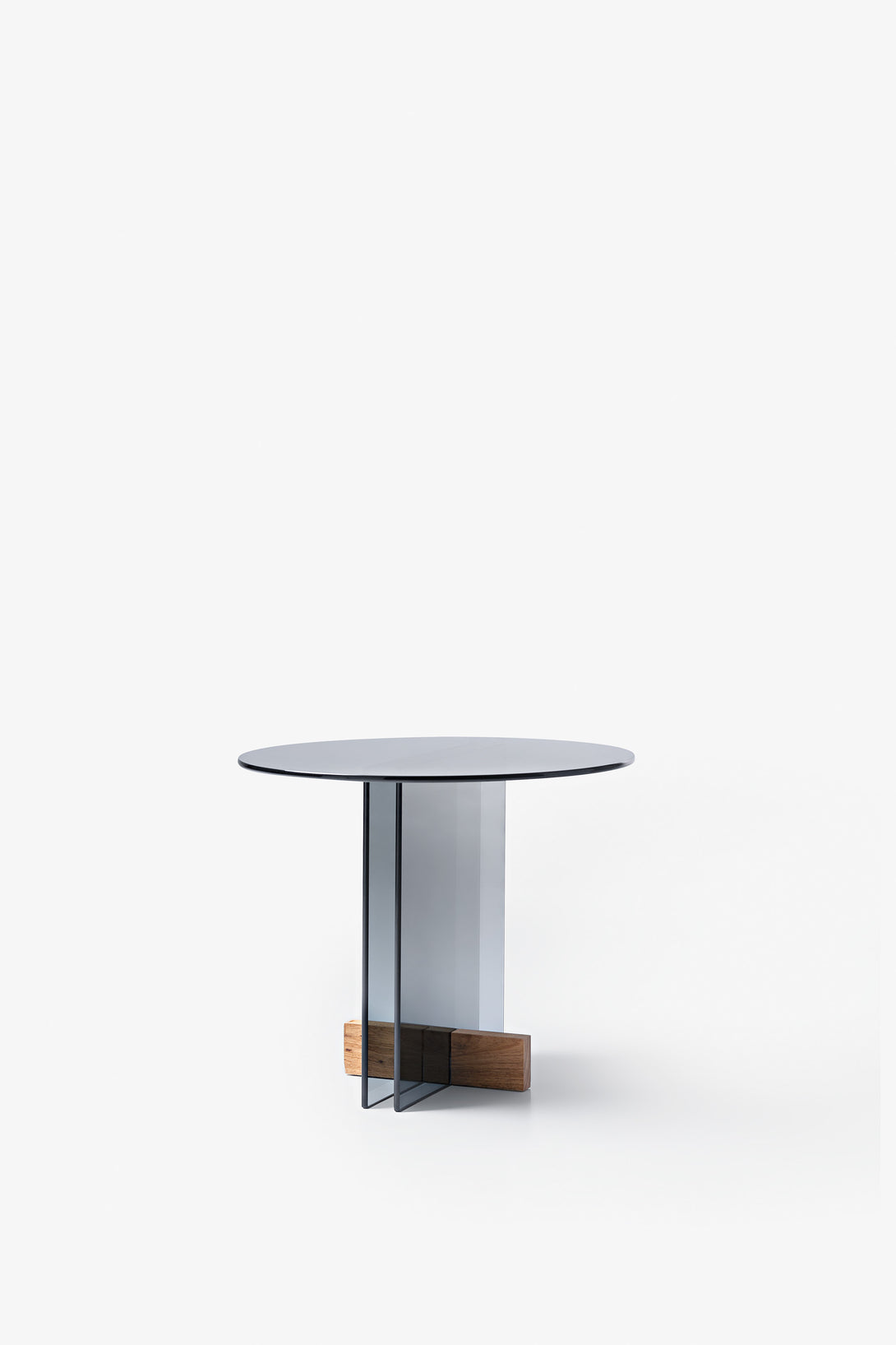 A busca constante pela leveza em diferentes formas levou a um novo projeto que tem o vidro como protagonista. A base de madeira funciona como uma cunha e explicita a relação entre os dois volumes - mesa e base - para o equilíbrio da peça. O contraste entre vidro e madeira - frio e quente, natural e artificial - também é explorado, buscando o equilíbrio entre as texturas e significados de cada material.